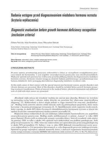 Streszczenia / Abstracts Badania wstępne przed diagnozowaniem niedoboru hormonu wzrostu (kryteria wykluczenia) Diagnostic evaluation before growth hormone deficiency recognition (exclusion criteria) Elżbieta Petriczko, Anita Horodnicka-Józwa, Mieczysław Walczak Klinika Pediatrii, Endokrynologii, Diabetologii, Chorób Metabolicznych i Kardiologii Wieku Rozwojowego, Pomorska Akademia Medyczna w Szczecinie Adres do korespondencji: Elżbieta Petriczko, Klinika Pediatrii, Endokrynologii, Diabetologii, Chorób Metabolicznych i Kardiologii Wieku Rozwojowego Pomorskiej Akademii Medycznej, ul. Unii Lubelskiej 1, 71-252 Szczecin, [email protected] Słowa kluczowe: niskorosłość u dzieci, niedobór endogennego hormonu wzrostu Key words: short stature, endogenous growth hormone deficiencye Streszczenie/Abstracts W pracy autorzy przedstawiają przyczyny niskorosłości u dzieci ze szczególnym uwzględnieniem przyczyn innych niż hormonalne, w tym zespołów uwarunkowanych genetycznie oraz chorób przewlekłych. Większość spośród nich powinna być wykluczona przed kwalifikacją dziecka do diagnozowania niedoboru hormonu wzrostu. Zwrócono również uwagę na elementy badania podmiotowego i przedmiotowego oraz badania dodatkowe, które pomagają ukierunkować diagnostykę niedoboru wysokości ciała. In this study causes of short stature with the special interest non hormonal reasons, genetic disorders and chronic diseases are presented. Most of this disorders should be excluded before growth hormone promoting treatment consideration. Points of interest in the medical history, physical examination end additional tests of child with short stature are presented. „Wysokość ciała niższa niż wysokość średnia nie zawsze jest chorobą. Różnice we wzroście są normalną cechą ludzi i zdrowe niskie dziecko nie powinno być obarczane nieprawidłową diagnozą” [1]. Niskorosłość u dzieci uległa jednak w ciągu ostatnich lat znacznej „medykalizacji”. Według wielu autorów zdrowe niskie dziecko stało się potencjalnym pacjentem, który może korzystać z leczenia promującego wzrastanie [2, 3]. Opublikowano wiele raportów medycznych, które szacują, że około 40% dzieci leczonych rekombinowanym hormonem wzrostu w istocie nie spełnia kryteriów somatotropinowej niedoczynności przysadki [4]. Większość dzieci niskorosłych nie jest dotknięta zaburzeniami hormonalnymi czy zespołami uwarunkowanymi genetycznie. Według analiz publikowanych w piśmie „Lancet” w roku 2004 przez Dattani i Preece jeśli za niskorosłe uznamy wszystkie dzieci, których wysokość ciała mieści się poniżej -2SD, to tylko u około 14% spośród nich niskorosłość ma podłoże patologiczne. Jeśli próg ten przesuniemy na -3SD, wówczas niskorosłość jest spowodowana przyczyną patologiczną w około 58% przypadków [5]. Sultan i wsp. w roku 2008 dokonali retrospektywnej oceny przyczyn niskorosłości u 214 pacjentów kierowanych w celu diagnostyki przyczyn niskiego wzrostu. Spośród tej grupy największy odsetek stanowiły dzieci, u których rozpoznano konstytucjonalnie wolne tempo wzrostu i rozwoju (KOWR) lub rodzinnie niski wzrost (37,4%). U 46,7% chorych ni13 Endokrynol. Ped., vol. 9/2009, Suplement nr 1 ski wzrost był spowodowany przyczynami innymi niż hormonalne, a tylko u 15,9% potwierdzono istnienie zaburzeń hormonalnych. Niedobór endogennego hormonu wzrostu stwierdzono jedynie u 6,1% chorych, co stanowiło około 38 % wszystkich hormonalnych przyczyn niskiego wzrostu w tej grupie dzieci [6]. Jedno z największych badań populacyjnych dotyczących oceny przyczyn niskorosłości u dzieci opublikowano na podstawie analizy przeprowadzonej w stanie Utah (USA). Lindsay i wsp. ocenili wysokość ciała i tempo wzrastania u niemal 115 tys. amerykańskich dzieci. Wśród 555 dzieci, które zakwalifikowali oni jako niskorosłe (wysokość ciała poniżej 3 centyla i tempo wzrastania poniżej 5 cm rocznie), tylko u 5% rozpoznano zaburzenia hormonalne. Nadmienić jednak należy, że w tej ogromnej grupie znalazły się również dzieci z nierozpoznanym i nieleczonym niedoborem GH i zespołem Turnera (48% spośród wszystkich dzieci z zespołem Turnera i niedoborem GH w tej grupie). Mimo zatem, iż rodzice często podejrzewają, że niskorosłość ich dziecka ma podłoże endokrynne, to przyczyny te według badania w Utah w 95% nie są pochodzenia hormonalnego [7]. Zanim więc rozpoczniemy diagnostykę hormonalnych przyczyn niskorosłości, w szczególności zaś zaburzeń wydzielania i funkcji hormonu wzrostu, powinniśmy przeprowadzić szczegółową ocenę wykluczającą inne, zwykle częstsze przyczyny niedoboru wysokości ciała. Z drugiej zaś strony w szeregu schorzeń przewlekłych i niektórych zespołach genetycznie uwarunkowanych, mimo iż niskorosłość nie jest wywołana nieprawidłowym wydzielaniem GH podejmowane są próby zastosowania terapii rekombinowanym GH, w celu poprawy prognozy wzrostu ostatecznego. Zatem nie stanowią już one bezwzględnego przeciwwskazania do terapii hormonem wzrostu. Najczęstsze przyczyny niskiego wzrostu u dzieci przedstawiono w tabeli I. Tabela I. Przyczyny niskorosłości Table I. Reasons of short stature 1. Warianty fizjologii • konstytucjonalnie wolne tempo wzrostu i rozwoju • rodzinnie niski wzrost 2. Wewnątrzmaciczne zahamowanie wzrastania • z cechami dysmorfii • bez cech dysmorfii 3. Choroby przewlekłe • choroby układu sercowo-naczyniowego, np. wrodzone sinicze wady serca • choroby nerek , np. przewlekła niewydolność nerek, tubulopatie nerkowe • choroby układu oddechowego, np.: astma oskrzelowa o ciężkim przebiegu, mukowiscydoza • choroby przewodu pokarmowego, np. choroba trzewna, choroba Leśniowskiego- Crohna • choroby OUN, np. guzy mózgu • stany deprywacji emocjonalnej, choroba sieroca, zaburzenia odżywiania o typie jadłowstrętu psychicznego 4. Schorzenia hormonalne • niedoczynność tarczycy a)