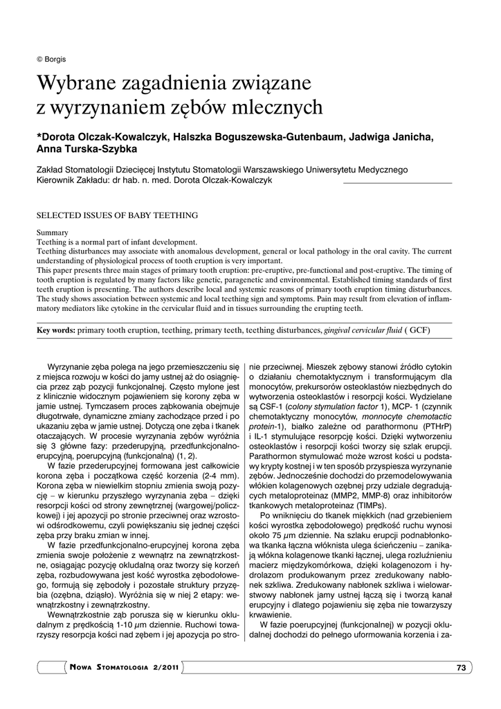© Borgis Wybrane zagadnienia związane z wyrzynaniem zębów mlecznych *Dorota Olczak-Kowalczyk, Halszka Boguszewska-Gutenbaum, Jadwiga Janicha, Anna Turska-Szybka Zakład Stomatologii Dziecięcej Instytutu Stomatologii Warszawskiego Uniwersytetu Medycznego Kierownik Zakładu: dr hab. n. med. Dorota Olczak-Kowalczyk Selected issues of baby teething Summary Teething is a normal part of infant development. Teething disturbances may associate with anomalous development, general or local pathology in the oral cavity. The current understanding of physiological process of tooth eruption is very important. This paper presents three main stages of primary tooth eruption: pre-eruptive, pre-functional and post-eruptive. The timing of tooth eruption is regulated by many factors like genetic, paragenetic and environmental. Established timing standards of first teeth eruption is presenting. The authors describe local and systemic reasons of primary tooth eruption timing disturbances. The study shows association between systemic and local teething sign and symptoms. Pain may result from elevation of inflammatory mediators like cytokine in the cervicular fluid and in tissues surrounding the erupting teeth. Key words: primary tooth eruption, teething, primary teeth, teething disturbances, gingival cervicular fluid ( GCF) Wyrzynanie zęba polega na jego przemieszczeniu się z miejsca rozwoju w kości do jamy ustnej aż do osiągnięcia przez ząb pozycji funkcjonalnej. Często mylone jest z klinicznie widocznym pojawieniem się korony zęba w jamie ustnej. Tymczasem proces ząbkowania obejmuje długotrwałe, dynamiczne zmiany zachodzące przed i po ukazaniu zęba w jamie ustnej. Dotyczą one zęba i tkanek otaczających. W procesie wyrzynania zębów wyróżnia się 3 główne fazy: przederupyjną, przedfunkcjonalnoerupcyjną, poerupcyjną (funkcjonalną) (1, 2). W fazie przederupcyjnej formowana jest całkowicie korona zęba i początkowa część korzenia (2-4 mm). Korona zęba w niewielkim stopniu zmienia swoją pozycję – w kierunku przyszłego wyrzynania zęba – dzięki resorpcji kości od strony zewnętrznej (wargowej/policzkowej) i jej apozycji po stronie przeciwnej oraz wzrostowi odśrodkowemu, czyli powiększaniu się jednej części zęba przy braku zmian w innej. W fazie przedfunkcjonalno-erupcyjnej korona zęba zmienia swoje położenie z wewnątrz na zewnątrzkostne, osiągając pozycję okludalną oraz tworzy się korzeń zęba, rozbudowywana jest kość wyrostka zębodołowego, formują się zębodoły i pozostałe struktury przyzębia (ozębna, dziąsło). Wyróżnia się w niej 2 etapy: wewnątrzkostny i zewnątrzkostny. Wewnątrzkostnie ząb porusza się w kierunku okludalnym z prędkością 1-10 µm dziennie. Ruchowi towarzyszy resorpcja kości nad zębem i jej apozycja po stro- N OWA S TOMATOLOGIA 2/2011 nie przeciwnej. Mieszek zębowy stanowi źródło cytokin o działaniu chemotaktycznym i transformującym dla monocytów, prekursorów osteoklastów niezbędnych do wytworzenia osteoklastów i resorpcji kości. Wydzielane są CSF-1 (colony stymulation factor 1), MCP- 1 (czynnik chemotaktyczny monocytów, monnocyte chemotactic protein-1), białko zależne od parathormonu (PTHrP) i IL-1 stymulujące resorpcję kości. Dzięki wytworzeniu osteoklastów i resorpcji kości tworzy się szlak erupcji. Parathormon stymulować może wzrost kości u podstawy krypty kostnej i w ten sposób przyspiesza wyrzynanie zębów. Jednocześnie dochodzi do przemodelowywania włókien kolagenowych ozębnej przy udziale degradujących metaloproteinaz (MMP2, MMP-8) oraz inhibitorów tkankowych metaloproteinaz (TIMPs). Po wniknięciu do tkanek miękkich (nad grzebieniem kości wyrostka zębodołowego) prędkość ruchu wynosi około 75 µm dziennie. Na szlaku erupcji podnabłonkowa tkanka łączna włóknista ulega ścieńczeniu – zanikają włókna kolagenowe tkanki łącznej, ulega rozluźnieniu macierz międzykomórkowa, dzięki kolagenozom i hydrolazom produkowanym przez zredukowany nabłonek szkliwa. Zredukowany nabłonek szkliwa i wielowarstwowy nabłonek jamy ustnej łączą się i tworzą kanał erupcyjny i dlatego pojawieniu się zęba nie towarzyszy krwawienie. W fazie poerupcyjnej (funkcjonalnej) w pozycji okludalnej dochodzi do pełnego uformowania korzenia i za- 73 Dorota Olczak-Kowalczyk i wsp. mknięcia otworu wierzchołkowego i zakończenia czynnego wyrzynania zęba. Najczęściej proces wyrzynania nie ma charakteru ciągłego, a etapom czynnej erupcji towarzyszą przerwy. Średni czas wyrzynania zęba, od momentu wyczuwania go przez tkankę dziąsła do całkowitego wyrznięcia korony, wynosił 2 miesiące (wahał się w granicach od 0,9 do 4,9 miesięcy). Średnie tempo erupcji wynosiło 0,7 mm na miesiąc (3). Proces wyrzynania zębów jest niezwykle złożony, uzależniony od wielu czynników: genetycznych, paragenetycznych i środowiskowych. Niejednokrotnie trudno jest określić przyczynę stwierdzanych nieprawidłowości procesu wyrzynania zębów. A jest to istotne, ponieważ zaburzenia ząbkowania mogą świadczyć o istnieniu procesu chorobowego czy wady genetycznej. Uważa się, że geny są odpowiedzialne w ponad 70% za przebieg wyrzynania zębów. W badaniach Hughes et al. udowodniono znaczenie kontroli genetycznej w wyrzynaniu zębów siecznych mlecznych, a rolę czynników środowiskowych określono wręcz jako marginalną (4). Wykazano, że czynnik genetyczny wyjaśnia zmienność czasu wyrzynania zębów siecznych mlecznych w granicach 82-94% u chłopców i 71-96% u dziewcząt. Analiza badań polskich autorów wykazuje utrzymywanie się terminów wyrzynania zębów mlecznych na przestrzeni blisko 30 lat. Termin rozpoczęcia ząbkowania rozpoczyna się w 2. lub 3. miesiącu a kończy w 14. miesiącu. Średni termin ukazania się pierwszego zęba wynosi 6,6 ± 2,09 (2005), 6,62 (1985), 7,3 miesiąca (1979). Czas, jaki upływa od ukazania się pierwszego zęba do pojawieni