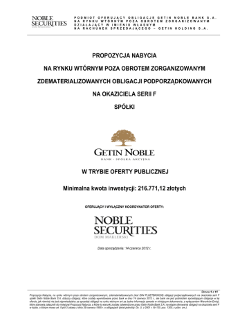 P N D N ODMIOT OFERUJĄCY A RYNKU WTÓRNYM ZIAŁAJĄCY W IMIEN A RACHUNEK SPRZE OBLIGACJE GETIN NOBLE BANK S.A. POZA OBROTEM ZORGANIZOWANYM IU WŁASNYM DAJĄCEGO – GETIN HOLDING S.A. PROPOZYCJA NABYCIA NA RYNKU WTÓRNYM POZA OBROTEM ZORGANIZOWANYM ZDEMATERIALIZOWANYCH OBLIGACJI PODPORZĄDKOWANYCH NA OKAZICIELA SERII F SPÓŁKI W TRYBIE OFERTY PUBLICZNEJ Minimalna kwota inwestycji: 216.771,12 złotych OFERUJĄCY I WYŁĄCZNY KOORDYNATOR OFERTY: Data sporządzenia: 14 czerwca 2012 r. Strona 1 z 11 Propozycja Nabycia, na rynku wtórnym poza obrotem zorganizowanym, zdematerializowanych (kod ISIN PLGETBK00038) obligacji podporządkowanych na okaziciela serii F spółki Getin Noble Bank S.A. dotyczy obligacji, które zostały wyemitowane przez bank w dniu 14 czerwca 2012 r., ale bank nie jest podmiotem sprzedającym obligacje w tej ofercie, jak równieŜ nie jest odpowiedzialny za sprzedaŜ obligacji na rynku wtórnym ani za Ŝadne informacje zawarte w niniejszym dokumencie, z wyłączeniem Warunków Emisji, które stanowią załącznik do niniejszej Propozycji Nabycia, a które to warunki zostały zatwierdzone przez Getin Noble Bank S.A. na etapie oferowania obligacji na okaziciela serii F w trybie, o którym mowa art. 9 pkt 3 ustawy z dnia 29 czerwca 1995 r. o obligacjach (tekst jednolity: Dz. U. z 2001 r. Nr 120, poz. 1300, z późn. zm.). P N D N ODMIOT OFERUJĄCY A RYNKU WTÓRNYM ZIAŁAJĄCY W IMIEN A RACHUNEK SPRZE OBLIGACJE GETIN NOBLE BANK S.A. POZA OBROTEM ZORGANIZOWANYM IU WŁASNYM DAJĄCEGO – GETIN HOLDING S.A. DEFINICJE O ile z treści niniejszej Propozycji Nabycia [„Propozycja Nabycia”] lub z kontekstu nie wynika wyraźnie inaczej, zastosowane w Propozycji Nabycia pojęcia pisane z wielkiej litery posiadają następujące znaczenie: „Cena SprzedaŜy Obligacji” „Dzień Emisji” „Dzień Płatności Odsetek” Płatności Odsetek” lub „Dzień Ustalenia Odsetek” „Dzień Ustalenia Praw” „Dzień Roboczy” „Dzień Wykupu” „Dzień Wcześniejszego Wykupu” „Inwestor” „KDPW” „Kwota Odsetek” „Kwota Wykupu" „MarŜa” „Obligacje” lub „Obligacja” „Obligatariusz” „Ogłoszona Stawka Referencyjna” „Okres Odsetkowy” „Prawo Bankowe” „Warunki Emisji” „Dni oznacza cenę sprzedaŜy jednej sztuki Obligacji w dniu rozliczenia transakcji sprzedaŜy Obligacji na rynku wtórnym poza obrotem zorganizowanym; oznacza 14 czerwca 2012 r.; oznaczają dni: 14 grudnia 2012 r., 14 czerwca 2013 r., 16 grudnia 2013 r., 16 czerwca 2014 r., 15 grudnia 2014 r., 15 czerwca 2015 r., 14 grudnia 2015 r., 14 czerwca 2016 r., 14 grudnia 2016 r., 14 czerwca 2017 r; 14 grudnia 2017 r., 14 czerwca 2018 r. oznacza dzień przypadający na dwa Dni Robocze przed rozpoczęciem danego Okresu Odsetkowego; oznacza szósty Dzień Roboczy przed odpowiednio Dniem Wykupu, Dniem Płatności Odsetek lub Dniem Wcześniejszego Wykupu lub inny dzień określony zgodnie z aktualnie obowiązującymi regulacjami KDPW; oznacza kaŜdy dzień inny niŜ sobota, niedziela lub dzień ustawowo wolny od pracy, w którym KDPW prowadzi normalną działalność operacyjną; oznacza 14 czerwca 2018 r.; oznacza dzień określony w Warunkach Emisji jako dzień, w którym Getin Noble Bank S.A., jako emitent Obligacji, moŜe dokonać przedterminowego wykupu Obligacji; oznacza osoby prawne, jednostki organizacyjne nie będące osobami prawnymi, jak równieŜ osoby fizyczne, którym przepisy prawa przyznają zdolność do czynności prawnych, które, przy zachowaniu wszystkich warunków określonych w Propozycji Nabycia mogą dokonać zakupu Obligacji na rynku wtórnym poza obrotem zorganizowanym na warunkach określonych w Propozycji Nabycia; oznacza Krajowy Depozyt Papierów Wartościowych S.A.; oznacza kwotę odsetek płatną przez Emitenta z tytułu Obligacji, obliczaną i wypłacaną zgodnie z postanowieniami Warunków Emisji; oznacza w odniesieniu do danej Obligacji kwotę naleŜności głównej, tj. kwotę równą wartości nominalnej Obligacji; oznacza 3,55 % w stosunku rocznym; oznacza podporządkowane obligacje na okaziciela serii F Getin Noble Bank S.A. o wartości nominalnej 1.000,00 złotych kaŜda, które są zdematerializowane i posiadają kod ISIN (PLGETBK00038) w Krajowym Depozycie Papierów Wartościowych S.A., a zostały wyemitowane na podstawie Warunków Emisji w trybie, o którym mowa art. 9 pkt 3 ustawy z dnia 29 czerwca 1995 r. o obligacjach (tekst jednolity: Dz. U. z 2001 r. Nr 120, poz. 1300, z późn. zm.); oznacza posiadacza Obligacji, którego prawa są zapisane na rachunku papierów wartościowych prowadzonym przez uprawniony podmiot; oznacza stawkę WIBOR (tj. Warsaw Interbank Offer Rate) ogłaszaną dla 6 – miesięcznych depozytów zbiorowych, ogłaszaną na stronie WIBO wyświetlanej przez Monitor Rates Services Reuters lub innej stronie, która ją zastąpi – stawka WIBOR 6M dla I Okresu Odsetkowego wynosi 5,1400 % w stosunku rocznym; oznacza okres rozpoczynający się w Dniu Emisji (włącznie) i kończący się w pierwszym Dniu Płatności Odsetek (z wyłączeniem tego dnia) oraz kaŜdy kolejny okres rozpoczynający się od danego Dnia Płatności Odsetek (włącznie) do kolejnego Dnia Płatności Odsetek (z wyłączeniem tego dnia), a ostatni Okres Odsetkowy kończyć się będzie w Dniu Wykupu lub odpowiednio w Dniu Wcześniejszego Wykupu lub innym dniu, w którym zobowiązanie do płatności Kwoty Wykupu stanie się wymagalne (wyłączając ten dzień); oznacza ustawę z dnia 27 sierpnia 1997 r. – Prawo bankowe (tekst jednolity: Dz. U. z 2002 r. Nr 72, poz. 665, z późn. zm.); oznacza warunki emisji Obligacji, stanowiące Załącznik nr 2 do Propozycji Nabycia. Załączniki do Propozycji Nabycia: 1. 2. Formularz Oferty Nabycia Obligacji – Załącznik nr 1, Warunki Emisji – Załącznik nr 2. Strona 2 z 11 Propozycja Nabycia, na rynku wtórnym poza obrotem zorganizowanym, zdematerializowanych (kod ISIN PLGETBK00038) obligacji podporządko