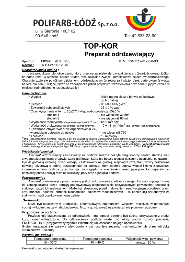 TOP-KOR Preparat odrdzewiający Symbol : Norma : PKWiU : 20.30.12.0; WTO-W-140: 2014 KTM : 131-7112-01-00-0-XX Charakterystyka ogólna : Jest produktem błonotwórczym, który przetwarza nietrwałe związki żelaza trójwartościowego (żółtobrunatna rdza) w stabilne, bardzo trudno rozpuszczalne związki kompleksowe żelaza dwuwartościowego. Charakteryzuje się potrójnym działaniem: odrdzewiającym (przetwarza i wiąże rdzę), barierowym (stwarza barierę dla tlenu i wilgoci przez co zabezpiecza przed przyszłym rdzewieniem) oraz penetrującym (wnika w miejsca trudnodostępne i zabezpiecza je). Dane techniczne : * Wygląd 1/ - lekko mętna ciecz o barwie od beżowej do brunatnej 3 * Gęstość - 0,950 ± 0,05 g/cm * Zawartość substancji stałych - 33 ± 2 % wag. o * Czas wysychania w temp. 20±2 C i wilgotności powietrza 55±5 % stopień 1 - nie więcej niż 30 min stopień 3 - nie więcej niż 60 min 2 3 * Wydajność teoretyczna /dla powłoki o grubości 15 µm/ - 12,5 m / dm 2 3 * Wydajność praktyczna (na podłożu skorodowanym) - 10 ÷ 11 m / dm /dla powłoki jednowarstwowej/ * Zawartość lotnych związków organicznych (LZO) /1 w produkcie gotowym do użytku - nie więcej niż 750 * Trwałość - 12 miesięcy Wg Rozporządzenia Ministra Rozwoju z dn. 08.08.2016 w sprawie ograniczenia emisji lotnych związków organicznych w niektórych farbach i lakierach przeznaczonych do malowania budynków i ich elementów wykończeniowych, wyposażeniowych oraz związanych z budynkami i tymi elementami konstrukcji oraz w mieszaninach do odnawiania pojazdów (Dz.U. poz.1353), Preparat odrdzewiający należy do Kategorii A/ podkategorii h /typu FR (farby rozpuszczalnikowe) o dopuszczalnej zawartości LZO - 750 g/dm3. Właściwości powłoki : Preparat odrdzewiający zastosowany na podłoża żelazne pokryte rdzą stworzy bardzo stabilną warstwę metaloorganiczną o barwie szaro-grafitowej, która nie będzie ulegała dalszemu utlenianiu, co gwarantuje długotrwałą ochronę przed korozją. Zastosowany na gładką, niepokrytą rdzą stal utworzy bezbarwną powłokę lakierową o dobrej przyczepności do podłoża, która odetnie dopływ wilgoci i tlenu z powietrza i czasowo ochroni podłoże przed korozją. Ze względu na właściwości penetrujące powłoka preparatu zabezpieczy przed korozją również szczeliny, pory oraz pęknięcia podłoża. Przeznaczenie : Preparat odrdzewiający przeznaczony jest do odrdzewiania (zwłaszcza miejsc trudnodostępnych) oraz do zabezpieczania przed korozją podpowłokową niedostatecznie oczyszczonych powierzchni konstrukcji stalowych przed ich malowaniem. Może być stosowany przed malowaniem renowacyjnym ogrodzeń, bram, krat, barierek, dachów, obróbek blacharskich, pojazdów mechanicznych i in. konstrukcji wykonanych ze stali (w tym stali ocynkowanej) oraz żeliwa. Środowisko : Może być stosowany w środowisku przemysłowym, nadmorskim, wiejskim, miejskim, w atmosferze suchej i wilgotnej, na zewnątrz budynków. Można go stosować na powierzchnie pionowe i poziome. Przygotowanie podłoża: Powierzchnie przeznaczone do odrdzewienia i impregnacji powinny być suche, oczyszczone z brudu, kurzu oraz odtłuszczone. Do odtłuszczenia podłoża może być użyty wodny roztwór preparatu EMULSOL RN-1 (przygotowany zgodnie z instrukcją umieszczoną na jego opakowaniu). Grube, łuszczące się warstwy rdzy powinny być usunięte ręcznie, mechanicznie lub przez obróbkę strumieniowo – ścierną. Warunki malowania : Temperatura prepartatu o 10 ÷ 30 C Temperatura podłoża o 10 ÷ 40 C Preparat przed użyciem dokładnie wymieszać. Wilgotność wzgl. powietrza najwyżej 80 % Sposób aplikacji : Nakładać: - pędzlem - natryskiem - metodą zanurzeniową (drobne elementy) W przypadku odrdzewiania powierzchni porowatych Preparat można rozcieńczyć Rozcieńczalnikiem do wyrobów poliwinylowych i chlorokauczukowych ogólnego stosowania w ilości - do 5 % obj. Rozcieńczalnik /zmywacz/ : Rozcieńczalnik do wyrobów poliwinylowych i chlorokauczukowych ogólnego stosowania (KTM: 1318157-01-01). Czas sezonowania powłoki przed nałożeniem następnej warstwy : Stosować, w zależności od potrzeb 1 ÷ 3 warstw preparatu. Drugą i następne warstwy nakładać metodą „mokro na mokro” tj. w odstępach 10 ÷ 30 min. lub po dłuższym, uzależnionym od warunków aplikacji czasie. Dla odrdzewienia powierzchni pokrytej cienką warstwą rdzy (w tym rdzy nalotowej) wystarczy nałożyć jedną warstwę . W przypadku grubszych warstw rdzy lub dla zaimpregnowania głębokich szczelin należy preparat zaaplikować dwu- lub trzykrotnie. Następne operacje na zaimpregnowanym podłożu np. malowanie renowacyjne można wykonywać po upływie co najmniej 12 godzin. Tworzenie zestawu z innymi produktami malarskimi: Preparat odrdzewiający może być stosowany samodzielnie jako zabezpieczenie czasowe stali. Samodzielna powłoka impregnatu może być eksploatowana na powietrzu w czasie do 3 miesięcy. Dla długotrwałego zabezpieczenia stali przed korozją, na odrdzewione impregnatem podłoże, docelowo należy zastosować pełen system malarski (tj. farbę antykorozyjną do gruntowania i farbę nawierzchniową). Preparat odrdzewiający może być stosowany w zestawie z: - farbą poliwinylową do gruntowania przeciwrdzewną LOWIKOR-2 - farbą poliwinylową do gruntowania przeciwrdzewną tiksotropową TIXOKOR-G2 - farbą poliwinylową do gruntowania chemoodporną LOWICHEM-F - farbą poliwinylową do gruntowania dla motoryzacji do natrysku elektrostatycznego - farbą poliwinylową nawierzchniową do krat i ogrodzeń LOWIGRAF oraz strukturalną LOWIGRAF - farbą do malowania powierzchni ocynkowanych LOWICYN oraz strukturalną LOWICYN - farbą do malowania powierzchni ocynkowanych LOWICYN-Sx - farbą poliwinylowo-akrylową nawierzchniową tiksotropową LOWISTAL - emalią poliuretanową na metale dwuskladniową LOWIGRAF-PUR oraz strukturalną LOWIGRAF-PUR Powierzchnie pok