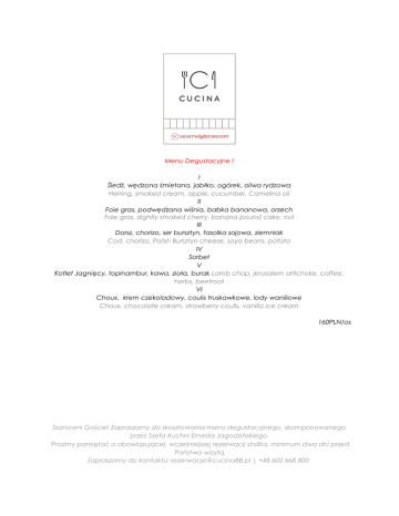 Menu Degustacyjne I I Śledź, wędzona śmietana, jabłko, ogórek, oliwa rydzowa Herring, smoked cream, apple, cucumber, Camelina oil II Foie gras, podwędzana wiśnia, babka bananowa, orzech Foie gras, slightly smoked cherry, banana pound cake, nut III Dorsz, chorizo, ser bursztyn, fasolka sojowa, ziemniak Cod, chorizo, Polish Bursztyn cheese, soya beans, potato IV Sorbet V Kotlet Jagnięcy, topinambur, kawa, zioła, burak Lamb chop, jerusalem artichoke, coffee, herbs, beetroot VI Choux, krem czekoladowy, coulis truskawkowe, lody waniliowe Choux, chocolate cream, strawberry coulis, vanilla ice cream 160PLN/os Szanowni Goście! Zapraszamy do skosztowania menu degustacyjnego, skomponowanego przez Szefa Kuchni Ernesta Jagodzińskiego. Prosimy pamiętać o obowiązującej, wcześniejszej rezerwacji stolika, minimum dwa dni przed Państwa wizytą. Zapraszamy do kontaktu: [email protected] | +48 602 668 800