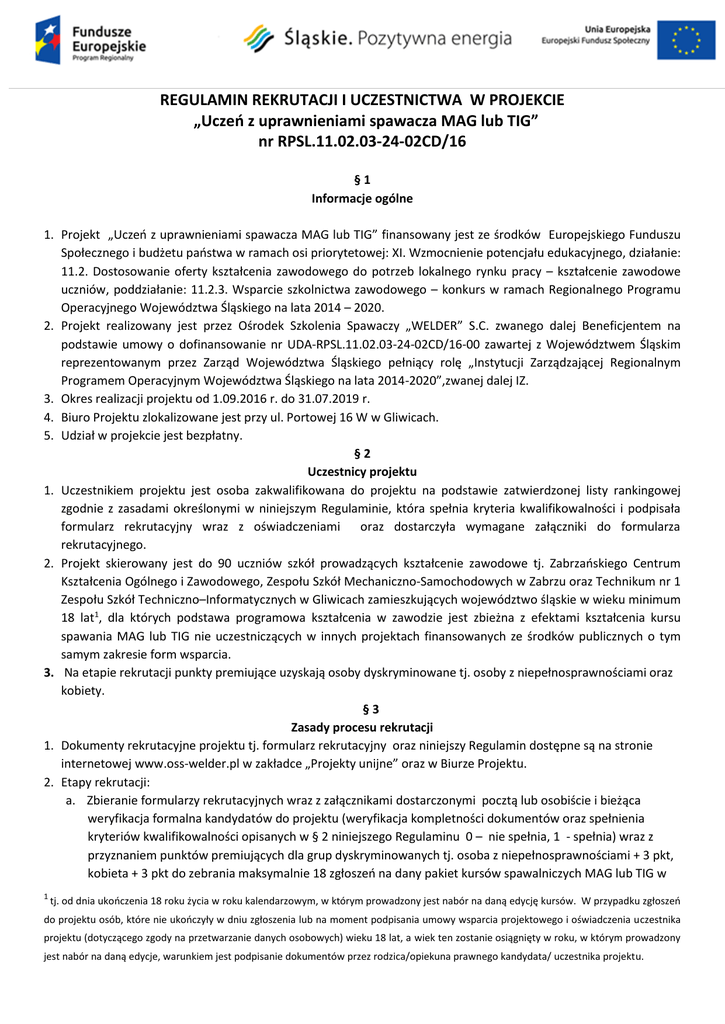 REGULAMIN REKRUTACJI I UCZESTNICTWA W PROJEKCIE „Uczeń z uprawnieniami spawacza MAG lub TIG” nr RPSL.11.02.03-24-02CD/16 §1 Informacje ogólne 1. Projekt „Uczeń z uprawnieniami spawacza MAG lub TIG” finansowany jest ze środków Europejskiego Funduszu Społecznego i budżetu państwa w ramach osi priorytetowej: XI. Wzmocnienie potencjału edukacyjnego, działanie: 11.2. Dostosowanie oferty kształcenia zawodowego do potrzeb lokalnego rynku pracy – kształcenie zawodowe uczniów, poddziałanie: 11.2.3. Wsparcie szkolnictwa zawodowego – konkurs w ramach Regionalnego Programu Operacyjnego Województwa Śląskiego na lata 2014 – 2020. 2. Projekt realizowany jest przez Ośrodek Szkolenia Spawaczy „WELDER” S.C. zwanego dalej Beneficjentem na podstawie umowy o dofinansowanie nr UDA-RPSL.11.02.03-24-02CD/16-00 zawartej z Województwem Śląskim reprezentowanym przez Zarząd Województwa Śląskiego pełniący rolę „Instytucji Zarządzającej Regionalnym Programem Operacyjnym Województwa Śląskiego na lata 2014-2020”,zwanej dalej IZ. 3. Okres realizacji projektu od 1.09.2016 r. do 31.07.2019 r. 4. Biuro Projektu zlokalizowane jest przy ul. Portowej 16 W w Gliwicach. 5. Udział w projekcie jest bezpłatny. §2 Uczestnicy projektu 1. Uczestnikiem projektu jest osoba zakwalifikowana do projektu na podstawie zatwierdzonej listy rankingowej zgodnie z zasadami określonymi w niniejszym Regulaminie, która spełnia kryteria kwalifikowalności i podpisała formularz rekrutacyjny wraz z oświadczeniami oraz dostarczyła wymagane załączniki do formularza rekrutacyjnego. 2. Projekt skierowany jest do 90 uczniów szkół prowadzących kształcenie zawodowe tj. Zabrzańskiego Centrum Kształcenia Ogólnego i Zawodowego, Zespołu Szkół Mechaniczno-Samochodowych w Zabrzu oraz Technikum nr 1 Zespołu Szkół Techniczno–Informatycznych w Gliwicach zamieszkujących województwo śląskie w wieku minimum 18 lat1, dla których podstawa programowa kształcenia w zawodzie jest zbieżna z efektami kształcenia kursu spawania MAG lub TIG nie uczestniczących w innych projektach finansowanych ze środków publicznych o tym samym zakresie form wsparcia. 3. Na etapie rekrutacji punkty premiujące uzyskają osoby dyskryminowane tj. osoby z niepełnosprawnościami oraz kobiety. §3 Zasady procesu rekrutacji 1. Dokumenty rekrutacyjne projektu tj. formularz rekrutacyjny oraz niniejszy Regulamin dostępne są na stronie internetowej www.oss-welder.pl w zakładce „Projekty unijne” oraz w Biurze Projektu. 2. Etapy rekrutacji: a. Zbieranie formularzy rekrutacyjnych wraz z załącznikami dostarczonymi pocztą lub osobiście i bieżąca weryfikacja formalna kandydatów do projektu (weryfikacja kompletności dokumentów oraz spełnienia kryteriów kwalifikowalności opisanych w § 2 niniejszego Regulaminu 0 – nie spełnia, 1 - spełnia) wraz z przyznaniem punktów premiujących dla grup dyskryminowanych tj. osoba z niepełnosprawnościami + 3 pkt, kobieta + 3 pkt do zebrania maksymalnie 18 zgłoszeń na dany pakiet kursów spawalniczych MAG lub TIG w 1 tj. od dnia ukończenia 18 roku życia w roku kalendarzowym, w którym prowadzony jest nabór na daną edycję kursów. W przypadku zgłoszeń do projektu osób, które nie ukończyły w dniu zgłoszenia lub na moment podpisania umowy wsparcia projektowego i oświadczenia uczestnika projektu (dotyczącego zgody na przetwarzanie danych osobowych) wieku 18 lat, a wiek ten zostanie osiągnięty w roku, w którym prowadzony jest nabór na daną edycje, warunkiem jest podpisanie dokumentów przez rodzica/opiekuna prawnego kandydata/ uczestnika projektu. każdej z 3 rund rekrutacyjnych. Nie spełnienie kryteriów kwalifikowalności uniemożliwia udział w kolejnych etapach rekrutacji. b. Udział w doradztwie edukacyjno-zawodowym max. 36 kandydatów/ek (średnio 18 kandydatów na kursy MAG lub TIG) zakwalifikowanych do etapu II rekrutacji celem oceny przez doradcę zawodowego oraz doradcę –specjalistę w zawodzie spawacza predyspozycji ucznia do wykonywania zawodu, cech psychofizycznych pod kątem przydatności kursu w kontekście planów edukacyjno-zawodowych ucznia, oceny kompetencji kluczowych do wykonywania zawodu spawacza, komplementarności z zawodem będącym przedmiotem kształcenia w szkole, mobilizacji do podjęcia kursu zgodnie z punktacją od 0 do 5 pkt przyznawanych przez każdego z doradców. c. Tworzenie list rankingowych i wybór 30 uczestników projektu, którzy uzyskali największą liczbę punktów w całym procesie rekrutacji w rundzie rekrutacyjnej w danym roku naboru. 3. Rekrutacja prowadzona będzie w trzech rundach rekrutacyjnych: od 15 września do 23 października w każdym roku: 2016, 2017 i 2018 lub do zebrania max. 18 zgłoszeń na każdy z pakietów kursów MAG lub TIG w danym roku, które przejdą pozytywnie ocenę formalną. 4. Doradca zawodowy oraz doradca - specjalista w zawodzie na podstawie Karty Oceny Kandydata dokona ostatecznego wyboru 30 uczestników projektu z największą liczbą punktów uzyskanych na etapie rekrutacji spośród max. 36 kandydatów do projektu w danej rundzie rekrutacyjnej. 5. Wyłonionych 30 kandydatów do projektu przejdzie obowiązkowe badania lekarskie. 6. Do projektu zakwalifikowanych zostanie łącznie 30 uczniów z największą liczbą punktów i pozytywnym wynikiem badań lekarskich. 7. W przypadku takiej samej ilości punktów kryterium decydującym będzie kolejność zgłoszenia do projektu. 8. Osoby niezakwalifikowane do projektu zostaną umieszczone na liście rezerwowej w kolejności uzyskanych punktów na etapie rekrutacji począwszy od osoby, która uzyskała najwięcej punktów. 9. Kwalifikowalność uczestnika do projektu jest potwierdzana bezpośrednio przed udzieleniem pierwszej formy wsparcia w ramach projektu tj. przed przystąpieniem do kursu spawalniczego na podstawie oświadczenia o potwierdzeniu spełnienia kryteriów kwalifikowalności wskazanych w Formularzu Rekru