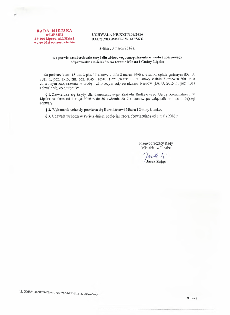 Uchwała Nr XXII/169/2016 Rady Miejskiej w LIpsku z