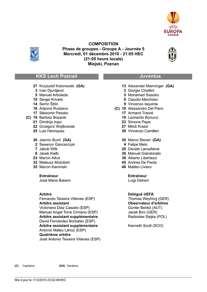 COMPOSITION Phase de groupes - Groupe A - Journée 5 Mercredi, 01 décembre 2010 - 21:05 HEC (21:05 heure locale) Miejski, Poznan KKS Lech Poznań 27 3 5 10 14 16 17 (C) 19 21 22 25 30 2 7 8 23 32 35 (C) Capitaine Krzysztof Kotorowski (GA) Ivan Djurdjević Manuel Arboleda Sergei Krivets Semir Štilić Artjoms Rudņevs Sławomir Peszko Bartosz Bosacki Dimitrije Injac Grzegorz Wojtkowiak Luis Henriquez Jasmin Burić (GA) Seweryn Gancarczyk Jakub Wilk Jacek Kiełb Marcin Kikut Mateusz Możdżeń Marcin Kamiński Juventus 13 3 5 8 9 (C) 10 17 19 23 27 39 30 4 20 36 38 45 46 Alexander Manninger (GA) Giorgio Chiellini Mohamed Sissoko Claudio Marchisio Vincenzo Iaquinta Alessandro Del Piero Armand Traoré Leonardo Bonucci Simone Pepe Miloš Krasić Vincenzo Camilleri Marco Storari (GA) Felipe Melo Davide Lanzafame Manuel Giandonato Alberto Libertazzi Andrea De Paola Matteo Liviero Entraîneur José Maria Bakero Entraîneur Luigi Delneri Arbitre Fernando Teixeira Vitienes (ESP) Arbitre assistant Victoriano Diaz Casado (ESP) Manuel Angel Torre Cimiano (ESP) Arbitre assistant supplémentaire David Fernández Borbalán (ESP) Arbitre assistant supplémentaire Antonio Mateu Lahoz (ESP) Quatrième arbitre José Antonio Teixeira Vitienes (ESP) Délégué UEFA Thomas Weyhing (GER) Observateur d'arbitres Günter Benkö (AUT) Jacek Birn (GER) Radoslaw Siejka (POL) (GA) Gardiens Mis à jour le 1/12/2010 23:02:45HEC Kenneth Scott (SCO)