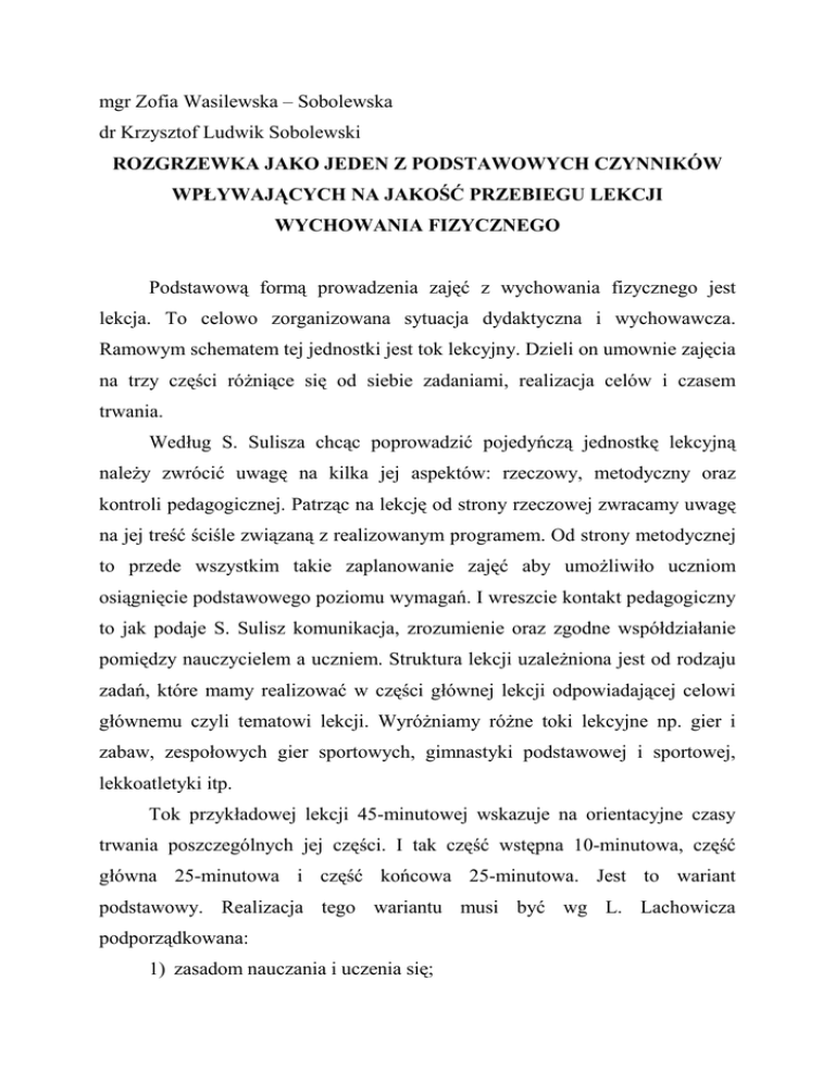 mgr Zofia Wasilewska – Sobolewska dr Krzysztof Ludwik Sobolewski ROZGRZEWKA JAKO JEDEN Z PODSTAWOWYCH CZYNNIKÓW WPŁYWAJĄCYCH NA JAKOŚĆ PRZEBIEGU LEKCJI WYCHOWANIA FIZYCZNEGO Podstawową formą prowadzenia zajęć z wychowania fizycznego jest lekcja. To celowo zorganizowana sytuacja dydaktyczna i wychowawcza. Ramowym schematem tej jednostki jest tok lekcyjny. Dzieli on umownie zajęcia na trzy części różniące się od siebie zadaniami, realizacja celów i czasem trwania. Według S. Sulisza chcąc poprowadzić pojedyńczą jednostkę lekcyjną należy zwrócić uwagę na kilka jej aspektów: rzeczowy, metodyczny oraz kontroli pedagogicznej. Patrząc na lekcję od strony rzeczowej zwracamy uwagę na jej treść ściśle związaną z realizowanym programem. Od strony metodycznej to przede wszystkim takie zaplanowanie zajęć aby umożliwiło uczniom osiągnięcie podstawowego poziomu wymagań. I wreszcie kontakt pedagogiczny to jak podaje S. Sulisz komunikacja, zrozumienie oraz zgodne współdziałanie pomiędzy nauczycielem a uczniem. Struktura lekcji uzależniona jest od rodzaju zadań, które mamy realizować w części głównej lekcji odpowiadającej celowi głównemu czyli tematowi lekcji. Wyróżniamy różne toki lekcyjne np. gier i zabaw, zespołowych gier sportowych, gimnastyki podstawowej i sportowej, lekkoatletyki itp. Tok przykładowej lekcji 45-minutowej wskazuje na orientacyjne czasy trwania poszczególnych jej części. I tak część wstępna 10-minutowa, część główna 25-minutowa i część końcowa 25-minutowa. Jest to wariant podstawowy. Realizacja tego wariantu musi być wg L. Lachowicza podporządkowana: 1) zasadom nauczania i uczenia się; 2) zasadom doboru treści oraz organizacji kształcenia i wychowania; 3) zasadom fizjologicznym budowy lekcji, czyli wszechstronności, zmienności pracy mięśniowej i racjonalnego natężenia wysiłku (patrz krzywa natężenia wg prof. T. Maszczaka). W tym miejscu możemy za S. Strzyżewskim przypomnieć siedem głównych elementów, które powinny wystąpić na każdej prawidłowo przeprowadzonej lekcji bez względu na jej charakter, są to: • zorganizowanie grupy i sprawdzenie gotowości do zajęć; • motywacja (czyli: po co, dlaczego, w jakim celu); • wszechstronna rozgrzewka z działaniem profilaktyczno – korekcyjnym; • realizacja głównych celów lekcji (kształcący, poznawczy, wychowawczy); • uspokojenie organizmu; • czynności porządkowe i podsumowanie lekcji; • zachęcenie uczniów do wykonywania działań ruchowych jako zdrowego stylu życia w rodzinie. Rozwijając za S. Strzyżewskim i L. Lachowiczem w części wstępnej wyróżniamy trzy zadania: 1) organizacja i zdyscyplinowanie grupy; 2) psychiczne nastawienie uczniów do zadań lekcji; 3) wszechstronne przygotowanie fizyczne. Wymienione powyżej elementy części wstępnej warunkują jej przebieg i wykonanie wszystkich zawartych w tej części zadań tak istotnych dla dalszego przebiegu zajęć. Wszystkie one są ważne jednak wydaje się, że wszechstronne przygotowanie fizyczne wysuwa się na pierwsze miejsce jako najbardziej istotne. Tak więc każdy wysiłek fizyczny bez względu na charakter lekcji należy koniecznie poprzedzić ćwiczeniami rozciągającymi i rozgrzewającymi. A. Cichosz uwzględniając rozgrzewkę jako ważny element wysiłku fizycznego uważa ja za stały i nieodzowny rytuał występujący na każdej lekcji. Dlatego tez każdy nauczyciel wychowania fizycznego powinien stale wzbogacać swoją wiedze i praktyczne umiejętności w zakresie przeprowadzania właściwych, a zarazem ciekawych rozgrzewek. Każda rozgrzewka spełnia wiele różnych funkcji, a mianowicie: pozwala na przygotowanie różnych partii mięśni i ścięgien do wysiłku poprzez rozciąganie ich zmierzające do powiększenia zasięgu ruchowego oraz zwiększa wydolność wysiłkową. Służy to również jako środek zapobiegający powstawaniu kontuzji w dalszych częściach lekcji związanych z przeciążeniem układu ruchowego. Ćwiczenia w ramach rozgrzewki powinny, jak podaje A. Cichosz przebiegać w tempie umiarkowanym, spokojnie, z optymalnym zasięgiem ruchów w obrębie aparatu ruchowego. Rozgrzewka różni się w zależności od pory roku, warunków w jakich się odbywa, oraz od temperatury otoczenia. W przypadku niskiej temperatury konieczna jest rozgrzewka nieco dłuższa w spokojniejszym tempie. Ćwiczenia zastosowane w rozgrzewce zwiększają intensywność przemiany materii w obrębie mięśni, jak również maja wpływ na układy oddechowy i krążenia. Bardzo często, a właściwie należałoby powiedzieć jak najczęściej należy w rozgrzewce wprowadzać różne formy zabawowe ukierunkowane na część główna lekcji. Na zakończenie chciałbym przytoczyć stwierdzenie Pana Adama Cichosza z AWF w Katowicach, że „…należy się wystrzegać gwałtownych ruchów do których mięśnie nie są przyzwyczajone”, w początkowej fazie zajęć lekcyjnych, co jeżeli nie będziemy tego przestrzegać może doprowadzić do niepotrzebnych kontuzji. Literatura: 1. Cichosz A. Rozgrzewka ważny element wysiłku fizycznego [w:] Wychowanie fizyczne i zdrowotne. Nr 11, grudzień 2013. 2. Lachowicz L. Metodyka wychowania fizycznego. Część I. wyd. Uczelniane AWF w Gdańsku, Gdańsk 1995. 3. Maszczak T. Edukacja fizyczna w nowej szkole, wyd. AWF 2007. 4. Strzyżewski S. Proces kształcenia i wychowania w kulturze fizycznej, wyd. WSiP Warszawa, 1996. 5. Sulisz S. Niekonwencjonalne podstawy metodyczne realizacji procesu edukacji fizycznej. (Poradnik dla nauczycieli i studentów, którzy wiedzą czego chcą), wyd. Korepetytor, Płock 2008.