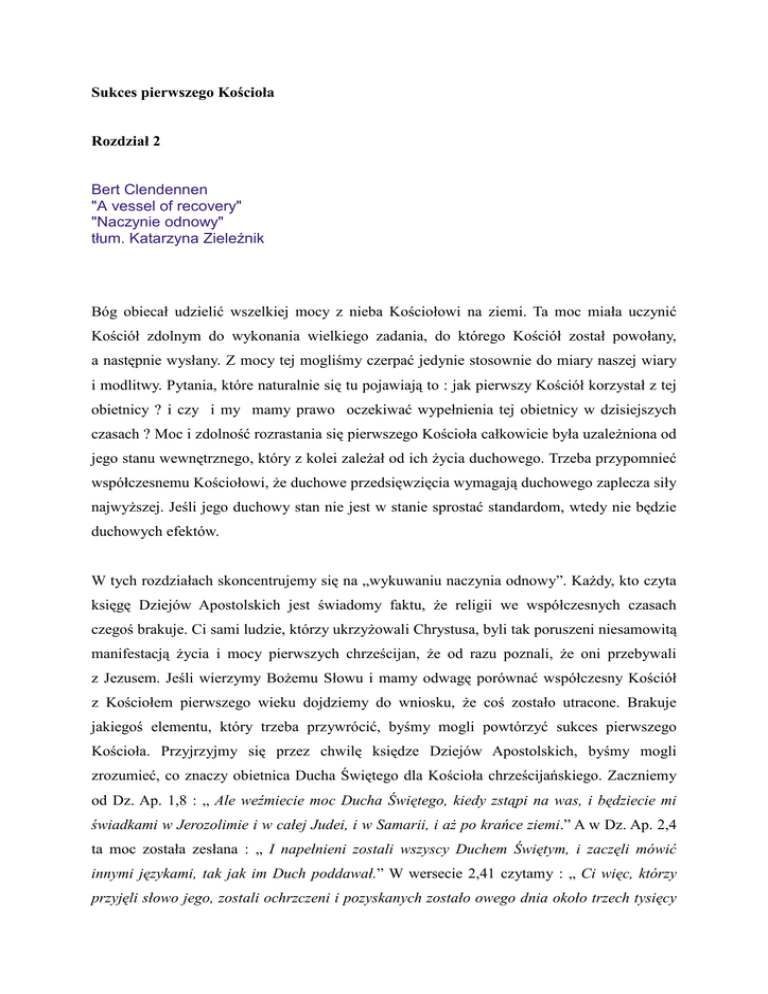 Sukces pierwszego Kościoła Rozdział 2 Bert Clendennen "A vessel of recovery" "Naczynie odnowy" tłum. Katarzyna Zieleźnik Bóg obiecał udzielić wszelkiej mocy z nieba Kościołowi na ziemi. Ta moc miała uczynić Kościół zdolnym do wykonania wielkiego zadania, do którego Kościół został powołany, a następnie wysłany. Z mocy tej mogliśmy czerpać jedynie stosownie do miary naszej wiary i modlitwy. Pytania, które naturalnie się tu pojawiają to : jak pierwszy Kościół korzystał z tej obietnicy ? i czy i my mamy prawo oczekiwać wypełnienia tej obietnicy w dzisiejszych czasach ? Moc i zdolność rozrastania się pierwszego Kościoła całkowicie była uzależniona od jego stanu wewnętrznego, który z kolei zależał od ich życia duchowego. Trzeba przypomnieć współczesnemu Kościołowi, że duchowe przedsięwzięcia wymagają duchowego zaplecza siły najwyższej. Jeśli jego duchowy stan nie jest w stanie sprostać standardom, wtedy nie będzie duchowych efektów. W tych rozdziałach skoncentrujemy się na „wykuwaniu naczynia odnowy”. Każdy, kto czyta księgę Dziejów Apostolskich jest świadomy faktu, że religii we współczesnych czasach czegoś brakuje. Ci sami ludzie, którzy ukrzyżowali Chrystusa, byli tak poruszeni niesamowitą manifestacją życia i mocy pierwszych chrześcijan, że od razu poznali, że oni przebywali z Jezusem. Jeśli wierzymy Bożemu Słowu i mamy odwagę porównać współczesny Kościół z Kościołem pierwszego wieku dojdziemy do wniosku, że coś zostało utracone. Brakuje jakiegoś elementu, który trzeba przywrócić, byśmy mogli powtórzyć sukces pierwszego Kościoła. Przyjrzyjmy się przez chwilę księdze Dziejów Apostolskich, byśmy mogli zrozumieć, co znaczy obietnica Ducha Świętego dla Kościoła chrześcijańskiego. Zaczniemy od Dz. Ap. 1,8 : „ Ale weźmiecie moc Ducha Świętego, kiedy zstąpi na was, i będziecie mi świadkami w Jerozolimie i w całej Judei, i w Samarii, i aż po krańce ziemi.” A w Dz. Ap. 2,4 ta moc została zesłana : „ I napełnieni zostali wszyscy Duchem Świętym, i zaczęli mówić innymi językami, tak jak im Duch poddawał.” W wersecie 2,41 czytamy : „ Ci więc, którzy przyjęli słowo jego, zostali ochrzczeni i pozyskanych zostało owego dnia około trzech tysięcy dusz.” A w Dz. Ap. 3,7-8 to świadectwo jest coraz większe : „ I ująwszy go za prawą rękę, podniósł go; natychmiast też wzmocniły się jego nogi i kostki, I zerwawszy się stanął i chodził i wszedł z nimi do świątyni, przechadzając się i podskakując i chwaląc Boga .„ Efekty przejawów mocy Ducha widzimy w Dz. Ap. 4,4 : „ Wielu zaś z tych, którzy tę mowę słyszeli, uwierzyło, a liczba mężów wzrosła do około pięciu tysięcy.” Jezus nakazał swoim uczniom, a także nakazuje nam, by iść na cały świat i głosić ewangelię wszelkiemu stworzeniu. Bez radia, telewizji i samolotów odrzutowych oni zdobyli swoje pokolenie dla Chrystusa. Apostoł Paweł sam przebył prawie 3000 km ewangelizując. Jest to taka odległość jak od rzeki Rio Grande do Wielkich Jezior. Osobiście posiał ziarno ewangelii od Jerozolimy, przez Azję, wzdłuż głównych szlaków handlowych Europy. Jego pokolenie zostało dotknięte Bożym Słowem, a on sam umierał wierząc, że wszyscy na świecie usłyszeli dobrą nowinę. Pierwsi uczniowie Chrystusa przyjmowali słowo „ I weźmiecie moc Ducha” dosłownie. Ich świadectwo nie opierało się na przypuszczeniach, przemyśleniach czy domysłach, ono opierało się na słowach „ co mam, to ci daję”. Jezus powiedział „ darmo otrzymaliście, darmo dawajcie”. Oni wierzyli Słowu, a ono dotykało ich świat. Piotr powiedział do chromego, który nie chodził od 40 lat : „co mam, to ci daję” oraz „ natychmiast też wzmocniły się jego nogi i kostki, I zerwawszy się , stanął i chodził, i wszedł z nimi do świątyni, przechadzając się i podskakując i chwaląc Boga.” Pierwsze pokolenie uczniów nie „ wgryzało się” w słowa, oni wierzyli im. Ci ludzie mieli naprawdę silne przekonania. Kiedy ten gwałtowny wiatr wiał w sali na piętrze, oni wiedzieli, że Jezus usiadł po prawicy Ojca, jego wrogowie stali się podnóżkiem dla jego stóp, a ten gwałtowny wiatr był spełnieniem obietnicy o zesłaniu mocy danej im wcześniej. Pewne rzeczy, które miały miejsce w pierwszym Kościele, które dotyczyły go, muszą zaistnieć zanim my powtórzymy to, co oni osiągnęli. Ktoś w tym pokoleniu musi powstać. Pytanie brzmi: czy będziesz jedną z tych osób ? Koniec wieków nadchodzi, stoimy u progu najważniejszego wydarzenia w historii – przyjścia Chrystusa. To właśnie my jesteśmy tymi ludźmi, dla których nastał koniec świata. Chrystus nie przyjdzie po zdruzgotany system religijny, On przyjdzie po Kościół, który narodził się w pierwszym wieku. Przeczytaj księgę Dziejów Apostolskich, a dowiesz się, że Jego nie interesuje nic innego, tylko taki właśnie Kościół. Jezus powiedział „ na tej skale zbuduje swój Kościół” - Mt. 16,18. Jeśli Chrystus miałby przyjść po Kościół, który obniżył wszelkie Jego standardy, to oznaczałoby, że poniósł 2 klęskę. A zatem pytanie nie brzmi : czy możemy, lecz czy wykonamy ? Przeczytajcie jeszcze raz Dzieje Apostolskie i zobaczcie, co tam jest napisane. Umarli powstają z martwych, tysiące ludzi rodzi się na nowo do życia w Królestwie Bożym, ślepi widzą, głusi słyszą, chromi chodzą i całe społeczności są poruszane i dotykane przez Boga. Każda strona tej księgi tchnie samym Bogiem i objawia Jego życie. To nie sterylne ludzkie doktryny, które są tylko intelektualną wiedzą o Bogu. Widać tam wzrastającą realność Boga i pod koniec wieków też tego doświadczymy. Bóg powiedział w Księdze Kaznodziei Salomona, że to co jest już było. Nie dajcie się zwieść gdyż ostatnie żniwo zostanie zebrane wtedy, kiedy Kościół stan