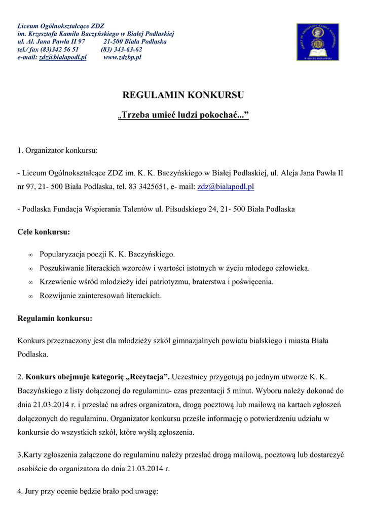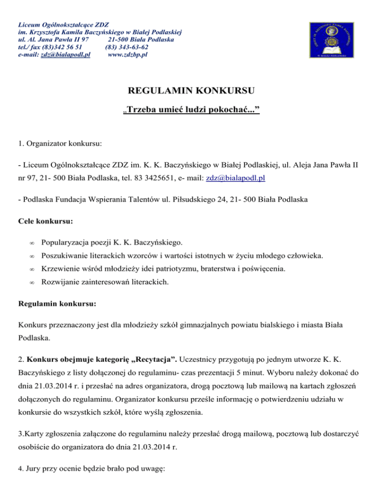 Liceum Ogólnokształcące ZDZ im. Krzysztofa Kamila Baczyńskiego w Białej Podlaskiej ul. Al. Jana Pawła II 97 21-500 Biała Podlaska tel./ fax (83)342 56 51 (83) 343-63-62 e-mail: [email protected] www.zdzbp.pl REGULAMIN KONKURSU „Trzeba umieć ludzi pokochać...” 1. Organizator konkursu: - Liceum Ogólnokształcące ZDZ im. K. K. Baczyńskiego w Białej Podlaskiej, ul. Aleja Jana Pawła II nr 97, 21- 500 Biała Podlaska, tel. 83 3425651, e- mail: [email protected] - Podlaska Fundacja Wspierania Talentów ul. Piłsudskiego 24, 21- 500 Biała Podlaska Cele konkursu: • Popularyzacja poezji K. K. Baczyńskiego. • Poszukiwanie literackich wzorców i wartości istotnych w życiu młodego człowieka. • Krzewienie wśród młodzieży idei patriotyzmu, braterstwa i poświęcenia. • Rozwijanie zainteresowań literackich. Regulamin konkursu: Konkurs przeznaczony jest dla młodzieży szkół gimnazjalnych powiatu bialskiego i miasta Biała Podlaska. 2. Konkurs obejmuje kategorię „Recytacja”. Uczestnicy przygotują po jednym utworze K. K. Baczyńskiego z listy dołączonej do regulaminu- czas prezentacji 5 minut. Wyboru należy dokonać do dnia 21.03.2014 r. i przesłać na adres organizatora, drogą pocztową lub mailową na kartach zgłoszeń dołączonych do regulaminu. Organizator konkursu prześle informację o potwierdzeniu udziału w konkursie do wszystkich szkół, które wyślą zgłoszenia. 3.Karty zgłoszenia załączone do regulaminu należy przesłać drogą mailową, pocztową lub dostarczyć osobiście do organizatora do dnia 21.03.2014 r. 4. Jury przy ocenie będzie brało pod uwagę: Liceum Ogólnokształcące ZDZ im. Krzysztofa Kamila Baczyńskiego w Białej Podlaskiej ul. Al. Jana Pawła II 97 21-500 Biała Podlaska tel./ fax (83)342 56 51 (83) 343-63-62 e-mail: [email protected] www.zdzbp.pl • • • • Interpretację tekstu Kulturę słowa Ogólny wyraz artystyczny Dobór treści Patronat konkursu obejmuje Dyrektor Zakładu Doskonalenia Zawodowego - mgr inż. Henryk Zacharuk. Koordynatorami konkursu odpowiedzialnymi za nadzór przebiegu konkursu oraz kontakt ze szkołami są: mgr Teresa Daniluk, mgr Grażyna Denicka, mgr Aneta Pawlik. Przebieg konkursu: 1. Konkurs odbędzie się 09.04.2014 r. o godzinie 11.00 w siedzibie organizatora w budynku szkoły przy ul. Al. Jana Pawła II 97 w Białej Podlaskiej. Uczestnicy konkursu powinni zgłosić swoje przybycie do organizatora. 2. Laureaci konkursu otrzymają pamiątkowe dyplomy, które wręczy Dyrektor Szkoły. 3. Nagrody: za I miejsce- cyfrowy aparat fotograficzny za II miejsce- odtwarzacz MP4 za III miejsce- kamera internetowa 4. Wszyscy uczestnicy konkursu otrzymają pamiątkowe dyplomy. 5. Szkoła w przypadku bardzo dużej liczby zgłoszeń przewiduje organizację konkursu na dwa dni. Liceum Ogólnokształcące ZDZ im. Krzysztofa Kamila Baczyńskiego w Białej Podlaskiej ul. Al. Jana Pawła II 97 21-500 Biała Podlaska tel./ fax (83)342 56 51 (83) 343-63-62 e-mail: [email protected] www.zdzbp.pl Załącznik nr 1 Lista utworów K. K. Baczyńskiego: • • • • • • • • • • • • • • • • • • • • • • • • • • • • • Niebo złote ci otworzę... Biała magia Pioseneczka Promienie Wróble Pragnienia Ten czas Z wiatrem Źródło Byłeś jak wielkie, stare drzewo Co jest we mnie Do matki Dwie miłości Dzieło dla rąk Miłość Pokolenie I Pokolenie II Rzeczy niepokój Trzeba umieć ludzi pokochać... Tych miłości Wyroki Z głową na karabinie Historia Których nam nikt nie wynagrodzi Młot Mój ty smutku cichy On w wielości stoi Z lasu Świętość Liceum Ogólnokształcące ZDZ im. Krzysztofa Kamila Baczyńskiego w Białej Podlaskiej ul. Al. Jana Pawła II 97 21-500 Biała Podlaska tel./ fax (83)342 56 51 (83) 343-63-62 e-mail: [email protected] www.zdzbp.pl KARTA ZGŁOSZENIA uczestnictwa w konkursie „Trzeba umieć ludzi pokochać...” ……………………………. pieczęć szkoły Nazwa szkoły: …................................................................................................................................. Adres szkoły: …................................................................................................................................... Imię i nazwisko uczestnika: ................................................................................................................. Imię i nazwisko opiekuna: ….............................................................................................................. Tytuł wybranego utworu: …............................................................................................................... Podpis opiekuna Podpis uczestnika …................................................... …................................................... Liceum Ogólnokształcące ZDZ im. Krzysztofa Kamila Baczyńskiego w Białej Podlaskiej ul. Al. Jana Pawła II 97 21-500 Biała Podlaska tel./ fax (83)342 56 51 (83) 343-63-62 e-mail: [email protected] www.zdzbp.pl Miejscowość i data wypełnienia:............................................................................