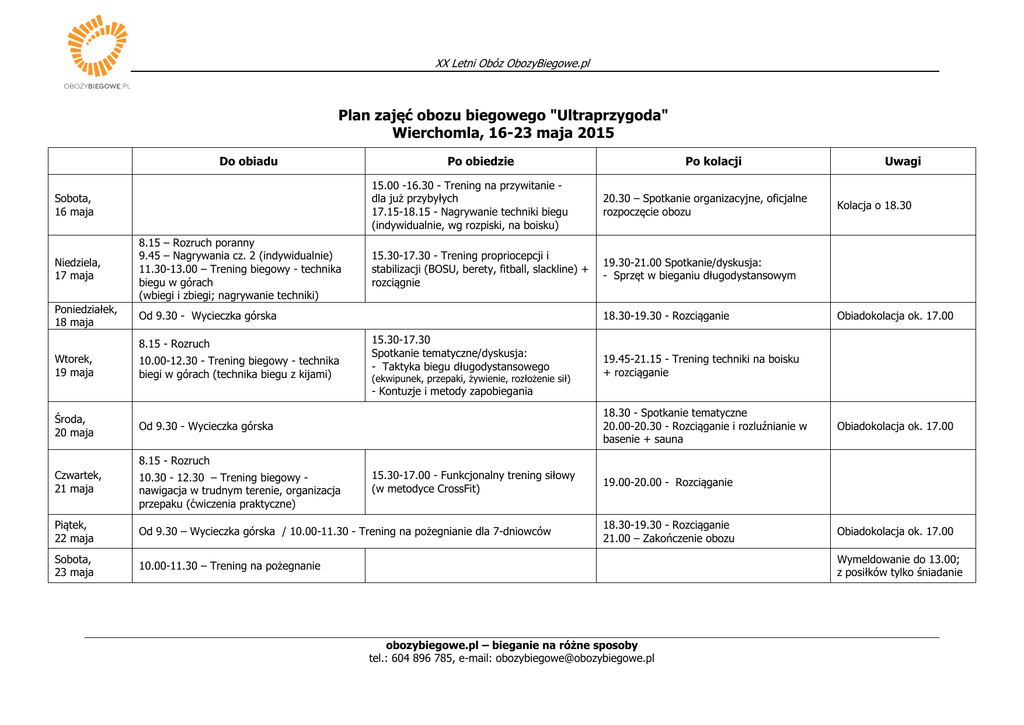 XX Letni Obóz ObozyBiegowe.pl Plan zajęć obozu biegowego "Ultraprzygoda" Wierchomla, 16-23 maja 2015 Do obiadu Sobota, 16 maja Niedziela, 17 maja 8.15 – Rozruch poranny 9.45 – Nagrywania cz. 2 (indywidualnie) 11.30-13.00 – Trening biegowy - technika biegu w górach (wbiegi i zbiegi; nagrywanie techniki) Poniedziałek, 18 maja Od 9.30 - Wycieczka górska 8.15 - Rozruch Wtorek, 19 maja 10.00-12.30 - Trening biegowy - technika biegi w górach (technika biegu z kijami) Po obiedzie Po kolacji 15.00 -16.30 - Trening na przywitanie dla już przybyłych 17.15-18.15 - Nagrywanie techniki biegu (indywidualnie, wg rozpiski, na boisku) 20.30 – Spotkanie organizacyjne, oficjalne rozpoczęcie obozu 15.30-17.30 - Trening propriocepcji i stabilizacji (BOSU, berety, fitball, slackline) + rozciągnie 19.30-21.00 Spotkanie/dyskusja: - Sprzęt w bieganiu długodystansowym 18.30-19.30 - Rozciąganie 15.30-17.30 Spotkanie tematyczne/dyskusja: - Taktyka biegu długodystansowego (ekwipunek, przepaki, żywienie, rozłożenie sił) Uwagi Kolacja o 18.30 Obiadokolacja ok. 17.00 19.45-21.15 - Trening techniki na boisku + rozciąganie - Kontuzje i metody zapobiegania Środa, 20 maja 18.30 - Spotkanie tematyczne 20.00-20.30 - Rozciąganie i rozluźnianie w basenie + sauna Od 9.30 - Wycieczka górska Obiadokolacja ok. 17.00 8.15 - Rozruch Czwartek, 21 maja 10.30 - 12.30 – Trening biegowy nawigacja w trudnym terenie, organizacja przepaku (ćwiczenia praktyczne) 15.30-17.00 - Funkcjonalny trening siłowy (w metodyce CrossFit) Piątek, 22 maja Od 9.30 – Wycieczka górska / 10.00-11.30 - Trening na pożegnianie dla 7-dniowców Sobota, 23 maja 10.00-11.30 – Trening na pożegnanie 19.00-20.00 - Rozciąganie 18.30-19.30 - Rozciąganie 21.00 – Zakończenie obozu Obiadokolacja ok. 17.00 Wymeldowanie do 13.00; z posiłków tylko śniadanie obozybiegowe.pl – bieganie na różne sposoby tel.: 604 896 785, e-mail: [email protected]