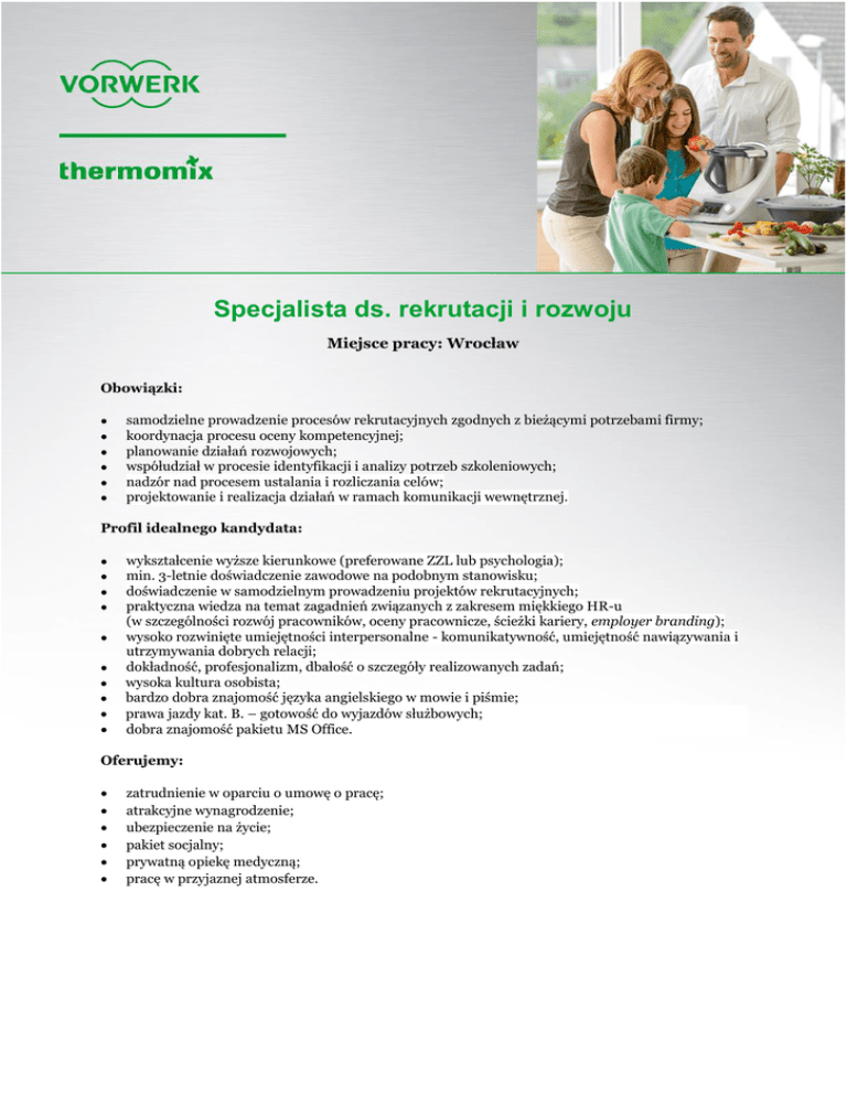 Specjalista ds. rekrutacji i rozwoju Miejsce pracy: Wrocław Obowiązki: samodzielne prowadzenie procesów rekrutacyjnych zgodnych z bieżącymi potrzebami firmy; koordynacja procesu oceny kompetencyjnej; planowanie działań rozwojowych; współudział w procesie identyfikacji i analizy potrzeb szkoleniowych; nadzór nad procesem ustalania i rozliczania celów; projektowanie i realizacja działań w ramach komunikacji wewnętrznej. Profil idealnego kandydata: wykształcenie wyższe kierunkowe (preferowane ZZL lub psychologia); min. 3-letnie doświadczenie zawodowe na podobnym stanowisku; doświadczenie w samodzielnym prowadzeniu projektów rekrutacyjnych; praktyczna wiedza na temat zagadnień związanych z zakresem miękkiego HR-u (w szczególności rozwój pracowników, oceny pracownicze, ścieżki kariery, employer branding); wysoko rozwinięte umiejętności interpersonalne - komunikatywność, umiejętność nawiązywania i utrzymywania dobrych relacji; dokładność, profesjonalizm, dbałość o szczegóły realizowanych zadań; wysoka kultura osobista; bardzo dobra znajomość języka angielskiego w mowie i piśmie; prawa jazdy kat. B. – gotowość do wyjazdów służbowych; dobra znajomość pakietu MS Office. Oferujemy: zatrudnienie w oparciu o umowę o pracę; atrakcyjne wynagrodzenie; ubezpieczenie na życie; pakiet socjalny; prywatną opiekę medyczną; pracę w przyjaznej atmosferze.