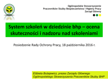 System szkoleń w dziedzinie bhp – ocena skuteczności i nadzoru nad szkoleniami Posiedzenie Rady Ochrony Pracy, 18 października 2016 r. Elżbieta Bożejewicz, prezes Zarządu Głównego Ogólnopolskiego Stowarzyszenia Pracowników Służby BHP System szkoleń w dziedzinie bhp – „dobre strony” Art. 237ᶟ Kodeksu pracy Nie wolno dopuścić pracownika do pracy, do której wykonywania nie posiada on wymaganych kwalifikacji lub potrzebnych umiejętności, a także dostatecznej znajomości przepisów oraz zasad bezpieczeństwa i higieny pracy. Pracodawca jest obowiązany zapewnić przeszkolenie pracownika w zakresie bezpieczeństwa i higieny pracy przed dopuszczeniem go do pracy oraz zapewnić prowadzenie okresowych szkoleń w tym zakresie. System szkoleń w dziedzinie bhp – „dobre strony” Pracodawca jest obowiązany odbyć szkolenie w dziedzinie bhp w zakresie niezbędnym do wykonywania ciążących na nim obowiązków. Szkolenie to powinno być okresowo powtarzane. Art. 2374 Kodeksu pracy Pracodawca jest zobowiązany do zapoznania pracowników z przepisami i zasadami bezpieczeństwa i higieny pracy, dotyczącymi wykonywanych przez nich prac . System szkoleń w dziedzinie bhp – „dobre strony” Na podstawie art. 237.5 Kodeksu pracy wydano Rozporządzenie Ministra Gospodarki i Pracy z dnia 27 lipca 2004 r. w sprawie szkolenia w dziedzinie bezpieczeństwa i higieny pracy (Dz. U. z 2004 r. nr 180, poz. 1860, zm. Dz. U. z 2005 r. nr 116, poz. 972, zm. Dz. U. z 2007 r. nr 196, poz. 1420). Rozporządzenie określa: • szczegółowe zasady szkolenia w dziedzinie bezpieczeństwa i higieny pracy, • zakres szkolenia, System szkoleń w dziedzinie bhp – „dobre strony” • wymagania dotyczące treści i realizacji programów szkolenia, • sposób dokumentowania szkolenia, • przypadki, w których pracodawcy lub pracownicy mogą być zwolnieni z określonych rodzajów szkolenia. System szkoleń w dziedzinie bhp – „dobre strony” Szkolenie wstępne: • Instruktaż ogólny powinien zapewnić uczestnikom szkolenia zapoznanie się z podstawowymi przepisami bhp zawartymi w Kodeksie pracy, w układach zbiorowych pracy lub w regulaminach pracy, jak też z przepisami oraz zasadami bhp obowiązującymi w danym zakładzie pracy, a także z zasadami udzielania pierwszej pomocy w razie wypadku System szkoleń w dziedzinie bhp – „dobre strony” • Instruktaż stanowiskowy powinien zapewnić uczestnikom szkolenia zapoznanie się z czynnikami środowiska pracy występującymi na ich stanowiskach pracy i ryzykiem zawodo -wym związanym z wykonywaną pracą, sposobami ochrony przed zagrożeniami, jakie mogą powodować te czynniki, oraz metodami bezpiecznego wykonywania pracy na tych stanowiskach. System szkoleń w dziedzinie bhp – „dobre strony” • Instruktaż stanowiskowy przeprowadza wyznaczona przez pracodawcę osoba kierująca pracownikami lub sam pracodawca, jeżeli osoby te posiadają odpowiednie kwalifikacje i doświadczenie zawodowe oraz są przeszkolone w zakresie metod prowadzenia instruktażu stanowiskowego, np. w ramach szkolenia okresowego bhp. …. Odbycie instruktażu ogólnego oraz instruktażu stanowiskowego pracownik potwierdza na piśmie w karcie szkolenia wstępnego (wg wzoru będącego załącznikiem do rozporządzenia), która jest przechowywana w aktach osobowych pracownika. System szkoleń w dziedzinie bhp – „dobre strony” Szkolenia okresowe Główną ideą szkoleń okresowych jest aktualizacja i ugruntowa nie wiedzy i umiejętności w dziedzinie bezpieczeństwa i higieny pracy oraz zaznajomienie uczestników szkolenia z nowymi rozwiązaniami techniczno-organizacyjnymi. System szkoleń w dziedzinie bhp – „dobre strony” Organizatorzy szkoleń Szkolenie może być organizowane i prowadzone przez pracodawców lub, na ich zlecenie, przez jednostki organizacyjne prowadzące działalność szkoleniową w dziedzinie bezpieczeństwa i higieny pracy. System szkoleń w dziedzinie bhp – „dobre strony” Zastrzeżenie - szkolenia osób będących pracodawcami, pracowników służby bhp oraz instruktorów i wykładowców tematyki bhp mogą prowadzić wyłącznie zewnętrzne jednostki organizacyjne Zasady etyki zawodowej służby bhp wprowadzone przez OSPSBHP - misją służby bezpieczeństwa i higieny pracy jest dążenie do zapewnienia wysokiego poziomu bezpieczeństwa i ochrony zdrowia pracujących. Podstawą działań w tym zakresie jest wspólny cel pracujących, pracodawców i służby bhp System szkoleń w dziedzinie bhp – „złe strony” Instruktaż ogólny prowadzi pracownik służby bezpieczeństwa i higieny pracy, osoba wykonująca u pracodawcy zadania tej służby albo pracodawca, który sam wykonuje takie zadania. Może to być też pracownik wyznaczony przez pracodawcę, a posiadający zasób wiedzy i umiejętności zapewniający właściwą realizację programu instruktażu. brak synchronizacji pomiędzy rozporządzeniem w sprawie szkoleń a rozporządzeniem w sprawie służby bhp. Przepis przypisujący służbie bhp prowadzenie instruktażu ogólnego koliduje z § 2 ust. 2 rozporządzenia w sprawie służby bhp, System szkoleń w dziedzinie bhp – „złe strony” Szkolenia mogą być prowadzone w różnych formach, w zależności od rodzaju szkolenia. W rozporządzeniu znajdujemy szczegółową terminologię, i tak np: - samokształcenie kierowane - rozumie się przez to formę szkolenia umożliwiającego uzyskanie, aktualizowanie lub uzupełnianie wiedzy i umiejętności w zakresie bezpieczeństwa i higieny pracy, na podstawie materiałów przekazanych przez organizatora szkolenia, w szczególności przy zastosowaniu poczty, internetu, przy jednoczesnym zapewnieniu konsultacji z osobami spełniającymi wymagania dla wykładowców, System szkoleń w dziedzinie bhp – „złe strony” Wprowadzona kilka lat temu forma „samokształcenia kierowanego” wypaczyła całkowicie cel szkoleń bhp. Rzeczywistość wygląda nieste
