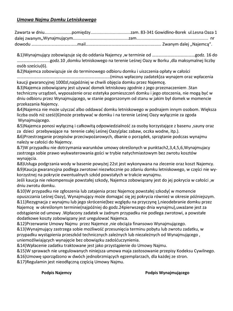 Umowa Najmu Domku Letniskowego Zawarta w dniu.......................pomiędzy..................................zam. 83-341 Gowidlino-Borek ul.Lesna Oaza 1 dalej zwanym„Wynajmującym...............................................zam............................................................. nr dowodu ……………………………………mail…………………………………………………...……… Zwanym dalej „Najemcą“. &1)Wynajmujący zobowiązuje się do oddania Najemcy ,w terminie od ………..………………….……godz. 16 do ………………….……..godz.10 ,domku letniskowego na terenie Leśnej Oazy w Borku ,dla maksymalnej liczby osób sześciu(6). &2)Najemca zobowiązuje sie do terminowego odbioru domku i uiszczenia opłaty w całości …………………………………………..……………………………..(minus wpłacony zadatek)za wynajem oraz wpłacenia kaucji gwarancyjnej 1000zl,najpóźniej w chwili objęcia domku przez Najemcę. &3)Najemca zobowiązany jest używać domek letniskowy zgodnie z jego przeznaczeniem .Stan techniczny urządzeń, wyposażenie oraz estetyka pomieszczeń domku i jego otoczenia, nie mogą być w dniu odbioru przez Wynajmującego, w stanie pogorszonym od stanu w jakim był domek w momencie przekazania Najemcy. &4)Najemca nie może użyczać albo oddawać domku letniskowego w podnajem innym osobom. Większa liczba osób niż sześć(6)może przebywać w domku i na terenie Leśnej Oazy wyłącznie za zgoda Wynajmującego. &5)Najemca ponosi wyłączną i całkowitą odpowiedzialność za osoby korzystające z basenu ,sauny oraz za dzieci przebywające na terenie całej Leśnej Oazy(plac zabaw, oczka wodne, itp.). &6)Przestrzeganie przepisów przeciwpożarowych, dbanie o porządek, sprzątanie podczas wynajmu należy w całości do Najemcy. &7)W przypadku nie dotrzymania warunków umowy określonych w punktach2,3,4,5,6,Wynajmujacy zastrzega sobie prawo wykwaterowania gości w trybie natychmiastowym bez zwrotu kosztów wynajęcia. &8)Usługa podgrzania wody w basenie powyżej 22st jest wykonywana na zlecenie oraz koszt Najemcy. &9)Kaucja gwarancyjna podlega zwrotowi niezwłocznie po zdaniu domku letniskowego, w części nie wykorzystnej na pokrycie ewentualnych szkód powstałych w trakcie wynajmu. Jeśli kaucja nie rekompensuje powstałej szkody, Najemca zobowiązany jest do jej pokrycia w całości ,w dniu zwrotu domku. &10)W przypadku nie zgłoszenia lub zatajenia przez Najemcę powstałej szkody( w momencie opuszczania Leśnej Oazy), Wynajmujący może domagać się jej pokrycia również w okresie późniejszym. &11)Rezygnacja z wynajmu lub jego skrócenie(bez względu na przyczynę ),nieodebranie domku przez Najemcę w określonym terminie(najpóźniej do godz.24pierwszego dnia wynajmu),uważane jest za odstąpienie od umowy .Wpłacony zadatek w żadnym przypadku nie podlega zwrotowi, a powstałe dodatkowe koszty zobowiązany jest uregulować Najemca. &12)Przerwanie Umowy Najmu przez Najemce ,nie obciąża finansowo Wynajmującego. &13)Wynajmujący zastrzega sobie możliwość przesunięcia terminu pobytu lub zwrotu zadatku, w przypadku wystąpienia przeszkód technicznych zależnych lub niezależnych od Wynajmującego , uniemożliwiających wynajęcie bez obowiązku zadośćuczynienia. &14)Wpłacenie zadatku traktowane jest jako przystąpienie do Umowy Najmu. &15)W sprawach nie uregulowanych niniejsza umowa maja zastosowanie przepisy Kodeksu Cywilnego. &16)Umowę sporządzono w dwóch jednobrzmiących egzemplarzach, dla każdej ze stron. &17)Regulamin jest nieodłączną częścią Umowy Najmu. Podpis Najemcy Podpis Wynajmującego
