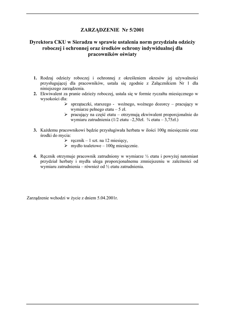 ZARZĄDZENIE Nr 5/2001 Dyrektora CKU w Sieradzu w sprawie ustalenia norm przydziału odzieży roboczej i ochronnej oraz środków ochrony indywidualnej dla pracowników oświaty 1. Rodzaj odzieży roboczej i ochronnej z określeniem okresów jej używalności przysługującej dla pracowników, ustala się zgodnie z Załącznikiem Nr 1 dla niniejszego zarządzenia. 2. Ekwiwalent za pranie odzieży roboczej, ustala się w formie ryczałtu miesięcznego w wysokości dla: ¾ sprzątaczki, starszego - woźnego, woźnego dozorcy – pracujący w wymiarze pełnego etatu – 5 zł. ¾ pracujący na część etatu – otrzymują ekwiwalent proporcjonalnie do wymiaru zatrudnienia (1/2 etatu –2,50zł. ¾ etatu – 3,75zł.) 3. Każdemu pracownikowi będzie przysługiwała herbata w ilości 100g miesięcznie oraz środki do mycia: ¾ ręcznik – 1 szt. na 12 miesięcy, ¾ mydło toaletowe – 100g miesięcznie. 4. Ręcznik otrzymuje pracownik zatrudniony w wymiarze ½ etatu i powyżej natomiast przydział herbaty i mydła ulega proporcjonalnemu zmniejszeniu w zależności od wymiaru zatrudnienia – również od ½ etatu zatrudnienia. Zarządzenie wchodzi w życie z dniem 5.04.2001r. Załącznik Nr 1 TABELA NORM PRZYDZIAŁU ODZIEŻY OCHRONNEJ I OBUWIA DLA PRACOWNIKÓW OBSŁUGI CKU Stanowisko pracy Rodzaj odzieży, obuwie Okres używalności Ilość sztuk Sprzątaczka Fartuch stylonowy Buty 12 m-cy 12 m-cy 1 szt. 1 szt. Starszy – woźny Woźny dozorca Buty ocieplane /o.z/ Rękawice ochronne /d.z/ Kurtka ocieplana /o.z/ Kamizelka ocieplana /o.z/ Czapka ocieplana /o.z/ 24 m-ce 12 m-cy 6 lat 6 lat 2 lata 1 para 6-12 par 1 szt. 1 szt. 1 szt. ZASADY GOSPODAROWANIA ŚRODKAMI OCHRONY INDYWIDUALNEJ ORAZ ODZIEŻĄ I OBUWIEM ROBOCZYM Środki ochrony indywidualnej stanowią ważny czynnik ochrony człowieka w procesie pracy. Są prace, których wykonanie bez stosowania odpowiednich środków ochrony indywidualnej jest niemożliwe. Należy pamiętać, że dostarczenie pracownikom środków ochrony indywidualnej należy do podstawowych obowiązków pracodawcy, jak również, że używanie ich przy pracy jest obowiązkiem pracownika. Odzież robocza i obuwie robocze są przeznaczone do użytku podczas wykonywania pracy zarówno dla ochrony pracownika przed zabrudzeniem, przykrymi wyziewami, czynnikami mechanicznymi itp. jak i w celu umożliwienia zachowania higieny i wymogów sanitarnych oraz ochrony wytwarzanego lub przetwarzanego produktu. Odzież robocza powinna być zgodna z polskimi normami. Zgodnie z kodeksem pracy pracodawca jest obowiązany dostarczyć bezpłatnie odzież ochrony osobistej i inne środki ochronne zatrudnionym przy pracach narażających ich na uszkodzenie ciała lub urazy mechaniczne, oparzenia, zatrucia, porażenia prądem elektrycznym, a także pracownikom zatrudnionym w niskich temperaturach, wilgoci, hałasie lub innych warunkach szkodliwych dla zdrowia. §1 Środki ochrony indywidualnej, obuwie i odzież robocza są przydzielane pracownikom bezpłatnie i stanowią własność pracodawcy. §2 Odzież, obuwie i środki ochrony indywidualnej winny być przez pracownika używane w miejscu pracy i zgodnie z ich przeznaczeniem. Pracownik otrzymuje je w ilości i rodzaju uzależnionym od stanowiska, na którym pracuje zgodnie z angażem i warunkami pracy. Pracownik może otrzyma środki ochrony indywidualnej, a także odzież roboczą /oprócz bielizny osobistej i obuwia/ jeżeli przedmioty te zachowały własności ochronne i odpowiadają wymogom higieniczno-sanitarnym /są czyste i zdezynfekowane/. §3 Środki ochrony indywidualnej mają być używane do czasu utraty ich cech ochronnych, a odzież i obuwie robocze do czasu utraty ich cech użytkowania w stopniu uniemożliwiającym dokonanie naprawy. W tym przypadku nastąpi wymiana na nowy sprzęt i odzież spełniające wymogi określone w normach. §4 Pracownik jest zobowiązany utrzymać w należytym stanie odzież, obuwie robocze i środki ochrony indywidualnej. §5 Tabele norm przydziału ZAŁĄCZNIK Nr 1 ustala pracodawca w porozumieniu ze związkami zawodowymi. §6 Konserwacja przedmiotów wymienionych w tabeli norm przydziału, naprawa oraz pranie należy do obowiązków pracodawcy. §7 ponieważ pracodawca nie ma możliwości zorganizowania prania i naprawy odzieży roboczej wydanej do stałego indywidualnego użytkowania, za pranie w stopniu zabrudzenia możliwym do usunięcia w praniu domowym, wypłaca za zgodą pracownika ekwiwalent pieniężny w wysokości ustalonych kosztów tych czynności i środków piorących. Pracownik zatrudniony na część etatu otrzymuje ekwiwalent proporcjonalnie do wymiaru zatrudnienia. §8 Stosownie do § 7 pracownik w odrębnym oświadczeniu ustali wysokość ekwiwalentu pieniężnego wypłaconego mu za pranie i konserwację odzieży roboczej. §9 Wypłata ekwiwalentu o którym mowa w § 8 nastąpi po zakończeniu kwartału. § 10 Ekwiwalent za pranie i konserwację odzieży może zostać wypłacony o przepracowaniu połowy dni roboczych w danym miesiącu. § 11 W razie utraty lub zniszczenia środków ochrony indywidualnej, zakład pracy jest obowiązany wydać pracownikowi niezwłocznie inne środki ochrony indywidualnej przewidziane w tabeli norm. Jeżeli utrata lub zniszczenie tych przedmiotów nastąpiły z winy pracownika, jest on obowiązany uiścić kwotę równą nie zamortyzowanej części utraconych środków ochrony indywidualnej. Kwotę tą pracodawca może obniżyć, jeżeli uzasadniają to okoliczności zniszczenia. § 12 w przypadku rozwiązania umowy o pracę lub wygaśnięcia umowy o pracę pracownik zobowiązany jest zwrócić przydzieloną odzież. W/w przepis nie ma zastosowania w razie: przejścia pracownika na emeryturę, śmierci pracownika § 13 W tabeli norm środków ochrony indywidualnej określone są wyłącznie te stanowiska pracy, na których zatrudnieni pracownicy wykonują stale pracę w warunkach działania niebezpiecznych lub szkodliwych dla zdrowia czynni