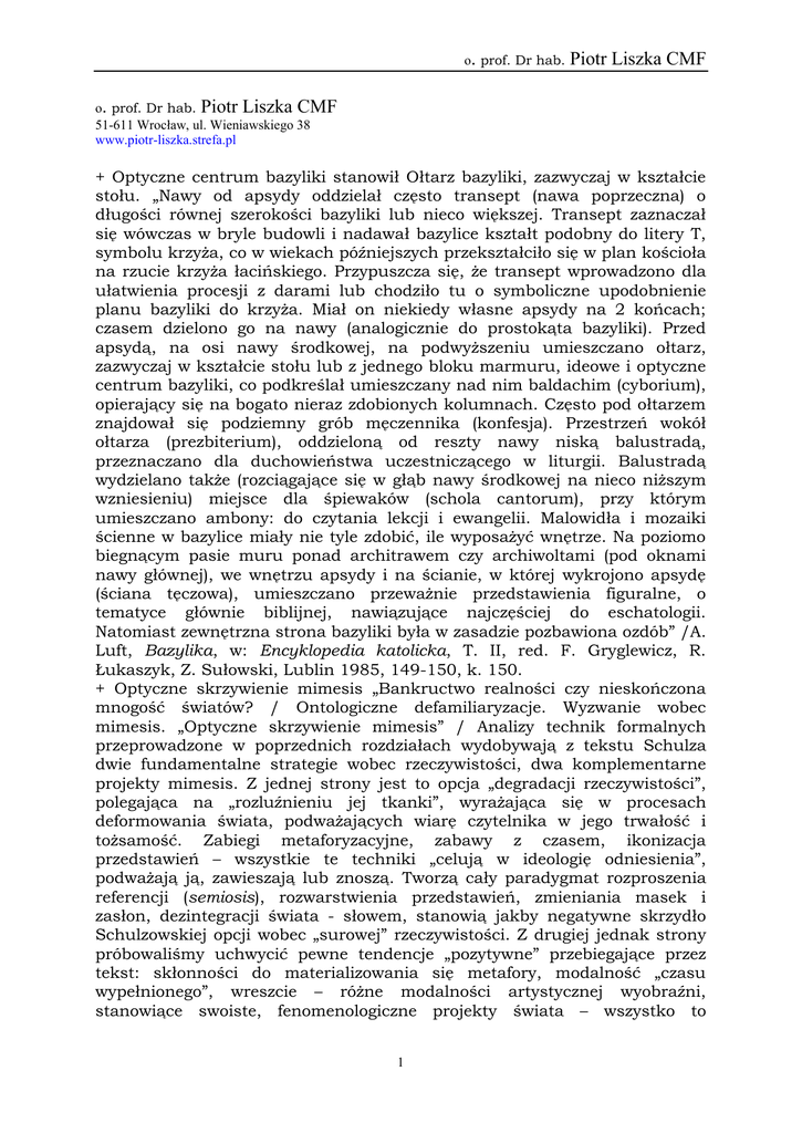 o. prof. Dr hab. Piotr Liszka CMF o. prof. Dr hab. Piotr Liszka CMF 51-611 Wrocław, ul. Wieniawskiego 38 www.piotr-liszka.strefa.pl + Optyczne centrum bazyliki stanowił Ołtarz bazyliki, zazwyczaj w kształcie stołu. „Nawy od apsydy oddzielał często transept (nawa poprzeczna) o długości równej szerokości bazyliki lub nieco większej. Transept zaznaczał się wówczas w bryle budowli i nadawał bazylice kształt podobny do litery T, symbolu krzyża, co w wiekach późniejszych przekształciło się w plan kościoła na rzucie krzyża łacińskiego. Przypuszcza się, że transept wprowadzono dla ułatwienia procesji z darami lub chodziło tu o symboliczne upodobnienie planu bazyliki do krzyża. Miał on niekiedy własne apsydy na 2 końcach; czasem dzielono go na nawy (analogicznie do prostokąta bazyliki). Przed apsydą, na osi nawy środkowej, na podwyższeniu umieszczano ołtarz, zazwyczaj w kształcie stołu lub z jednego bloku marmuru, ideowe i optyczne centrum bazyliki, co podkreślał umieszczany nad nim baldachim (cyborium), opierający się na bogato nieraz zdobionych kolumnach. Często pod ołtarzem znajdował się podziemny grób męczennika (konfesja). Przestrzeń wokół ołtarza (prezbiterium), oddzieloną od reszty nawy niską balustradą, przeznaczano dla duchowieństwa uczestniczącego w liturgii. Balustradą wydzielano także (rozciągające się w głąb nawy środkowej na nieco niższym wzniesieniu) miejsce dla śpiewaków (schola cantorum), przy którym umieszczano ambony: do czytania lekcji i ewangelii. Malowidła i mozaiki ścienne w bazylice miały nie tyle zdobić, ile wyposażyć wnętrze. Na poziomo biegnącym pasie muru ponad architrawem czy archiwoltami (pod oknami nawy głównej), we wnętrzu apsydy i na ścianie, w której wykrojono apsydę (ściana tęczowa), umieszczano przeważnie przedstawienia figuralne, o tematyce głównie biblijnej, nawiązujące najczęściej do eschatologii. Natomiast zewnętrzna strona bazyliki była w zasadzie pozbawiona ozdób” /A. Luft, Bazylika, w: Encyklopedia katolicka, T. II, red. F. Gryglewicz, R. Łukaszyk, Z. Sułowski, Lublin 1985, 149-150, k. 150. + Optyczne skrzywienie mimesis „Bankructwo realności czy nieskończona mnogość światów? / Ontologiczne defamiliaryzacje. Wyzwanie wobec mimesis. „Optyczne skrzywienie mimesis” / Analizy technik formalnych przeprowadzone w poprzednich rozdziałach wydobywają z tekstu Schulza dwie fundamentalne strategie wobec rzeczywistości, dwa komplementarne projekty mimesis. Z jednej strony jest to opcja „degradacji rzeczywistości”, polegająca na „rozluźnieniu jej tkanki”, wyrażająca się w procesach deformowania świata, podważających wiarę czytelnika w jego trwałość i tożsamość. Zabiegi metaforyzacyjne, zabawy z czasem, ikonizacja przedstawień – wszystkie te techniki „celują w ideologię odniesienia”, podważają ją, zawieszają lub znoszą. Tworzą cały paradygmat rozproszenia referencji (semiosis), rozwarstwienia przedstawień, zmieniania masek i zasłon, dezintegracji świata - słowem, stanowią jakby negatywne skrzydło Schulzowskiej opcji wobec „surowej” rzeczywistości. Z drugiej jednak strony próbowaliśmy uchwycić pewne tendencje „pozytywne” przebiegające przez tekst: skłonności do materializowania się metafory, modalność „czasu wypełnionego”, wreszcie – różne modalności artystycznej wyobraźni, stanowiące swoiste, fenomenologiczne projekty świata – wszystko to 1 o. prof. Dr hab. Piotr Liszka CMF zmierzało w stronę odbudowania „pozytywnych” całości, w kierunku ożywienia zawieszonej referencji na innym, głębszym niż prosta ostensywność, poziomie” /K. Stala, Na marginesach rzeczywistości. O paradoksach przedstawiania w twórczości Brunona Schulza, Instytut Badań Literackich, Warszawa 1995, s. 223/. „Nowe modalności rzeczywistości, których wyłanianie próbowaliśmy pokazać, są więc budulcem Schulzowskiego pozytywnego projektu świata; tym skrzydłem jego strategii przedstawiania, które odsłania nowe światy, nowe sposoby istnienia rzeczywistości, zaskakujące konfiguracje” /Tamże, s. 224. + Optyczne znakowanie rewiru przez zwierzę poprzez wystawianie się na widok na jego granicach. „Ażeby rewir mógł spełniać swoje funkcje, musi być łatwo rozpoznawalny i dla jego właściciela, i dla sąsiada, i dla intruza. Rewiry mogą być bardzo różnie znakowane, a ich granice rozpoznawane przez poszczególne rodzaje zmysłów. / 2.1. Znakowanie optyczne/ Właściciel może znakować swoją posiadłość wystawiając się na widok. W tym celu wyszukuje eksponowane miejsce, z którego jest łatwo postrzegany. Tak np. znakuje swoje terytorium samiec antylopy Gnu” /K. Gromysz-Nałkowska, Totalitaryzm u zwierząt, w: Przestrzeń w nauce współczesnej, t. 2, red. S. Symiotuk, G. Nowak, Wydawnictwo Uniwersytetu Marii Curie-Skłodowskiej, Lublin 1999, 63-74, s. 68/. „Ponadto przez określone ruchy albo postawy ciała może dodatkowo informować sąsiadów lub nowo przybywające osobniki o zajętym terenie. Granice rewiru wyznaczają odległości, z jakich jest widoczny jego właściciel. Kraby z rodzaju Uca wysuwają z piasku tylko jedne z pary szczypiec, duże, kolorowe, i dodatkowo poruszają nimi w charakterystycznej dla gatunku płaszczyźnie. Barwny samiec ważki błyszczy w słońcu, gdy oblatuje swój rewir ruchem kołowym. Krab Ocypoda saratan oznacza rewir przez piramidy piaskowe, a sam ukrywa się w norce. Ryby koralowe zróżnicowanym, specyficznym dla gatunku, bogatym ubarwieniem dają znak zbliżającym się osobnikom swojego gatunku, że ten teren jest zajęty i przybysz odpływa, aby założyć swoje terytorium w miejscu nie obsadzonym jeszcze przez inne osobniki. Plakatowe ubarwienie ryb koralowych stanowi więc optyczne markowanie terytorium. Samiec foki arktycznej oznacza swój rewir, pływając prawie stale wzdłuż jego granic” /Tamże, s. 69. +