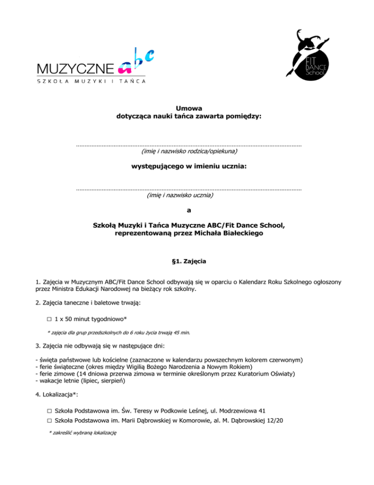 Umowa dotycząca nauki tańca zawarta pomiędzy: …………………………………………………………………………………………………………………… (imię i nazwisko rodzica/opiekuna) występującego w imieniu ucznia: …………………………………………………………………………………………………………………… (imię i nazwisko ucznia) a Szkołą Muzyki i Tańca Muzyczne ABC/Fit Dance School, reprezentowaną przez Michała Białeckiego §1. Zajęcia 1. Zajęcia w Muzycznym ABC/Fit Dance School odbywają się w oparciu o Kalendarz Roku Szkolnego ogłoszony przez Ministra Edukacji Narodowej na bieżący rok szkolny. 2. Zajęcia taneczne i baletowe trwają: □ 1 x 50 minut tygodniowo* * zajęcia dla grup przedszkolnych do 6 roku życia trwają 45 min. 3. Zajęcia nie odbywają się w następujące dni: - święta państwowe lub kościelne (zaznaczone w kalendarzu powszechnym kolorem czerwonym) ferie świąteczne (okres między Wigilią Bożego Narodzenia a Nowym Rokiem) ferie zimowe (14 dniowa przerwa zimowa w terminie określonym przez Kuratorium Oświaty) wakacje letnie (lipiec, sierpień) 4. Lokalizacja*: □ □ Szkoła Podstawowa im. Św. Teresy w Podkowie Leśnej, ul. Modrzewiowa 41 Szkoła Podstawowa im. Marii Dąbrowskiej w Komorowie, al. M. Dąbrowskiej 12/20 * zakreślić wybraną lokalizację §2. Opłata za naukę 1. Opłata za zajęcia jest uiszczana w formie czesnego w wysokości niezmiennej, niezależnie od liczby zajęć w miesiącu. □ □ Miesięczna opłata za zajęcia taneczne i baletowe*: 1 x 50 minut tygodniowo - 80 zł** 2 x 50 minut tygodniowo - 140 zł** * zakreślić właściwe zajęcia, będące przedmiotem umowy ** zajęcia dla grup przedszkolnych do 6 roku życia trwają 45 min. 2. Opłaty należy wnosić z góry do 5 dnia każdego miesiąca na konto: MUZYCZNE ABC MICHAŁ BIAŁECKI 38 1050 1025 1000 0090 9182 4343 z dopiskiem: imię, nazwisko, nazwa zajęć i miesiąc, za który opłata została wniesiona. 3. Za miesiąc, w którym przypadają ferie zimowe opłata wynosi 1/2 czesnego. 4. Za miesiąc wrzesień opłata wyliczana jest wg rzeczywistej liczby odbytych zajęć i regulowana jest wraz z czesnym za październik. Koszt pojedynczych zajęć tanecznych: 45/50 minutowe – 20 zł 5. Zaległości wynoszące wartość dwóch i więcej miesięcznych rat czesnego, skutkują rozwiązaniem umowy i skreśleniem ucznia z listy uczestników zajęć. 6. W wypadku nieobecności nauczyciela opłata za zajęcia zostanie zwrócona proporcjonalnie do liczby odwołanych zajęć. §3. Choroba ucznia 1. W przypadku choroby ucznia należy powiadomić Muzyczne ABC drogą mailową. 2. W przypadku choroby ucznia trwającej minimum 3 tygodnie i udokumentowanej zwolnieniem lekarskim, nie będzie pobierana opłata. Ewentualna nadpłata zostanie zwrócona lub pomniejszy kwotę kolejnej należnej wpłaty. 3. Odstąpienie od zwrotu nadpłaconych pieniędzy - w skutek choroby ucznia - nastąpi, jeśli choroba ucznia nie zostanie zgłoszona w pierwszym tygodniu jej trwania. §4. Czas trwania umowy oraz wypowiedzenie umowy 1. Warunkiem uczestnictwa w zajęciach organizowanych przez Szkołę jest zawarcie niniejszej umowy i dostarczenie jej do nauczyciela prowadzącego zajęcia. 2 2. Umowa zostaje zawarta na czas określony, tj. na rok szkolny 2014/2015. 3. Pierwszy miesiąc od daty podpisania umowy stanowi okres próbny. 4. W przypadku jeśli uczeń nie zechce przedłużyć umowy ponad okres próbny, należy zawiadomić Muzyczne ABC o swojej decyzji drogą mailową najpóźniej na 5 dni roboczych przed zakończeniem miesiąca próbnego. 5. Za okres wypowiedzenia umowy w następnych miesiącach jej trwania uważa się termin 30 dni od daty wpłynięcia do Szkoły Muzyczne ABC pisemnego lub mailowego zawiadomienia o rezygnacji z zajęć. 6. Terminy oraz sposób wypowiedzenia umowy obowiązują obydwie strony. §5. Inne postanowienia umowy 1. Za bezpieczeństwo uczniów w drodze do szkoły jak i po zajęciach, odpowiedzialni są rodzice lub opiekunowie. 2. Rodzic/opiekun wyraża zgodę na publikację wizerunku dziecka w tym na fotografowanie, rejestrowanie audycji, koncertów, występów itp. wydarzeń organizowanych przez szkołę. 3. Dzieci zobowiązane są do zmiany obuwia na terenie szkoły. 4. Wszelkie zmiany czy uzupełnienia niniejszej umowy muszą nastąpić w formie pisemnej. 5. Kontakt do Szkoły: tel. 662-787-873, 881-601-501, [email protected], www.muzyczneabc.edu.pl, [email protected], www.fitdanceschool.pl 6. Umowa zostaje sporządzona w dwóch jednobrzmiących egzemplarzach dla każdej ze stron. 7. Jeśli któryś z paragrafów niniejszej umowy ulegnie zmianie, pozostałe paragrafy zachowują swą moc prawną. 8. W sprawach nie unormowanych niniejszą umową mają zastosowanie odnośne przepisy Kodeksu Cywilnego. ………………………………………… ……..………………………………… Muzyczne ABC/Fit Dance School data i podpis rodzica/opiekuna 3 Karta zgłoszeniowa ……………………………………………………………………… Rodzaj zajęć (taniec nowoczesny/balet/instrument) ……………………………………………………………………… Imię i nazwisko dziecka ................................................................................................ Imię i nazwisko rodzica/prawnego opiekuna ……………………………………………………………………………………………… Telefon kontaktowy rodzica/prawnego opiekuna ……………………………………………………………………………………………… Adres e-mail rodzica/prawnego opiekuna ……………………………………………………………………………………………… Skąd dowiedzieli się Państwo o naszej szkole? ……………………………………………… data i podpis rodzica/opiekuna 4