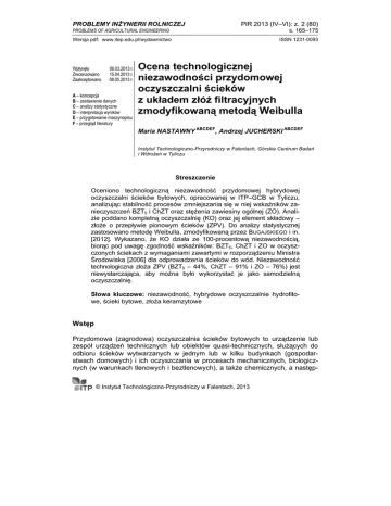 PROBLEMY INŻYNIERII ROLNICZEJ PIR 2013 (IV–VI): z. 2 (80) s. 165–175 PROBLEMS OF AGRICULTURAL ENGINEERING Wersja pdf: www.itep.edu.pl/wydawnictwo Wpłynęło Zrecenzowano Zaakceptowano 06.03.2013 r. 15.04.2013 r. 08.05.2013 r. A – koncepcja B – zestawienie danych C – analizy statystyczne D – interpretacja wyników E – przygotowanie maszynopisu F – przegląd literatury ISSN 1231-0093 Ocena technologicznej niezawodności przydomowej oczyszczalni ścieków z układem złóż filtracyjnych zmodyfikowaną metodą Weibulla Maria NASTAWNY ABCDEF, Andrzej JUCHERSKI ABCDEF Instytut Technologiczno-Przyrodniczy w Falentach, Górskie Centrum Badań i Wdrożeń w Tyliczu Streszczenie Oceniono technologiczną niezawodność przydomowej hybrydowej oczyszczalni ścieków bytowych, opracowanej w ITP–GCB w Tyliczu, analizując stabilność procesów zmniejszania się w niej wskaźników zanieczyszczeń BZT5 i ChZT oraz stężenia zawiesiny ogólnej (ZO). Analizie poddano kompletną oczyszczalnię (KO) oraz jej element składowy – złoże o przepływie pionowym ścieków (ZPV). Do analizy statystycznej zastosowano metodę Weibulla, zmodyfikowaną przez BUGAJSKIEGO i in. [2012]. Wykazano, że KO działa ze 100-procentową niezawodnością, biorąc pod uwagę zgodność wskaźników: BZT5, ChZT i ZO w oczyszczonych ściekach z wymaganiami zawartymi w rozporządzeniu Ministra Środowiska [2006] dla odprowadzenia ścieków do wód. Niezawodność technologiczna złoża ZPV (BZT5 – 44%, ChZT – 91% i ZO – 76%) jest niewystarczająca, aby można było wykorzystać je jako samodzielną oczyszczalnię. Słowa kluczowe: niezawodność, hybrydowe oczyszczalnie hydrofitowe, ścieki bytowe, złoża keramzytowe Wstęp Przydomowa (zagrodowa) oczyszczalnia ścieków bytowych to urządzenie lub zespół urządzeń technicznych lub obiektów quasi-technicznych, służących do odbioru ścieków wytwarzanych w jednym lub w kilku budynkach (gospodarstwach domowych) i ich oczyszczania w procesach mechanicznych, biologicznych (w warunkach tlenowych i beztlenowych), a także chemicznych, a następ© Instytut Technologiczno-Przyrodniczy w Falentach, 2013 Maria Nastawny, Andrzej Jucherski nie odprowadzania do odbiornika (gruntu, wody) po oczyszczeniu w stopniu określonym w obowiązujących przepisach. Jednym z przykładów takiej oczyszczalni jest quasi-techniczna instalacja ze złożem gruntowo-roślinnym, będąca autorskim rozwiązaniem Górskiego Centrum Badań i Wdrożeń w Tyliczu Instytutu Technologiczno-Przyrodniczego. W skład instalacji wchodzą: osadnik gnilny, złoże pionowe, złoże stokowe i zanikowe oczko wodne [JUCHERSKI 2007; JUCHERSKI, WALCZOWSKI 2006]. Liczba i różnorodność tworzących ją elementów umożliwia bardzo skuteczne usuwanie zanieczyszczeń ze ścieków (średnio BZT5 w 98%, ChZT w 94%, azot całkowity w 60%), zarówno w okresach wiosenno-letnich, jak i jesienno-zimowych [JUCHERSKI 2007]. W celu zachowania odbiorników ścieków w stanie niepogorszonym istotne jest, aby oczyszczalnia przydomowa zachowywała stabilną i wymaganą skuteczność oczyszczania przez cały czas jej działania, począwszy od dnia rozruchu, aż do końca planowanego czasu zakończenia eksploatacji. Małe i mikrooczyszczalnie, z reguły funkcjonujące bez stałego nadzoru, mogą częściej ulegać awariom [MASSOUD i in. 2009; PLATZER, MAUCH 1997]. Narażone są też na specyficzną nierównomierność w ilości i jakości dopływających ścieków w czasie eksploatacji [OLIVEIRA, STERLING 2008], a oddziaływanie na nie czynników pogodowych jest znacząco większe niż w oczyszczalniach zbiorczych. Z tych powodów oczyszczane ścieki mogą okresowo nie spełniać założonych parametrów i wymagań. Miarą technologicznej poprawności rozwiązań oczyszczalni jest, oprócz stopnia skuteczności procesów zmniejszania ładunków zanieczyszczeń, ich niezawodność działania, oceniana wskaźnikiem stabilności efektów oczyszczania. Jedną z metod przyjętych do oceny tej niezawodności jest metoda wykorzystująca rozkład Weibulla [BUGAJSKI i in. 2012; WAŁĘGA 2009]. Niezawodność oczyszczalni jest to prawdopodobieństwo spełnienia przez nią określonych wymogów, dotyczących jakości oczyszczania w określonym czasie i w danych warunkach [OLIVEIRA, STERLING 2008], wyrażone jako procentowy udział czasu w roku, w którym wartości wskaźników zanieczyszczeń w oczyszczonych ściekach nie przekraczają dopuszczalnego poziomu. Celem pracy była próba oceny niezawodności procesu oczyszczania ścieków z wykorzystaniem zmodyfikowanej metody Weibulla w quasi-technicznej przydomowej oczyszczalni, opracowanej w GCB-Tylicz, oraz stwierdzenie, czy metoda ta oddaje istotę tej oceny. Oceną objęto wskaźniki zanieczyszczenia ścieków BZT5, ChZT oraz stężenie zawiesiny ogólnej, w odniesieniu do wymagań zawartych w rozporządzeniu Ministra Środowiska z dnia 24 lipca 2006 r. w sprawie warunków, jakie należy spełnić przy wprowadzaniu ścieków do wód lub ziemi, oraz w sprawie substancji szczególnie szkodliwych dla środowiska wodnego [Rozporządzenie MŚ… 2006], określonych dla ścieków wprowadzanych do wód. Analiza miała również na celu ocenę działania podstawowego elementu oczyszczalni, tj. złoża o przepływie pionowym ścieków, pod kątem możliwości jego zastosowania jako samodzielnej jednostki oczyszczającej. 166 © ITP w Falentach; PIR 2013 (IV–VI): z. 2 (80) Ocena technologicznej niezawodności przydomowej oczyszczalni… Przedmiot i metoda badań Przedmiotem badań była quasi-techniczna przydomowa oczyszczalnia ścieków, opracowana w GCB-Tylicz, w układzie zaproponowanym i opisanym szczegółowo przez JUCHERSKIEGO i WALCZOWSKIEGO [2006], eksploatowana od 2005 r. w gospodarstwie agroturystycznym w Krynicy Zdroju (Słotwiny). W skład oczyszczalni wchodzą: − 3-komorowy, monolityczny, przepływowy osadnik gnilny o objętości czynnej 6 m3, z klasycznym podzi