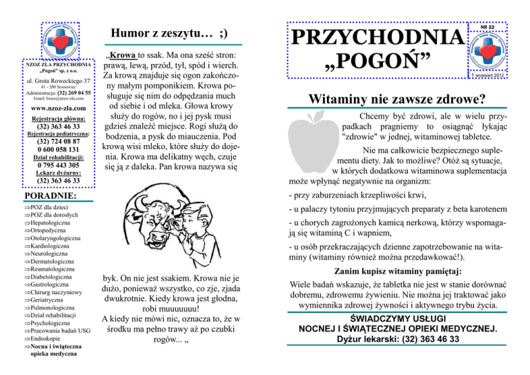 Humor z zeszytu… ;) NZOZ ZLA PRZYCHODNIA „Pogoń” sp. z o.o. ul. Grota Roweckiego 37 41 - 200 Sosnowiec Administracja: (32) 269 04 55 Email: [email protected] www.nzoz-zla.com Rejestracja główna: (32) 363 46 33 Rejestracja pediatryczna: (32) 724 08 87 0 600 058 131 Dział rehabilitacji: 0 795 443 305 Lekarz dyżurny: „Krowa to ssak. Ma ona sześć stron: prawą, lewą, przód, tył, spód i wierch. Za krową znajduje się ogon zakończony małym pomponikiem. Krowa posługuje się nim do odpędzania much od siebie i od mleka. Głowa krowy służy do rogów, no i jej pysk musi gdzieś znaleźć miejsce. Rogi służą do bodzenia, a pysk do miauczenia. Pod krową wisi mleko, które służy do dojenia. Krowa ma delikatny węch, czuje się ją z daleka. Pan krowa nazywa się (32) 363 46 33 PRZYCHODNIA „POGOŃ” NR 22 1 wrzesień 2012 Witaminy nie zawsze zdrowe? Chcemy być zdrowi, ale w wielu przypadkach pragniemy to osiągnąć łykając "zdrowie" w jednej, witaminowej tabletce. Nie ma całkowicie bezpiecznego suplementu diety. Jak to możliwe? Otóż są sytuacje, w których dodatkowa witaminowa suplementacja może wpłynąć negatywnie na organizm: PORADNIE: - przy zaburzeniach krzepliwości krwi, ⇒POZ dla dzieci ⇒POZ dla dorosłych ⇒Hepatologiczna ⇒Ortopedyczna ⇒Otolaryngologiczna ⇒Kardiologiczna ⇒Neurologiczna ⇒Dermatologiczna ⇒Reumatologiczna ⇒Diabetologiczna ⇒Gastrologiczna ⇒Chirurg naczyniowy ⇒Geriatryczna ⇒Pulmonologiczna ⇒Dział rehabilitacji ⇒Psychologiczna ⇒Pracowania badań USG ⇒Endoskopie ⇒Nocna i świąteczna opieka medyczna - u palaczy tytoniu przyjmujących preparaty z beta karotenem - u chorych zagrożonych kamicą nerkową, którzy wspomagają się witaminą C i wapniem, - u osób przekraczających dzienne zapotrzebowanie na witaminy (witaminy również można przedawkować!). byk. On nie jest ssakiem. Krowa nie je dużo, ponieważ wszystko, co zje, zjada dwukrotnie. Kiedy krowa jest głodna, robi muuuuuuu! A kiedy nie mówi nic, oznacza to, że w środku ma pełno trawy aż po czubki rogów... „ Zanim kupisz witaminy pamiętaj: Wiele badań wskazuje, że tabletka nie jest w stanie dorównać dobremu, zdrowemu żywieniu. Nie można jej traktować jako wymiennika zdrowej żywności i aktywnego trybu życia. ŚWIADCZYMY USŁUGI NOCNEJ I ŚWIĄTECZNEJ OPIEKI MEDYCZNEJ. Dyżur lekarski: (32) 363 46 33 Już Cię nie dorwie... Ale kto? Właściwie nie kto a co - RWA KULSZOWA! Przeszywający ból, który pojawia się nieoczekiwanie po wykonaniu gwałtowniejszego ruchu i ustępuje tylko po to, aby za jakiś czas znowu powrócić – właśnie o takiej dolegliwości znaczny odsetek społeczeństwa potrafi opowiadać godzinami. My postaramy się nie tylko opowiadać, ale DZIAŁAĆ! Zapraszamy 6 - go października na aktywne warsztaty „RWA CIĘ NIE DORWIE” wszystkich Pacjentów Przychodni Pogoń oraz Gości. Pokażemy Państwu jak radzić sobie z dolegliwościami oraz jak zapobiegać nawrotom choroby. Kurs Nordic Walking - już wkrótce.. Jeśli jesteś zainteresowany kursem Nordic Walking na miarę Twoich własnych możliwości, już dziś zgłoś się do nas, a my postaramy się zorganizować go dla Ciebie :) Chodzisz z Koleżanką „ na kijkach”, ale nie wiecie czy dobrze? Przyjdź i powiedz nam o tym, a zorganizujemy szkolenie, które zaspokoi Wasze potrzeby. Nie masz kijów do Nordic Walking i nie wiesz czy spodoba Ci się ta forma ruchu, ale chciałbyś spróbować? Zadzwoń i umów się na indywidualny instruktaż. Kontakt w dziale rehabilitacji oraz pod nr.: 795 44 33 05 Dzień bez cholesterolu - 29 wrzesień Zapisy w dziale rehabilitacji oraz pod nr.: 795 44 33 05 Pacjenci z deklaracją POZ - bezpłatnie. Goście - komercyjnie. Na warsztatach obowiązuje strój zmienny (koszulka, spodnie / spodenki, skarpetki). Liczba miejsc ograniczona. • Badanie wad postawy - 29 wrzesień Zapraszamy dzieci wraz z opiekunami do badania wad postawy. Badania przeprowadzi mgr fizjoterapii Magdalena Mońka. Dla dzieci z deklaracją POZ w Przychodni Pogoń badania wykonywane będą BEZPŁATNIE. Zapisy w dziale rehabilitacji oraz pod nr.: 795 44 33 05 Str. 2 P R Z Y C H O D NI A „ P O G O Ń” • • Większość z nas myśli, że cholesterol to coś złego. Tymczasem, dopiero nadmiar cholesterolu faktycznie może nam zaszkodzić. Wysoki poziom „złego cholesterolu” we krwi powoduje wzrost ryzyka zachorowalności na wiele groźnych chorób układu sercowo-naczyniowego: Miażdżyca – cholesterol odkład się na ściankach tętnic, co prowadzi w rezultacie do zmniejszenia (i potem zamknięcia) światła dróg krwionośnych i zatrzymania przepływu krwi. Choroba ta rozwija się powoli, ale jest bardzo groźna. Udar mózgu – efekt niedotlenienia mózgu, którego jedną z przyczyn może być właśnie miażdżyca. Zawał serca – skutek niedokrwienia mięśnia sercowego. Już dziś zapisz się na badania cholesterolu i trójglicerydów. Pacjenci z ABONAMENTEM - BEZPŁATNIE. Rejestracja: (32)363 46 33. R O K 20 1 2, NR 2 2 Str. 3
