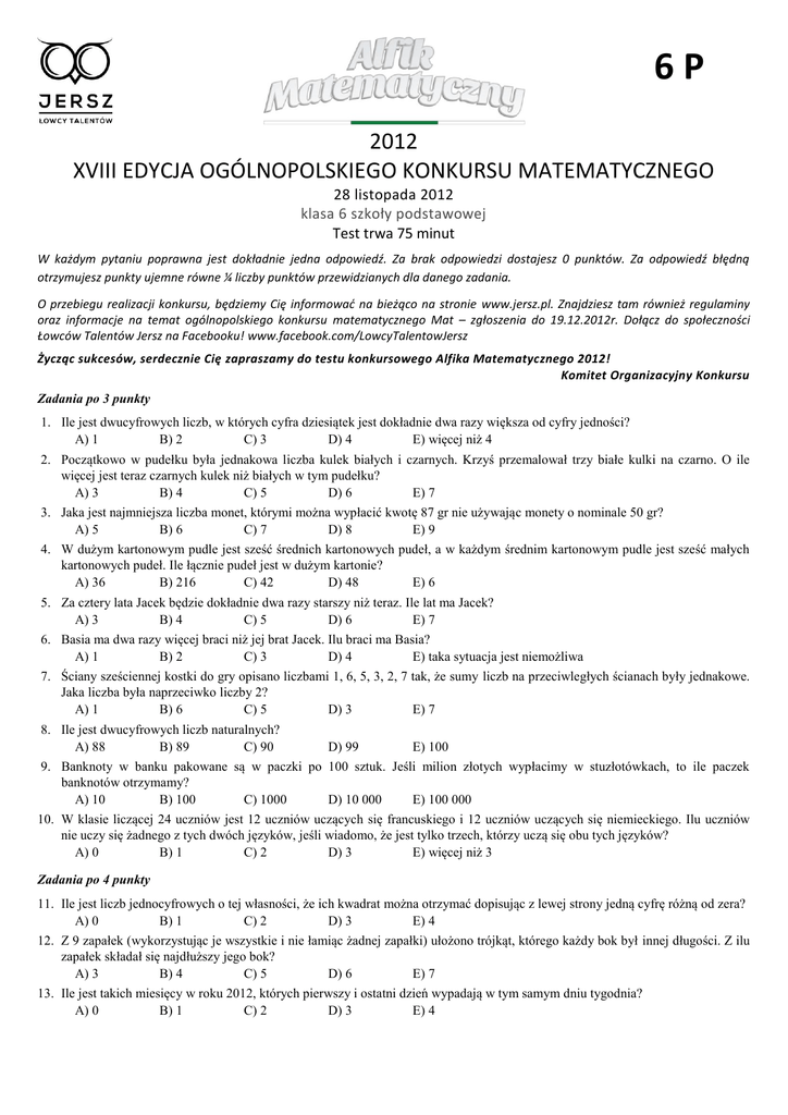 6P 2012 XVIII EDYCJA OGÓLNOPOLSKIEGO KONKURSU MATEMATYCZNEGO 28 listopada 2012 klasa 6 szkoły podstawowej Test trwa 75 minut W każdym pytaniu poprawna jest dokładnie jedna odpowiedź. Za brak odpowiedzi dostajesz 0 punktów. Za odpowiedź błędną otrzymujesz punkty ujemne równe ¼ liczby punktów przewidzianych dla danego zadania. O przebiegu realizacji konkursu, będziemy Cię informować na bieżąco na stronie www.jersz.pl. Znajdziesz tam również regulaminy oraz informacje na temat ogólnopolskiego konkursu matematycznego Mat – zgłoszenia do 19.12.2012r. Dołącz do społeczności Łowców Talentów Jersz na Facebooku! www.facebook.com/LowcyTalentowJersz Życząc sukcesów, serdecznie Cię zapraszamy do testu konkursowego Alfika Matematycznego 2012! Komitet Organizacyjny Konkursu Zadania po 3 punkty 1. Ile jest dwucyfrowych liczb, w których cyfra dziesiątek jest dokładnie dwa razy większa od cyfry jedności? A) 1 B) 2 C) 3 D) 4 E) więcej niż 4 2. Początkowo w pudełku była jednakowa liczba kulek białych i czarnych. Krzyś przemalował trzy białe kulki na czarno. O ile więcej jest teraz czarnych kulek niż białych w tym pudełku? A) 3 B) 4 C) 5 D) 6 E) 7 3. Jaka jest najmniejsza liczba monet, którymi można wypłacić kwotę 87 gr nie używając monety o nominale 50 gr? A) 5 B) 6 C) 7 D) 8 E) 9 4. W dużym kartonowym pudle jest sześć średnich kartonowych pudeł, a w każdym średnim kartonowym pudle jest sześć małych kartonowych pudeł. Ile łącznie pudeł jest w dużym kartonie? A) 36 B) 216 C) 42 D) 48 E) 6 5. Za cztery lata Jacek będzie dokładnie dwa razy starszy niż teraz. Ile lat ma Jacek? A) 3 B) 4 C) 5 D) 6 E) 7 6. Basia ma dwa razy więcej braci niż jej brat Jacek. Ilu braci ma Basia? A) 1 B) 2 C) 3 D) 4 E) taka sytuacja jest niemożliwa 7. Ściany sześciennej kostki do gry opisano liczbami 1, 6, 5, 3, 2, 7 tak, że sumy liczb na przeciwległych ścianach były jednakowe. Jaka liczba była naprzeciwko liczby 2? A) 1 B) 6 C) 5 D) 3 E) 7 8. Ile jest dwucyfrowych liczb naturalnych? A) 88 B) 89 C) 90 D) 99 E) 100 9. Banknoty w banku pakowane są w paczki po 100 sztuk. Jeśli milion złotych wypłacimy w stuzłotówkach, to ile paczek banknotów otrzymamy? A) 10 B) 100 C) 1000 D) 10 000 E) 100 000 10. W klasie liczącej 24 uczniów jest 12 uczniów uczących się francuskiego i 12 uczniów uczących się niemieckiego. Ilu uczniów nie uczy się żadnego z tych dwóch języków, jeśli wiadomo, że jest tylko trzech, którzy uczą się obu tych języków? A) 0 B) 1 C) 2 D) 3 E) więcej niż 3 Zadania po 4 punkty 11. Ile jest liczb jednocyfrowych o tej własności, że ich kwadrat można otrzymać dopisując z lewej strony jedną cyfrę różną od zera? A) 0 B) 1 C) 2 D) 3 E) 4 12. Z 9 zapałek (wykorzystując je wszystkie i nie łamiąc żadnej zapałki) ułożono trójkąt, którego każdy bok był innej długości. Z ilu zapałek składał się najdłuższy jego bok? A) 3 B) 4 C) 5 D) 6 E) 7 13. Ile jest takich miesięcy w roku 2012, których pierwszy i ostatni dzień wypadają w tym samym dniu tygodnia? A) 0 B) 1 C) 2 D) 3 E) 4 14. Ile jest takich trzycyfrowych liczb, które można ułożyć mając do dyspozycji jedynie cyfry 2 i 3 (każdą z nich można użyć dowolną liczbę razy)? A) 3 B) 4 C) 6 D) 8 E) więcej niż 8 15. Szachownicę o wymiarach 5×5 rozcięto na kwadraty w taki sposób, że nie rozcięto żadnego pola i każdy otrzymany kwadrat składał się z nieparzystej liczby pól. Ile kwadratów otrzymano, jeśli wiadomo, że nie wszystkie były tego samego rozmiaru? A) 5 B) 10 C) 15 D) 16 E) więcej niż 16 16. Za trzy lata Marysia będzie trzy razy starsza niż była pięć lat temu. Ile lat ma Marysia? A) 4 lata B) 5 lat C) 6 lat D) 7 lat E) 8 lat lub więcej 17. Do północy została jeszcze połowa tego czasu, który upłynął od południa. Która jest godzina? A) 1600 B) 1700 C) 1800 D) 1900 E) 2000 18. O której godzinie wskazówka godzinowa znajdzie się dokładnie w tym miejscu, w którym wskazówka minutowa znajdowała się o godzinie 817? A) 1510 B) 1515 C) 1520 D) 1524 E) 1525 19. Pewien człowiek urodził się w roku o sumie cyfr równej 10 i zmarł w dniu swoich urodzin, w roku o sumie cyfr równej 28. Ile lat przeżył? A) 90 B) 98 C) 99 D) 100 E) nie da się tego ustalić 20. Jeśli centylitr (cl) ma się do litra tak jak centymetr do metra, to 1 cl jest równy: A) 1 ml B) 10 ml C) 100 ml D) 1000 ml E) mniej niż 1 ml Zadania po 5 punktów 21. Jacek, jadąc rowerem z prędkością 12 km/h, dojeżdża do szkoły w ciągu 15 minut. O ile szybciej musiałby jechać, by dojechać do szkoły o 5 minut szybciej? A) 3 km/h B) 4 km/h C) 5 km/h D) 6 km/h E) 8 km/h 22. Spośród medalistów olimpijskich reprezentacji pewnego państwa dokładnie jedenastu nie zdobyło złotego medalu, dokładnie ośmiu nie zdobyło medalu srebrnego i dokładnie pięciu nie zdobyło medalu brązowego. Ilu medalistów miała ta reprezentacja, jeśli wiemy, że nikt nie zdobył więcej niż jednego medalu? A) 12 B) 13 C) 14 D) 15 E) więcej niż 15 23. Tata rozdzielił między swoje dzieci 18 cukierków tak, że każde dziecko otrzymało dokładnie tyle cukierków, ilu miało braci. Ile dzieci jest w tej rodzinie, jeśli wiadomo, że jest w niej więcej niż dwóch chłopców? A) 3 B) 4 C) 5 D) 6 E) 7 24. Jaka jest najmniejsza kwota, której nie da się wypłacić przy użyciu mniej niż 6 monet? A) 99 gr B) 89 gr C) 98 gr D) 3 zł 66 gr E) inna odpowiedź 25. Na mapie o skali 1 : 50 000 zaznaczono kwadrat o polu 4 cm2. Jakie jest pole zaznaczonej działki w rzeczywistości? A) 1 km2 B) 10 km2 C) 1000 m2 D) 100 m2 E) 10000 m2 26. Pociąg o długości 300 m jadący z prędkością 90 km/h wjechał do tunelu o długości 150 m. Ile czasu pociąg będzie jechał przez tunel, tzn. ile czasu upłynie od momentu wjechania do tunelu lokomotywy, do momentu opuszczenia tunelu przez ostatni wagon? A) 10 s B) 12 s C) 15 s D) 18 s E) inna odpowiedź 27. W p