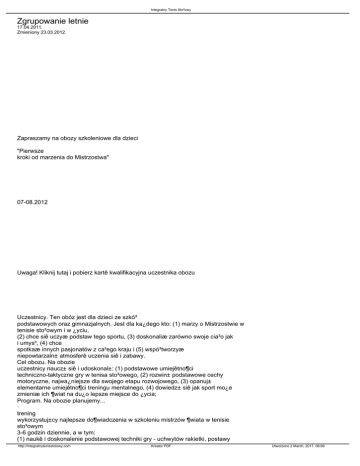Integralny Tenis Sto³owy Zgrupowanie letnie 17.04.2011. Zmieniony 23.03.2012. Zapraszamy na obozy szkoleniowe dla dzieci "Pierwsze kroki od marzenia do Mistrzostwa" 07-08.2012 Uwaga! Kliknij tutaj i pobierz kartê kwalifikacyjna uczestnika obozu Uczestnicy. Ten obóz jest dla dzieci ze szkó³ podstawowych oraz gimnazjalnych. Jest dla ka¿dego kto: (1) marzy o Mistrzostwie w tenisie sto³owym i w ¿yciu, (2) chce siê uczyæ podstaw tego sportu, (3) doskonaliæ zarówno swoje cia³o jak i umys³, (4) chce spotkaæ innych pasjonatów z ca³ego kraju i (5) wspó³tworzyæ niepowtarzaln± atmosferê uczenia siê i zabawy. Cel obozu. Na obozie uczestnicy naucz± siê i udoskonal±: (1) podstawowe umiejêtno¶ci techniczno-taktyczne gry w tenisa sto³owego, (2) rozwin± podstawowe cechy motoryczne, najwa¿niejsze dla swojego etapu rozwojowego, (3) opanuj± elementarne umiejêtno¶ci treningu mentalnego, (4) dowiedz± siê jak sport mo¿e zmieniæ ich ¶wiat na du¿o lepsze miejsce do ¿ycia; Program. Na obozie planujemy... · trening wykorzystuj±cy najlepsze do¶wiadczenia w szkoleniu mistrzów ¶wiata w tenisie sto³owym 3-6 godzin dziennie, a w tym: (1) naukê i doskonalenie podstawowej techniki gry - uchwytów rakietki, postawy http://integralnytenisstolowy.com Kreator PDF Utworzono 2 March, 2017, 06:09 Integralny Tenis Sto³owy gotowo¶ci, pracy nóg, serwów i odbiorów, uderzeñ atakuj±cych i obronnych itp., (2) æwiczenia wieloma pi³kami rozwijaj±ce sprawno¶æ specjaln±, (3) æwiczenia rozwijaj±ce cechy motoryczne - æwiczenia koordynacyjne, gry i zabawy zwinno¶ciowe i szybko¶ciowe, (4) æwiczenia rozci±gaj±ce i kompensacyjne; · trening wykorzystuj±cy najlepsze na ¶wiecie praktyki treningu mentalnego - æwiczenia odporno¶ci psychicznej bêd± wplecione w ca³e zgrupowanie: (1) nauka obserwowania siebie, swojej gry, ale tak¿e swojego cia³a i umys³u; (2) nauka koncentracji na zadaniach szkoleniowych; (3) nauka ró¿nych metod radzenia sobie z emocjami, np. ró¿nych sposobów relaksowania siê i (4) nauka pierwszych kroków do wprowadzania najlepszego stanu psychicznego podczas gry, aby my¶leæ i czuæ siê jak Mistrz Olimpijski; · wewnêtrzne gry i zawody - umo¿liwiaj±ce naukê podstawowych zasad taktycznych gry i sztuki wygrywania; · aktywny wypoczynek - w ramach aktywnego wypoczynku proponujemy co najmniej dwie wycieczki po ustaleniu z uczestnikami: (1) wycieczkê do Woliñskiego Parku Narodowego gdzie ¿yj± ¿ubry, (2) wycieczkê do Muzeum Figur Woskowych; (3) wycieczkê statkiem Viking po morzu; (4) wyj¶cie do Wakacyjnego Teatru na Wyspie; a oprócz tego (5) spacery: po Parku Zdrojowym im. F.Chopina, do lasu, na pla¿ê, na molo, po promenadzie gwiazd oraz k±piel w morzu itp.; Kadra. Dzieæmi zaopiekuj± siê profesjonalni trenerzy, nauczyciele i pedagodzy: · trener Jerzy Grycan - trener klasy mistrzowskiej, trener mentalny, wieloletni trener kadr narodowych Polski i Australii, jego wychowankowie zdobyli setki medali na mistrzostwach krajowych i miêdzynarodowych, autor ksi±¿ki Integralny tenis sto³owy; · trenerka Magdalena Górowska - trenerka II klasy, wieloletnia reprezentantka Polski, wielokrotna Mistrzyni Polski we wszystkich kategoriach wiekowych; · zespó³ do¶wiadczonych trenerów i pedagogów z ca³ego kraju którzy od roku lub dwóch wspó³pracuj± w ramach programu "Od marzenia do Mistrzostwa", wszyscy maj± wieloletnie do¶wiadczenie pracy w edukacji, kulturze fizycznej i sporcie, wszyscy s± pasjonatami o wysokiej kulturze osobistej; Nad bezpieczeñstwem i zdrowiem dzieci, bêd± czuwaæ tak¿e: kierownik obiektu i pielêgniarka. Ten zespó³ ludzi zapewni profesjonaln±, dobr± i ¿yczliw± opiekê a tak¿e zadba o dyscyplinê i dobr± zabawê! Warunki. Co najmniej jeden z obozów odbêdzie siê w Miêdzyzdrojach, piêknej miejscowo¶ci nadmorskiej (zdjêcie Miêdzyzdrojów ): (1) Zakwaterowanie (zdjêcie klasy szkolnej, jednej z tych w których bedziemy zakwaterowani ), sto³ówka (zdjêcie sto³ówki ), hala treningowa (zdjêcie hali oraz zdjêcie si³owni )w Szkole Podstawowej nr 1 im. Boles³awa Chrobrego w Miêdzyzdrojach, ul.Le¶na 17 1,5km od morza; (2) Opiekunowie lub trenerzy powinni przyjechaæ z dzieæmi 30 czerwca miêdzy godzinami 14:00-17:00 i zg³osiæ siê do recepcji obozu; (3) Noclegi w 6-8 osobowych salach szkolnych, wygodne ³ó¿ka, schludne http://integralnytenisstolowy.com Kreator PDF Utworzono 2 March, 2017, 06:09 Integralny Tenis Sto³owy pomieszczenia; (4) Sto³ówka szkolna zapewnia posi³ki dla ca³ej grupy jednocze¶nie - ¶niadania, obiady, podwieczorki i kolacje; (5) Do szko³y nale¿y otwarta prawie rok temu nowoczesna sala im. Andrzeja Grubby z 20 sto³ami wysokiej klasy, nowoczesnym zapleczem, szatniami, prysznicami; (6) Szko³a dysponuje nowoczesnymi boiskami do gier sportowych, obok szko³y jest las ze ¶cie¿kami do biegania; (7) Bêdziemy dysponowaæ aul± do zajêæ z wideo, pokazów filmowych i elementów treningu mentalnego i taktycznego; (8) Wszyscy uczestnicy bêd± mieli ubezpieczenie NW; (9) Opiekunowie i trenerzy powinni odebraæ dzieci (opu¶ciæ obóz) 11 lipca miedzy godzinami 8:30-12:00 Referencje. Co powiedzieli inni o treningu z Jerzym Grycanem? Lucjan B³aszczyk (3-krotny olimpijczyk, Mistrz Europy, 12-krotny medalista Mistrzostw Europy, 30-krotny Mistrz Polski): Jerzemu Grycanowi zawdziêczam, jakim jestem dzi¶ zawodnikiem i cz³owiekiem, tak¿e to, ¿e potrafiê siê cieszyæ gr± w tenisa przez tyle lat. Od niego przej±³em rytua³y, którymi kierujê siê do dzi¶. Adam Haller de Hallenburg (Dyrektor Centrum Counsellingu Gestal w Krakowie, terapeuta, Instruktor jujitsu): Trening tenisa stosowego w propozycji (i wykonaniu) Jurka Grycana to dzia³anie daleko wykraczaj±ce poza sportowy wysi³ek; to praca nad sob± w ujêciu holistycznym, praca rozwijaj±ca w równym stopniu ¶wiadomo¶æ siebie jako tenisisty stosowego , jak i ¶wiadomo¶æ siebie jako cz³owieka oraz jednostki 