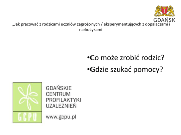 „Jak pracować z rodzicami uczniów zagrożonych / eksperymentujących z dopalaczami i narkotykami •Co może zrobić rodzic? •Gdzie szukać pomocy? Kiedy rozmawiać z rodzicem? – NATYCHMIAST Jak rozmawiać ?: •Tylko na faktach •Wyrażać własne obawy i zdanie •Delikatnie – to sytuacja kryzysowa dla rodzica •Nie oceniać •Skierować do specjalisty Interwencja: •Nauczyciel nie musi być specjalistą •Zauważenie sytuacji ryzykownej i reakcja dorosłych znacznie zmniejsza szansę na kontynuację „brania” w przyszłości •Musi być zgodna z procedurą szkoły •Nauczyciel – przyjacielem „mimo wszystko” (jeżeli to możliwe” Kluczem jest TRIADA Szkoła – Rodzic – Dziecko Następnie Pomoc specjalistyczna lub inne działania •Dzieci w dzisiejszym świecie są samotne •Nie nadążają za wymaganiami otoczenia (szkoła, rodzice, rówieśnicy) •Potrzebują „Mądrych Dorosłych”, którzy będą rozumieć to czego dzieci jeszcze nie widzą •Rodzice i nauczyciele potrzebują wzajemnego wsparcia – to jest możliwe jak jest dialog •Wspólnym celem jest zdrowie dziecka Dlaczego nastolatki sięgają po dopalacze? •Aby zaspokoić ciekawość; •Aby uwolnić się od stresu, problemów; •Chcą być bardziej akceptowani i lubiani, a substancje zmieniające przeżywanie mają im pomóc pozbyć się zahamowań; •Chcą sprawdzić czy po narkotykach rzeczywiście będą bardziej śmiali; Źródło: Jak chronić dziecko przed narkotykami, PARPAMEDIA Dlaczego nastolatki sięgają po dopalacze? •Szukają sposobu na poradzenie sobie w sytuacji trudności w szkole, a dopalacze stają się sposobem na odreagowanie, zapomnienie; •Brak im akceptacji samych siebie, oczekują, że narkotyki pozwolą im stworzyć siebie na nowo; •Uciekają przed trudnymi emocjami, światem, który postrzegają, jako zagrażający i wrogi Źródło: Jak chronić dziecko przed narkotykami, PARPAMEDIA Czynniki ryzyka •Słaba więź ze szkołą, rodziną, kościołem; •Niepowodzenia szkolne; •Przynależność do „problemowych” grup rówieśniczych, tzw. „złe towarzystwo”; •Dostrzeganie aprobaty rówieśników i dorosłych dla zachowań problemowych. Czynniki chroniące •Czynne uczestnictwo w życiu szkoły, rodziny, kościoła, instytucji prospołecznych; •Właściwe „monitorowanie” przez rodziców; •Brak akceptacji dla zachowań odbiegających od norm społecznych. Jakie sygnały mogą wskazywać, że dziecko zaczyna eksperymentować? Na co zwracać uwagę rodzicom – często pomimo oporu •Huśtawka nastrojów, naprzemienne ożywienie, euforia, histeryczny śmiech bez powodu i ospałość ( spowolnione reakcje „zmulenie”); •Napady lęku, przerażenia; •Nadmierny apetyt lub brak apetytu, wzmożone pragnienie; Jakie sygnały mogą wskazywać, że dziecko zaczyna eksperymentować? •Częste wietrzenie pokoju, używanie kadzidełek i odświeżaczy powietrza; •Wypowiedzi zawierające pozytywny stosunek do narkotyków; •Zmiana grona przyjaciół, zwłaszcza na starszych od siebie; •Późne powroty lub nagłe wyjścia z domu; Jakie sygnały mogą wskazywać, że dziecko zaczyna eksperymentować? •Krótkie rozmowy telefoniczne prowadzone półsłówkami; •Zamykanie swojego pokoju na klucz, akcentowanie potrzeby prywatności; •Kłamstwa, wynoszenie wartościowych przedmiotów bądź drobiazgów z domu, podbieranie rodzicom pieniędzy ( początkowo drobnych sum); Jakie sygnały mogą wskazywać, że dziecko zaczyna eksperymentować? •Powtarzające się zgłaszanie przez dziecko zagubień lub kradzieży przez rówieśników drobnych sum pieniędzy; •Kłopoty z koncentracją; •Zmiany w porach spania; kilkanaście godzin snu, bądź bezsenność; Jakie sygnały mogą wskazywać, że dziecko zaczyna eksperymentować? •Porzucenie dotychczasowych zainteresowań;* •Kłopoty w szkole (słabsze oceny, konflikty z nauczycielami, wagary);* •Izolowanie się od innych domowników;* •Zamykanie się w pokoju, niechęć do rozmów;* •Bunt, łamanie obowiązujących w domu zasad;* •Nadmierne reakcje na krytykę na niewielkie nawet niepowodzenia;* *może oznaczać też zmianę rozwojową Co może zrobić rodzic w sytuacji podejrzenia, że nastolatek miał lub ma kontakt z dopalaczami? Rodzic - Nauczyciel •Przeprowadź z dzieckiem rozmowę, nie awanturę. •Nie zaczynaj rozmowy, gdy dziecko jest pod wpływem jakiegoś środka – jest wtedy pobudzone lub wycofane i trudno o konkretną Źródło: Jak chronić dziecko przed narkotykami, PARPAMEDIA Co może zrobić rodzic (…)? •Staraj się zapewnić dziecko, że rozmawiasz z nim, bo się o nie martwisz. •Powstrzymaj się od krytyki i obwiniania. •Nie ufaj zapewnieniom dziecka, że narkotyk należy do kolegi, który zostawił go przez przypadek. •Możesz zrobić test na obecność narkotyków w moczu (pamiętaj, że test można oszukać). Źródło: Jak chronić dziecko przed narkotykami, PARPAMEDIA Co może zrobić rodzic (…)? •Podejmuj rozmowy o wpływie dopalaczy na organizm, ryzyku uzależnienia się, niebezpieczeństwie utraty kontroli nad sobą. •Określ jasno zasady i postawę wobec narkotyków i dopalaczy. Mów wprost, że się nie zgadzasz na palenie lub branie. •Staraj się poznać kolegów swojego dziecka, ale unikaj przepytywania (nastolatek ma silną potrzebę budowanie własnego świata). Źródło: Jak chronić dziecko przed narkotykami, PARPAMEDIA Powinien być uważny Powinien rozmawiać z Rodzic Nie musi być specjalistą od dopalaczy i narkotyków Powinien być blisko Gdańskie Centrum Profilaktyki Uzależnień Punkt Konsultacyjny GCPU ul. Dyrekcyjna 5 (IV piętro), Gdańsk pn-pt w godz. 8:00-15:30 Telefon Interwencyjny GCPU 58 320 44 04 GCPU nie prowadzi terapii uzależnień. FreD goes net 8-godzinny rekomendowany program profilaktyki selektywnej. Adresatem programu są młode osoby w wieku 14-21 lat, które używają substancji psychoaktywnych 