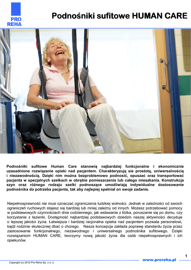 Podnośniki sufitowe HUMAN CARE Podnośniki sufitowe Human Care stanowią najbardziej funkcjonalne i ekonomicznie uzasadnione rozwiązanie opieki nad pacjentem. Charakteryzują sie prostotą, uniwersalnością i niezawodnością. Dzięki nim moŜna bezproblemowo podnosić, opuszać oraz transportować pacjenta w specjalnych szelkach w obrębie pomieszczenia lub całego mieszkania. Konstrukcja szyn oraz róŜnego rodzaju szelki podnoszące umoŜliwiają indywidualne dostosowanie podnośnika do potrzeba pacjenta, tak aby najlepiej spełniał on swoje zadanie. Niepełnosprawność nie musi oznaczać ograniczenia ludzkiej wolności. Jednak w zaleŜności od swoich ograniczeń ruchowych stajesz się bardziej lub mniej zaleŜny od innych. MoŜesz potrzebować pomocy w podstawowych czynnościach dnia codziennego, jak wstawanie z łóŜka, poruszanie się po domu, czy korzystanie z łazienki. Dostępność najbardziej podstawowych dziedzin naszej aktywności decyduje o lepszej jakości Ŝycia. Łatwiejsza i bardziej racjonalna opieka nad pacjentem pozwala personelowi, bądź rodzinie skuteczniej dbać o chorego. Nasza koncepcja zakłada poprawę standardu Ŝycia przez zastosowanie funkcjonalnego, niezawodnego i uniwersalnego podnośnika sufitowego. Dzięki rozwiązaniom HUMAN CARE, tworzymy nową jakość Ŝycia dla osób niepełnosprawnych i ich opiekunów. 1 Copyright (c) 2010 Pro Reha Sp. z o. o. www.proreha.pl Podnośniki sufitowe HUMAN CARE Podnośnik sufitowy SINGEL 5100 SINGEL™ 5100 jest podnośnikiem sufitowym pozwalającym na transport pacjenta po prowadnicach torowiska w obrębie jednego pomieszczenia lub kilku jeśli prowadnice są ze sobą połączone w sposób ciągły bez przerw na np.: drzwi. Kaseta podnosząca moŜe być odczepiona i w razie konieczności przeniesiona w inne miejsce a następnie podpięta do znajdującej się tam szyny. Prowadnice torowiska mogą być montowane do sufitu, ściany lub być w konstrukcji wolnostojącej. Są one podczas montaŜu docinane do wymiarów konkretnego pomieszczenia. Osobę podpiętą do podnośnika za pomocą specjalnych szelek moŜna w łatwy i bezpieczny sposób przetransportować z np.: wózka inwalidzkiego do toalety, wanny, łóŜka itp. Podnośnik sufitowy ROOMER 5200 ROOMER 5200™ jest odmianą podnośnika sufitowego, w którym kaseta podnosząc wyposaŜona jest w dwa paski podnoszące. System ten umoŜliwia łatwe i bezpieczne przepięcie osoby podnoszonej bez konieczności jej odpinania, na inna szynę. To unikalne rozwiązanie umoŜliwia transport w obrębie kilku pomieszczeń lub nawet całego mieszkania za pomocą jednego podnośnika Parametry urządzenia Udźwig: 220 kg Zakres podnoszenia: 0 – 1500 mm Prędkość: 0,03 m/s, bez obciąŜenia 0,05 m/s Wersja: SINGEL – bez przewieszenia, ROOMER z przewieszeniem Zasilanie: wbudowane akumulatory 2x12 V ładowane z gniazdka 230 V Torowisko: profile wykonane ze stopu aluminium Mocowanie: do sufitu, ściany lub konstrukcji wolnostojącej Wymiary kasety: SINGEL 450 x 325 x 175 mm, ROOMER 500 x 370 x 192 mm Waga kasety: SINGEL 9,9 kg , ROOMER 12,9 kg Copyright (c) 2010 Pro Reha Sp. z o. o. 2 www.proreha.pl Podnośniki sufitowe HUMAN CARE Bezpieczeństwo i komfort • Podnośnik Human Care wyposaŜony jest w system zabezpieczający przed samoczynnym opuszczaniem oraz umoŜliwiający opuszczenie awaryjne np. w przypadku rozładowania akumulatorów • Obsługa urządzenia odbywa się za pomocą pilota na kablu spiralnym lub przycisków na kasecie podnoszącej. Dzięki zastosowaniu systemu DualSpeed podnośnik moŜe szybciej działać w momencie gdy nie jest obciąŜony • Urządzenie ma wbudowane akumulatory, które w łatwy sposób moŜna ładować z gniazdka sieciowego za pomocą ładowarki znajdującej sie w zestawie. Na kasecie znajdują się diody informujące o rozładowywaniu akumulatorów • Uchwyty mocujące umoŜliwiają szybkie zamocowanie szelek podnoszących, jednocześnie zapobiegają ich przypadkowemu wypięciu • Obudowa kasety podnoszącej wykonana jest z trwałego i odpornego na uszkodzenia mechaniczne materiału. Zabezpiecza ona takŜe mechanizmy wewnętrzne przed działaniem wilgoci i kurzu. Elementy metalowe wykonane są ze stali nierdzewnej odpornej na korozję •Kasetę podnosząca moŜna w szybki i łatwy sposób wypiąć z torowiska i przenieś na inną szynę. Dzięki temu jedna kaseta moŜe obsłuŜyć kilka pomieszczeń . • Poprzeczka do zamocowania szelek posiada regulowaną w trzech pozycjach szerokości, dzięki czemu podnośnik moŜna lepiej dostosować do potrzeb konkretnego uŜytkownika 3 Copyright (c) 2010 Pro Reha Sp. z o. o. www.proreha.pl Podnośniki sufitowe HUMAN CARE Szelki podnoszące Podnośnik moŜna wyposaŜyć w róŜnego rodzaju szelki podnoszące, które moŜna dobrać do potrzeb i rozmiarów konkretnej osoby. RóŜną sie one budową oraz materiałem z jakiego są wykonane. Uwzględniają anatomiczny kształt ciała człowieka oraz dzięki dzielonym segmentom pod nogi są łatwe do zakładania kiedy pacjent jest w pozycji siedzącej lub leŜącej. Odpowiedni dobór szelek zapewnia komfort oraz bezpieczeństwo podczas uŜywania urządzenia. Rozmiary: dziecięce JS, JM, JL, dla osób dorosłych: S, M, L, XL Rodzaje: kąpielowe, transportowe, komfortowe, toaletowe, z podparciem głowy, pionizujące, po amputacji Torowisko Profile szyn torowiska podnośników Human Care wykonane są z wytrzymałego i lekkiego stopu aluminium. Mogą być one łączone i docinane w celu uzyskania ciągłości połączenia oraz dopasowania do danego pomieszczenia lub mieszkania. Mocowanie odbywa się do sufitu, ścian, lub konstrukcji wolnostojącej. Specjalny układ szyny – trawers umoŜliwi obsługę przez podnośnik kaŜdego miejsca w pomieszczeniu. Rodzaje: odcinki proste 2.5 m, 3.2 m, 4 m, 5 m, 6,5 m zakręty 30°, 45°, 60°, 90° Przykładowe oszynowanie mieszkania Balkon - odcinek prosty i zakręt 90° Drzwi -przewieszenie (podnośnik ROOME