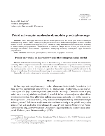 ZAGADNIENIA NAUKOZNAWSTWA 4 (210), 2016 PL ISSN 0044 – 1619 Andrzej H. Jasiński* Wydział Zarządzania Uniwersytet Warszawski, Warszawa Polski uniwersytet na drodze do modelu przedsiębiorczego Abstrakt. Polski tradycyjny uniwersytet jest na drodze prowadzącej do „stacji” pod nazwą: Uniwersytet Przedsiębiorczy. Szeroki zakres komercjalizacji wyników badań oraz intensywna współpraca uczelni z sektorem biznesu to dwie – wzajemnie ze sobą powiązane – zasadnicze cechy przedsiębiorczego uniwersytetu, stanowiące istotne źródła jego przychodów. Drogowskazem na drodze do takiego modelu uczelni jest strategia zdecydowanego rozszerzenia, zróżnicowania i usprawniania współpracy badawczej uniwersytetu z jego otoczeniem gospodarczym. Słowa kluczowe: uniwersytet, przedsiębiorczy uniwersytet, współpraca badawcza Polish university on its road towards the entrepreneurial model Abstract. Polish traditional university stands on the road leading to “the station” named: An entrepreneurial University. A broad range of research results’ commercialization and an intensive cooperation between a university and the business sector are two – mutually tided with each other – basic features of the entrepreneurial University creating essential sources of its revenues. A signpost on the road towards such model of a university is the strategy of broadening, diversification and streamlining its research cooperation with the economic environment. Keywords: university, entrepreneurial university, research cooperation Wstęp1 Wobec wyzwań współczesnego rynku, klasyczne funkcje/role (terminów tych będę używał zamiennie) uniwersytetu, tj. edukacyjna i badawcza, są już niewystarczające dla jego sprawnego funkcjonowania i rozwoju. Ostatnio coraz więcej mówi się o trzeciej, dodatkowej funkcji uczelni, która związana jest ze zjawiskiem przedsiębiorczości. Stąd głównym celem niniejszego artykułu jest próba odpowiedzi na pytanie: Co należy robić, żeby polski uniwersytet stał się przedsiębiorczym uniwersytetem? Założenie wyjściowe stanowi teza mówiąca, że polski tradycyjny uniwersytet jest na drodze prowadzącej do „stacji” pod nazwą: Uniwersytet Przedsiębiorczy (z ang. Entrepreneurial University). Egzemplifikację stanowi tutaj przypadek Uniwersytetu Warszawskiego (UW). * Adres do korespondencji: Wydział Zarządzania UW, ul. Szturmowa 1/3, 02-678 Warszawa, e-mail: [email protected] 1 Autor wyraża podziękowanie szczególnie jednemu z anonimowych recenzentów za wielce konstruktywne uwagi do pierwszej wersji niniejszego artykułu. 470 ANDRZEJ H. JASIŃSKI Opracowanie to stanowi znacznie rozszerzoną, uaktualnioną i poprawioną wersję artykułu, który ukazał się w języku angielskim w czasopiśmie „OPTIMUM. Studia Ekonomiczne” nr 5 z 2015 roku (Jasiński 2015a). Ten zaś oparty był na referacie autora pt. University of Warsaw on its road towards the model of entrepreneurial university, wygłoszonym na międzynarodowej konferencji naukowej nt. An entrepreneurial university and its role in the regional Triple Helix model, Warsaw–Bialystok, 18–19 June 2015. 1. Idea przedsiębiorczego uniwersytetu W Deklaracji Stowarzyszenia Uniwersytetów Europejskich z 2005 roku stwierdzono, że konieczne jest przekształcanie uniwersytetów tradycyjnych w przedsiębiorcze i utrwalanie tych zmian. Z kolei w dokumentach OECD, Banku Światowego i UNESCO mówi się o trzech zasadniczych wyzwaniach stojących obecnie przed uniwersytetami. Mianowicie chodzi o konieczność (Leja 2013, 57 i 154): 1) zmiany charakteru relacji uniwersytetów z otoczeniem, 2) poszukiwania nowych źródeł ich finansowania oraz 3) lepszego wykorzystania przez nie środków publicznych. Pojęcia „przedsiębiorczy uniwersytet” użył jako pierwszy Clark w 1998 roku, a spopularyzował Etzkowitz (2002). Musimy jednak cofnąć się o kilka lat, kiedy została opublikowana praca Gibbonsa i in. (1994). Autorzy wprowadzili pojęcie trybu produkcji wiedzy i stwierdzili wykształcenie się trybu 2 (z ang. mode 2) – w odróżnieniu od wcześniej panującego trybu 1. Wśród cech charakterystycznych trybu 2, Autorzy wskazali na „produkcję wiedzy w kontekście zastosowań” (Gibbons i in. 1994, 3). Wprawdzie nie używali pojęcia przedsiębiorczej uczelni, ale można domyślać się, że Autorom chodziło zwłaszcza o uniwersytet jako główne miejsce tworzenia nowej wiedzy naukowo-technicznej w krajach wysoko uprzemysłowionych. Koncepcja zespołu Gibbonsa legła u podstaw pojawienia się idei przedsiębiorczej uczelni. Według Etzkowiza (2002), koncepcja ta opiera się na czterech filarach: 1) przywództwie akademickim zdolnym do formułowania i wdrażania strategii, 2) nadzorze nad prawidłowością wykorzystania zasobów uczelni, 3) zdolności uniwersytetu do transferu technologii/wiedzy, produkowania patentów i tworzenia inkubatorów przedsiębiorczości, 4) etosie przedsiębiorczości w środowisku akademickim. Jego zdaniem, współczesny, przedsiębiorczy uniwersytet to już nie jest „wieża z kości słoniowej”, lecz globalny motor ekonomiczny (Etzkowitz 2014). Dla Clarka (1998) jedną z pięciu fundamentalnych cech takiej uczelni jest dywersyfikacja źródeł finansowania. Zróżnicowanie to oznacza, że – obok dotacji i opłat za studia – poszukuje się trzeciego strumienia finansowania (z ang. thirdparty funding), tj. środków od sektora biznesu, samorządu lokalnego i absolwentów, a także z tytułu ochrony praw własności intelektualnej czy usług oferowanych POLSKI UNIWERSYTET NA DRODZE DO MODELU PRZEDSIĘBIORCZEGO 471 przez kampus uniwersytecki (Leja 2013, 67). Innymi słowy, szeroki zakres komercjalizacji wyników badań oraz intensywna współpraca uczelni z sektorem biznesu to dwie – wzajemnie ze sobą powiązane – zasadnicze cechy przedsiębiorczego uniwersytetu, stanowiące istotne źródła przychodów takiego uniwersytetu. W literaturze panuje d