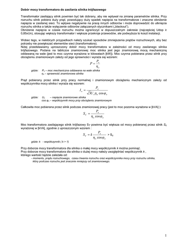 Dobór mocy transformatora do zasilania silnika trójfazowego Transformator zasilający silnik powinien być tak dobrany, aby nie wpływał na zmianę parametrów silnika. Przy rozruchu silnik pobiera duży prąd, powodujący duży spadek napięcia na transformatorze i znaczne obniżenie napięcia w zasilanej sieci. To wpływa negatywnie na pracę innych odbiorów i może doprowadzić do utknięcia rozruchu silnika a także wyłączenie odbiorów załączanych stycznikami („blackout”). Obniżenie napięcia w czasie rozruchu można ograniczyć w dopuszczalnym zakresie (najczęściej Udop ≥ 0,85xUn), stosując większy transformator i większe przekroje przewodów, ale podwyższa to koszt instalacji. Wobec tego, w niektórych przypadkach należy szukać sposobów zmniejszenia prądów rozruchowych, aby bez potrzeby nie powiększać elementów sieci (transformatora). Niżej przedstawiamy uproszczony dobór mocy transformatora w zależności od mocy zasilanego silnika trójfazowego. Podana na tabliczce znamionowej moc silnika jest jego znamionową mocą mechaniczną oddawaną na wale (jest to moc czynna wyrażona w kilowatach [kW]). Moc czynna pobierana przez silnik przy obciążeniu znamionowym zależy od jego sprawności i wyraża się wzorem: P= gdzie: Pn hn Pn – moc mechaniczna oddawana na wale silnika ηn – sprawność znamionowa silnika Prąd pobierany przez silnik przy pracy normalnej i znamionowym obciążeniu mechanicznym zależy od współczynnika mocy silnika i wyraża się wzorem: In = gdzie: Pn 3U nh n cos j n Un – napięcie znamionowe silnika cos φn – współczynnik mocy przy obciążeniu znamionowym Całkowita moc pobierana przez silnik podczas znamionowej pracy (jest to moc pozorna wyrażona w [kVA] ): SC = Pn h n cos j n Moc transformatora zasilającego silnik trójfazowy ST powinna być większa od mocy pobieranej przez silnik Sc wyrażonej w [kVA], zgodnie z uproszczonym wzorem : ST = k Pn > Sc h n cos j n gdzie: k - współczynnik ( k > 1) Przy doborze mocy transformatora dla silnika o małej mocy współczynnik k można pominąć. Przy doborze mocy transformatora dla silnika o dużej mocy należy uwzględniać współczynnik k , którego wartość będzie zależała od: - momentu, prądu rozruchowego, czasu trwania rozruchu oraz współczynnika mocy przy rozruchu silnika, który podczas rozruchu jest znacznie mniejszy od znamionowego. 1
