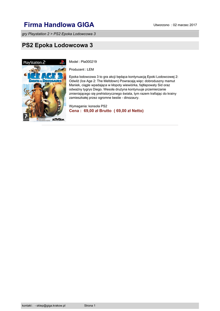 Firma Handlowa GIGA Utworzono : 02 marzec 2017 gry Playstation 2 > PS2 Epoka Lodowcowa 3 PS2 Epoka Lodowcowa 3 Model : Pla000219 Producent : LEM Epoka lodowcowa 3 to gra akcji będąca kontynuacją Epoki Lodowcowej 2: Odwilż (Ice Age 2: The Meltdown) Powracają więc: dobroduszny mamut Maniek, ciągle wpadająca w kłopoty wiewiórka, fajtłapowaty Sid oraz odważny tygrys Diego. Wesoła drużyna kontynuuje przemierzanie zmieniającego się prehistorycznego świata, tym razem trafiając do krainy zamieszkałej przez ogromne bestie - dinozaury. Wymagania: konsola PS2 Cena : 69,00 zł Brutto ( 69,00 zł Netto) kontakt : - [email protected] Strona 1