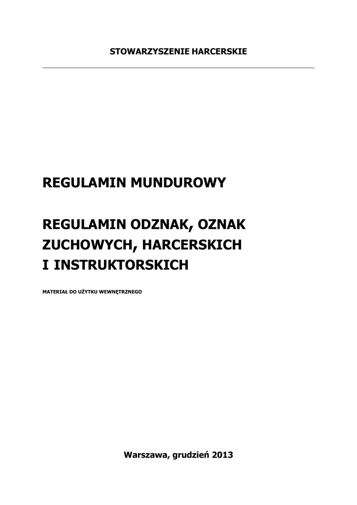 STOWARZYSZENIE HARCERSKIE REGULAMIN MUNDUROWY REGULAMIN ODZNAK, OZNAK ZUCHOWYCH, HARCERSKICH I INSTRUKTORSKICH MATERIAŁ DO UŻYTKU WEWNĘTRZNEGO Warszawa, grudzień 2013 WSTĘP Niniejsze dokumenty zostały przyjęte dnia 11.12.2013 roku uchwałą Naczelnictwa Stowarzyszenia Harcerskiego (Uchwała nr 3/2013). POSTANOWIENIA OGÓLNE Każdy członek Stowarzyszenia Harcerskiego jest zobowiązany dbać o estetyczny wygląd munduru i nosić go zgodnie z wymaganiami niniejszego regulaminu, mając świadomość, że swym wyglądem, postawą i postępowaniem reprezentuje harcerską rodzinę oraz SH. Członkowie Stowarzyszenia Harcerskiego mają obowiązek występować w mundurze podczas zajęć organizacyjnych i w czasie wykonywania obowiązków służbowych. Rodzaj i szczegóły umundurowania określa się w gromadzie zuchowej, bądź w drużynie harcerskiej, stosując się do postanowień niniejszego regulaminu oraz zachowując zasadę, że wszyscy członkowie drużyny umundurowani są jednolicie. Każda jednostka organizacyjna jest zobowiązana do stworzenia własnego regulaminu mundurowego określającego szczegółowe wytyczne dotyczące poszczególnych elementów umundurowania. Regulaminy jednostek zatwierdza bezpośredni zwierzchnik (Załącznik nr 1 „Regulamin mundurowy gromady” lub Załącznik nr 2 „Regulamin mundurowy drużyny”). I. REGULAMIN MUNDUROWY 1. Mundur organizacyjny zuchów 1.1. Mundur a) Dziewczęta: Mundur typu fartuch w kolorze szarym, z kołnierzem, bez karczka, bez naramienników. Z przodu zapinany na całej długości, na okrągłe plastikowe guziki w kolorze szarym, z gładkim obrzeżem, w środku groszkowane. Mundur ma cztery nakładane kieszenie – dwie na wysokości klatki piersiowej i dwie na wysokości bioder, z patkami zapinanymi na guziki. Dolne rogi kieszeni ścięte. Rękawy koszulowe długie, ujęte w mankiety zapinane na 2 guziki. Rozcięcie w rękawie tak długie, aby można było zawijać go powyżej łokcia. W talii mundur spina pas zuchowy. b) Chłopcy: Bluza mundurowa w kolorze ciemnozielonym. Prosta, z kołnierzem, bez karczka, wpuszczana w spodnie, bez naramienników. Z przodu zapinana na całej długości, na okrągłe plastikowe guziki w kolorze khaki, z gładkim obrzeżem, w środku groszkowane. Bluza ma dwie nakładane kieszenie na wysokości klatki piersiowej, z patkami zapinanymi na guziki. Dolne rogi kieszeni ścięte. Rękawy koszulowe długie, ujęte w mankiety zapinane na guziki. Rozcięcie w rękawie tak długie, aby można było zawijać go powyżej łokcia. Długie spodnie w kolorze ciemnym, jednolite dla całej gromady. Krótkie spodnie w kolorze ciemnym, jednolite dla całej gromady. Spodnie spina pas zuchowy. 1.2. Chusta Chusta w kształcie trójkąta o bokach 70×70×100 cm, w kolorach wybranych przez gromadę; spięta suwakiem, pierścieniem lub wiązana (jednolicie dla całej gromady), noszona pod kołnierzem. Dopuszcza się noszenie chust dwukolorowych oraz naszycie oznak danej jednostki. 1.3. Pas zuchowy Pas szerokości 25 mm, wykonany ze skóry lub tworzywa skóropodobnego w kolorze brązowym lub typu parcianego w kolorze zielonym lub czarnym. Pas spina dwuczęściowa klamra metalowa o średnicy 40 mm. W części środkowej klamry umieszczony jest wizerunek wschodzącego słońca z promieniami rozchodzącymi się na górną, zewnętrzną część klamry. U dołu półkoliście umieszczony jest napis „Czuj”. 1.4. Obuwie i skarpetki a) Obuwie zakryte, ciemne. b) Skarpetki o jednolitej barwie, dopuszczalne noszenie wywijek harcerskich, jednolicie dla całej gromady. 3 Dla dziewcząt dopuszczalne jest noszenie rajstop lub obcisłych spodni typu legginsy o jednolitej barwie i kolorze dla całej gromady. 1.5. Nakrycie głowy Nakrycie głowy dowolne lub wcale, jednolicie dla gromady. 2. Mundur organizacyjny harcerek i harcerzy 2.1. Mundur a) Dziewczęta Bluza mundurowa w kolorze szarym, z kołnierzem, wpuszczana w spódnicę lub w spodnie, z naramiennikami. Z przodu zapinana na całej długości na okrągłe wypukłe guziki na stopce metalowej w kolorze srebrnym, oksydowane, z emblematem lilijki na środku. Naramienniki zapinane na okrągłe, płaskie, metalowe guziki w kolorze srebrnym, oksydowane. Bluza ma dwie nakładane kieszenie na wysokości klatki piersiowej, z patkami zapinanymi na guziki. Dolne rogi kieszeni ścięte. Rękawy koszulowe długie, ujęte w mankiety zapinane na guziki płaskie. Rozcięcie w rękawie tak długie, aby można było zawijać go powyżej łokcia. W okresie letnim dopuszcza się noszenie koszuli mundurowej z krótkim rękawem (kończącej się powyżej łokcia), pod warunkiem zachowania jednolitości w drużynie. Spódnica w kolorze ciemnoszarym/grafitowym, w kształcie trapezu z kontrafałdą z przodu. Spódnica ma z przodu dwie wpuszczane kieszenie, z tyłu jest zapinana na suwak i płaski metalowy guzik w kolorze srebrnym, oksydowany. Długość spódnicy do kolan, dopuszcza się długość do połowy łydki. Spodnie długie (co najmniej do kostek) z prostymi nogawkami w kolorze jednolitym czarnym lub zielonym/khaki. Dopuszcza się możliwość noszenia spodni typu bojówki. Rodzaj spodni musi być jednakowy dla całej drużyny. Spódnicę (spodnie) spina pas harcerski. Zasady obowiązujące dla różnych wersji mundurowych zostały opisane w Załączniku nr 3 „Żeńskie wersje mundurowe”. 4 b) Chłopcy Bluza mundurowa w kolorze ciemnozielonym, z kołnierzem, wpuszczana w spodnie, z naramiennikami. Z przodu zapinana na całej długości na wypukłe guziki na stopce metalowej w kolorze srebrnym, oksydowane, z emblematem lilijki na środku. Bluza ma dwie nakładane kieszenie na wysokości klatki piersiowej, z patkami zapinanymi na guziki. Dolne rogi kieszeni ścięte. Rękawy koszulowe długie, ujęte w mankiety zapinane na guziki. Rozcięcie w rękawie tak długie, aby można było zawijać go powyżej łokcia. Spodnie długie (co najmniej do kostek), z prostymi nogawkami w kolorze jedn
