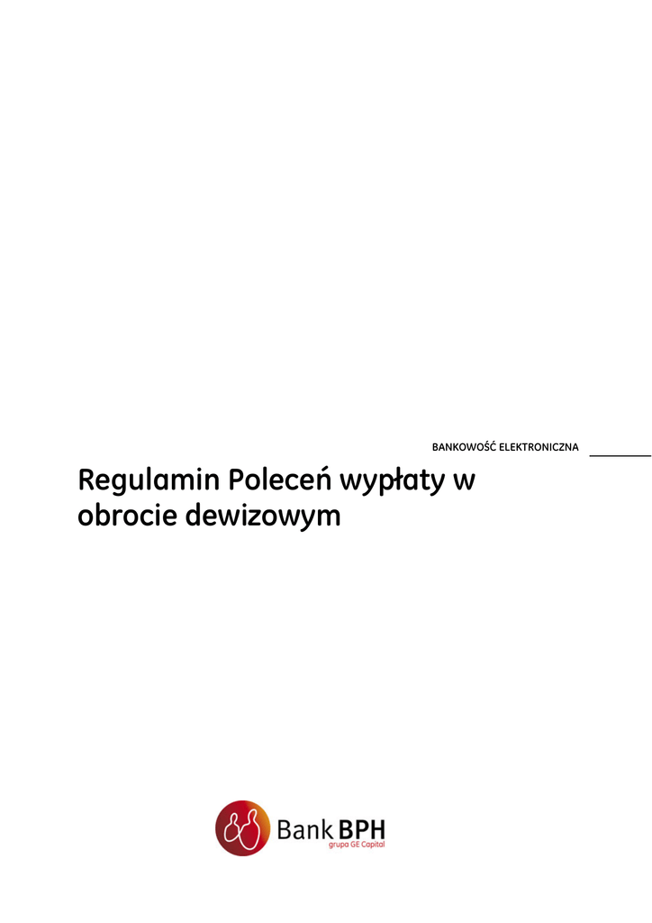 BANKOWOŚĆ ELEKTRONICZNA Regulamin Poleceń wypłaty w obrocie dewizowym SPIS TREŚCI DEFINICJE POJĘĆ UŻYTYCH W REGULAMINIE.......................... 3 I. OGÓLNE ZASADY REALIZACJI POLECEŃ WYPŁATY ............. 6 II. POLECENIA WYPŁATY OTRZYMANE (POR) .............................. 8 1. Obsługa poleceń wypłaty (POR) ................................................ 8 2. Zwrot poleceń otrzymanych (POR) .........................................10 III. POLECENIA WYPŁATY WYSŁANE (POS).................................11 1. Obsługa poleceń wypłaty (POS) ..............................................11 2. Zmiana lub uzupełnienie instrukcji płatniczych w zleceniu polecenia wypłaty (POS) ................................................14 3. Anulowanie polecenia wypłaty (POS) ....................................15 IV. OBOWIĄZKI I ODPOWIEDZIALNOŚĆ ZLECENIODAWCY/ BENEFICJENTA........................................15 V. SZCZEGÓLNE FORMY REALIZACJI POLECEŃ WYPŁATY (POS)....................................................................................................16 VI. OBOWIĄZKI I ODPOWIEDZIALNOŚĆ BANKU .....................17 VII. POSTANOWIENIA KOŃCOWE .................................................18 Załącznik Nr 1 – wzór druku: Zlecenie polecenia wypłaty w obrocie dewizowym Załącznik Nr 2 – wzór druku: Zobowiązanie Załącznik Nr 3 – wzór druku: Zobowiązanie dla klientów przekazujących zlecenia drogą elektroniczną DEFINICJE POJĘĆ UŻYTYCH W REGULAMINIE 1. Polecenie wypłaty - otrzymane przez Bank lub skierowane przez Bank do innej Instytucji bezwarunkowe polecenie dokonania wypłaty lub przelewu środków pieniężnych na rachunek wskazanej osoby fizycznej, osoby prawnej lub jednostki organizacyjnej nie posiadającej osobowości prawnej. 2. Polecenie wypłaty EURO – Polecenie wypłaty w obrocie z państwami członkowskimi Unii Europejskiej oraz Islandii, Lichtensteinu, Norwegii w walucie euro. 3. Polecenie wypłaty EEA - Polecenie wypłaty w obrocie z państwami członkowskimi Unii Europejskiej oraz Islandii, Lichtensteinu, Norwegii w walutach tych państw innych niż euro. 4. Polecenie wypłaty Standard – Polecenie wypłaty inne niż Polecenie wypłaty EURO lub Polecenie wypłaty EEA. 5. EEA – Europejski Obszar Gospodarczy obejmujący kraje Unii Europejskiej oraz Islandię, Lichtenstein, Norwegię 6. Bank – Bank BPH S.A. 7. Polecenie wypłaty STP – polecenie wypłaty sporządzone w formie umożliwiającej automatyczne przetwarzanie komunikatów płatniczych przez Dostawcę zlecającego, Dostawcę otrzymującego oraz Dostawców trzecich. W szczególności Polecenie wypłaty STP powinno zawierać nazwy wszystkich Instytucji w formie kodu swiftowego (BIC), musi zawierać numer rachunku Beneficjenta (w formacie IBAN - jeśli jest stosowany w danym kraju), nie może zawierać instrukcji skierowanych do Dostawców trzecich lub Dostawcy otrzymującego wymagających interwencji operatora. 8. Polecenie wypłaty otrzymane (POR) - operacja polegająca na dokonaniu wypłaty lub przelaniu określonej kwoty przez Bank na rzecz Beneficjenta wskazanego w Poleceniu wypłaty, zgodnie z dyspozycją przekazaną przez Dostawcę zlecającego Polecenie wypłaty. 9. Polecenie wypłaty wysłane (POS) - operacja polegająca na wystawieniu przez Bank Polecenia wypłaty na rzecz wskazanego Beneficjenta, a następnie przesłaniu Polecenia wypłaty do polskiej lub zagranicznej Instytucji. 10. Bezusterkowe polecenie wypłaty - Polecenie wypłaty zgodne z obowiązującym prawem oraz spełniające wszystkie wymogi merytoryczne i formalne określone w Regulaminie umożliwiające realizację Polecenia wypłaty przez Bank. 11. Jednostka przyjmująca - jednostka organizacyjna Banku przyjmująca zlecenie Polecenia wypłaty (POS) lub otrzymująca Polecenie wypłaty (POR) do ostatecznej realizacji. 12. Centrala Banku - funkcjonujące w Centrali Banku komórki organizacyjne upoważnione do dokonywania czynności związanych z obrotem dewizowym lub odpowiedzialne za prowadzenie reklamacji. 13. Zleceniodawca - osoba fizyczna, osoba prawna lub jednostka organizacyjna nie posiadająca osobowości prawnej zlecająca wystawienie Polecenia wypłaty. 14. Beneficjent – osoba fizyczna, osoba prawna lub jednostka organizacyjna nieposiadająca osobowości prawnej, wskazana w Poleceniu wypłaty jako odbiorca środków pieniężnych. 15. Instytucja– Bank, każdy podmiot wymieniony w pkt. 16 – 22 i inne podmioty pośredniczące w wykonaniu Polecenia wypłaty. 16. Dostawca Zleceniodawcy – dostawca usług płatniczych, w tym bank polski lub zagraniczny lub bank, który przyjmuje od Zleceniodawcy zlecenie Polecenia wypłaty (POS) do wykonania. 17. Dostawca korespondent – dostawca usług płatniczych prowadzący w swoich księgach rachunek Banku w określonej walucie (rachunek nostro) lub dostawca usług płatniczych, dla którego Bank prowadzi w swoich księgach rachunek w określonej walucie (rachunek loro). 18. Dostawca współpracujący - dostawca usług płatniczych, w tym bank polski lub zagraniczny, który nie jest Dostawcą korespondentem, lecz z którym Bank wymienił dokumenty kontrolne (wzory podpisów, klucze autentyfikacyjne SWIFT). 19. Dostawca trzeci - dostawca usług płatniczych, w tym bank polski lub zagraniczny, który w stosunku do Banku nie jest ani Dostawcą korespondentem, ani Dostawcą współpracującym, a który we współpracy z Bankiem korzysta z pośrednictwa tychże Dostawców. 20. Dostawca zlecający - dostawca usług płatniczych, w tym bank polski lub zagraniczny, który zleca Polecenie wypłaty do wykonania i/ lub rozliczenia na rzecz wskazanego Beneficjenta. Dostawca zlecający może występować w charakterze podmiotu pośredniczącego w realizacji Polecenia wypłaty lub Dostawcy Zleceniodawcy. 21. Dostawca otrzymujący - dostawca usług płatniczych, w tym bank polski lub zagraniczny, do którego Dostawca zlecający przesyła dyspozycję Polec