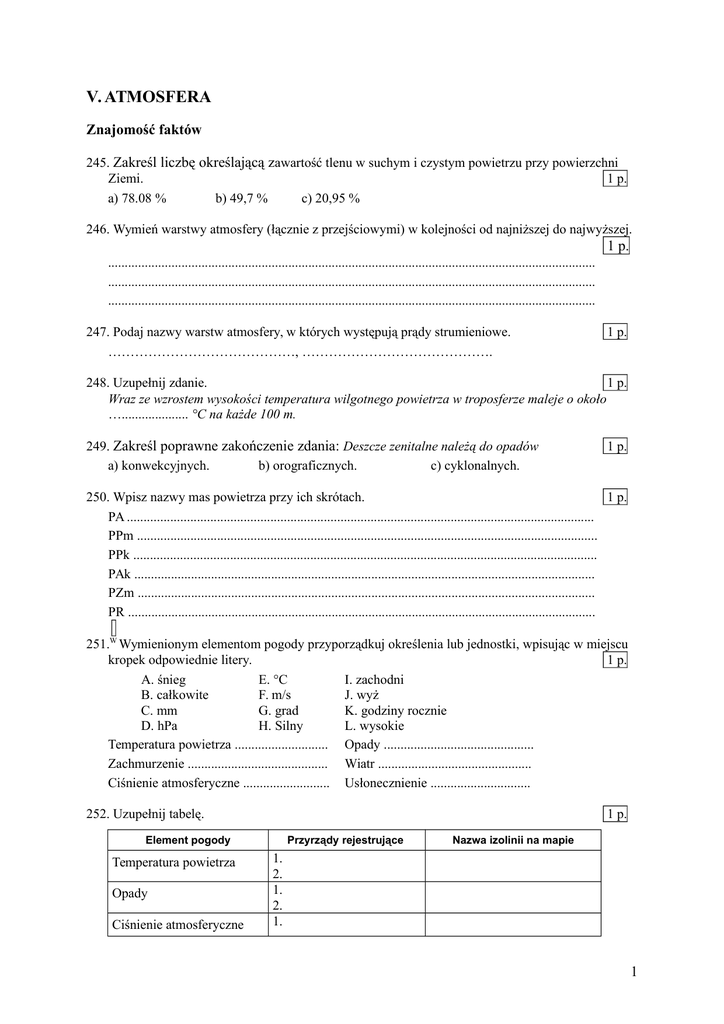 V. ATMOSFERA Znajomość faktów 245. Zakreśl liczbę określającą zawartość tlenu w suchym i czystym powietrzu przy powierzchni Ziemi. 1 p. a) 78.08 % b) 49,7 % c) 20,95 % 246. Wymień warstwy atmosfery (łącznie z przejściowymi) w kolejności od najniższej do najwyższej. 1 p. .................................................................................................................................................. .................................................................................................................................................. .................................................................................................................................................. 247. Podaj nazwy warstw atmosfery, w których występują prądy strumieniowe. ……………………………………, ……………………………………. 1 p. 248. Uzupełnij zdanie. 1 p. Wraz ze wzrostem wysokości temperatura wilgotnego powietrza w troposferze maleje o około ….................... °C na każde 100 m. 249. Zakreśl poprawne zakończenie zdania: Deszcze zenitalne należą do opadów a) konwekcyjnych. b) orograficznych. c) cyklonalnych. 1 p. 250. Wpisz nazwy mas powietrza przy ich skrótach. 1 p. PA ............................................................................................................................................ PPm .......................................................................................................................................... PPk ........................................................................................................................................... PAk .......................................................................................................................................... PZm ......................................................................................................................................... PR ............................................................................................................................................ 251.W Wymienionym elementom pogody przyporządkuj określenia lub jednostki, wpisując w miejscu kropek odpowiednie litery. 1 p. A. śnieg E. °C I. zachodni B. całkowite F. m/s J. wyż C. mm G. grad K. godziny rocznie D. hPa H. Silny L. wysokie Temperatura powietrza ............................ Opady ............................................. Zachmurzenie .......................................... Wiatr .............................................. Ciśnienie atmosferyczne .......................... Usłonecznienie .............................. 252. Uzupełnij tabelę. 1 p. Element pogody Temperatura powietrza Opady Ciśnienie atmosferyczne Przyrządy rejestrujące Nazwa izolinii na mapie 1. 2. 1. 2. 1. 1 2. 253.W Zakreśl termin oznaczający huraganowy wiatr występujący na wybrzeżu w Dalmacji. 1 p. a) halny b) mistral c) bora d) cyklon 254.W Uzupełnij tabelę. Symbole chmur wybierz spośród podanych. Ac As Cc Cb Ci Cs Cu Ns Sc St Piętro chmur Symbole c h m u r Nazwy łacińskie 3 p. Nazwy polskie Piętro wysokie Piętro średnie Piętro niskie Chmury o budowie pionowej 255. Wymień trzy przykłady klimatów astrefowych. 1. ..................................................................................................................... 2. ..................................................................................................................... 3. ..................................................................................................................... 1 p. Znajomość terminów geograficznych 256.PW Przyporządkuj warstwom atmosfery wymienione cechy, wpisując nazwy warstw w miejscu kropek. 2 p. A. odbija fale radiowe ............................................... B. w jej dolnej części występują prądy strumieniowe ................................................... C. temperatura wzrasta w niej wraz z wysokością od –55 oC do około 0oC .............................. D. jej część stanowi ozonosfera ........................................... E. powstają w niej zorze polarne .......................................... F. ciśnienie atmosferyczne spada wraz z wysokością od około 1000 hPa do 200 hPa G. zawiera większość atmosferycznej pary wodnej ........................................... H. składa się głównie z wodoru i helu ........................................... I. kształtuje się w niej pogoda ............................................ 257. Zakreśl termin oznaczający fizyczny stan atmosfery w danym miejscu i czasie. a) klimat b) pogoda c) element pogody 258. Zakreśl termin oznaczający charakterystyczny dla danego obszaru układ stanów pogody powtarzający się w cyklu rocznym. a) klimat b) układ baryczny c) front atmosferyczny 1 p. 1 p. 2 259. Zakreśl termin oznaczający strefę ścierania się mas powietrza o różnej temperaturze i wilgotności. a) ośrodek baryczny b) układ baryczny c) front atmosferyczny 1 p. 260.W Zakreśl termin odpowiadający następującemu opisowi pogody w Polsce: małe zachmurzenie, brak opadów, duże dobowe amplitudy temperatury, latem upały, zimą mrozy. 1 p. a) pogoda antycyklonalna b) pogoda cyklonalna 261. W Zakreśl rysunek przedstawiający mechanizm powstawania monsunu letniego. 1 p. 262.PW Przyporządkuj wymienione cechy klimatowi morskiemu lub klimatowi kontynentalnemu, wpisując w miejscu kropek odpowiednie litery. 2 p. a) duże dobowe i roczne amplitudy temperatury powietrza b) małe dobowe i roczne amplitudy temp. powietrza c) duża wilgotność powietrza d) mała wilgotność powietrza e) duże zachmurzenie f) małe zachmurzenie g) małe sumy opadów rocznych z maksimum w lecie h) duże sumy opadów rocznych i) gorące i suche lato j) chłodne i wilgotne lato k) mroźna i sucha zima l) łagodna i wilgotna zima Klimat morski ………………………………. Klimat kontynentalny …