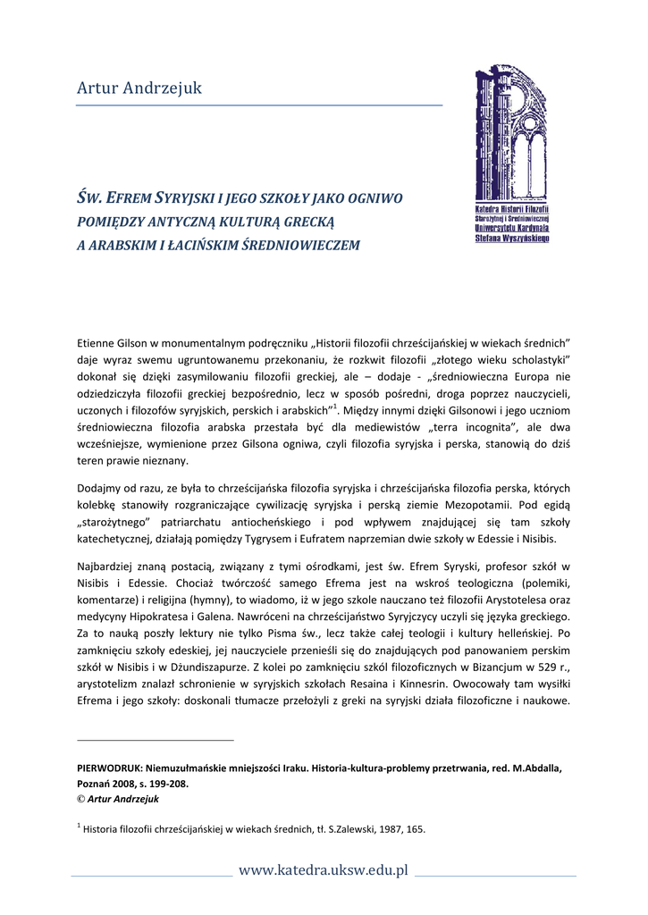 Artur Andrzejuk ŚW. EFREM SYRYJSKI I JEGO SZKOŁY JAKO OGNIWO POMIĘDZY ANTYCZNĄ KULTURĄ GRECKĄ A ARABSKIM I ŁACIŃSKIM ŚREDNIOWIECZEM Etienne Gilson w monumentalnym podręczniku „Historii filozofii chrześcijańskiej w wiekach średnich” daje wyraz swemu ugruntowanemu przekonaniu, że rozkwit filozofii „złotego wieku scholastyki” dokonał się dzięki zasymilowaniu filozofii greckiej, ale – dodaje - „średniowieczna Europa nie odziedziczyła filozofii greckiej bezpośrednio, lecz w sposób pośredni, droga poprzez nauczycieli, uczonych i filozofów syryjskich, perskich i arabskich”1. Między innymi dzięki Gilsonowi i jego uczniom średniowieczna filozofia arabska przestała być dla mediewistów „terra incognita”, ale dwa wcześniejsze, wymienione przez Gilsona ogniwa, czyli filozofia syryjska i perska, stanowią do dziś teren prawie nieznany. Dodajmy od razu, ze była to chrześcijańska filozofia syryjska i chrześcijańska filozofia perska, których kolebkę stanowiły rozgraniczające cywilizację syryjska i perską ziemie Mezopotamii. Pod egidą „starożytnego” patriarchatu antiocheńskiego i pod wpływem znajdującej się tam szkoły katechetycznej, działają pomiędzy Tygrysem i Eufratem naprzemian dwie szkoły w Edessie i Nisibis. Najbardziej znaną postacią, związany z tymi ośrodkami, jest św. Efrem Syryski, profesor szkół w Nisibis i Edessie. Chociaż twórczość samego Efrema jest na wskroś teologiczna (polemiki, komentarze) i religijna (hymny), to wiadomo, iż w jego szkole nauczano też filozofii Arystotelesa oraz medycyny Hipokratesa i Galena. Nawróceni na chrześcijaństwo Syryjczycy uczyli się języka greckiego. Za to nauką poszły lektury nie tylko Pisma św., lecz także całej teologii i kultury helleńskiej. Po zamknięciu szkoły edeskiej, jej nauczyciele przenieśli się do znajdujących pod panowaniem perskim szkół w Nisibis i w Dżundiszapurze. Z kolei po zamknięciu szkól filozoficznych w Bizancjum w 529 r., arystotelizm znalazł schronienie w syryjskich szkołach Resaina i Kinnesrin. Owocowały tam wysiłki Efrema i jego szkoły: doskonali tłumacze przełożyli z greki na syryjski działa filozoficzne i naukowe. PIERWODRUK: Niemuzułmańskie mniejszości Iraku. Historia-kultura-problemy przetrwania, red. M.Abdalla, Poznań 2008, s. 199-208. © Artur Andrzejuk 1 Historia filozofii chrześcijańskiej w wiekach średnich, tł. S.Zalewski, 1987, 165. www.katedra.uksw.edu.pl 2 Gdy więc w VII w. islam zajął miejsce chrześcijaństwa w Azji i Afryce, z czasem wezwano uczonych syryjskich do budowy arabsko-muzułmańskiego gmachu wiedzy. Początki Szkoły w Edessie Szkoła w Edessie sięga z pewnością czasów Bardesanesa (154-222). Ten, jeden z pionierów literatury syryjskiej, wychowany na dworze Abgara IX, kolejnego już chrześcijańskiego władcy królestwa Osroene, był oczytany w dziełach pisarzy greckich. W swoich poematach religijnych zdradzał pewne sympatie gnostyckie, które wiele lat później św. Efrem uznał za szkodliwe i poezję Bardesanesa postanowił zastąpić swoimi utworami. Hieronim pod koniec IV w. tak pisał o tym syryjskim uczonym2: Bardesanes sławny był w Mezopotamii. Początkowo zwolennik Walentyna, stal się potem jego przeciwnikiem i sam utworzył nową herezję. Syryjczycy opowiadają, że posiadał gorące usposobienie i że w dyskusjach był gwałtowny. Pisał niezliczone traktaty przeciwko prawie wszystkim heretykom, jacy pojawili się w jego czasach. Najsławniejsza spośród jego dzieł jest książka „O przeznaczeniu", którą wręczył Markowi Antoninowi [tzn. Heliogabalowi, 202—222 r.]. Oprócz tego [napisał] wiele innych książek. [Dzieło] „O prześladowaniu" zwolennicy jego przełożyli z języka syryjskiego na grecki. Siła i blask w tłumaczeniu pozwalają przypuszczać, jaka musiała być jego mowa. W świadectwie Hieronima ważne są dwa momenty: po pierwsze Bardesanesowi nie obca była kultura i język grecki oraz po drugie, że jego pisma syryjskie zostały przetłumaczone na język grecki. Biskup arabski, Jerzy, cytuje natomiast jego prace z matematyki3. Oprócz więc zagadnień teologicznych, Bardesanes zajmuje się też innymi dziedzinami wiedzy. A zatem można zaryzykować twierdzenie, że wymiana – i to dwustronna – pomiędzy tymi dwiema kulturami, przynajmniej w łonie Kościoła chrześcijańskiego, dokonywała się od samego początku. Nie posiadamy prac samego Bardesanesa; jego poglądy znamy z dialogu, jaki napisał jeden z jego uczniów, Filip, streszczając w nim Księgę praw krajów, w której broni tezy o wolności woli ludzkiej. Argumentem jest różnorodność praw i obyczajów, nawet w tym samym klimacie. Odrzuca więc Bardesanes tezę o wpływie gwiazd na ludzkie postępowanie. Egzemplifikacją tezy jest opis szeregu ludów Wschodu, co potwierdza ponadto istnienie misji syryjskich nawet w Indiach i Chinach. J.Daniélou uważa, że Bardesanes był zwolennikiem gnozy judeochrześcijańskiej, naznaczonej pewnym dualizmem, ale wynikać to może z irańskich wpływów na umysłowość Syryjczyka oraz archaicznego sposobu formułowania myśli. Gdy badamy – pisze Daniélou - przypisywaną Bardesadesowi naukę, wydaje się ona różna od gnostycyzmu. Mamy w niej do czynienia z dosyć szczególną kosmologią. Bóg stworzył najpierw rozmaite elementy, oddzielając je od siebie wzajemnie i wyznaczając im własne miejsce. One jednakże, pomieszawszy się ze sobą, stworzyły zamęt. 2 De viris illustribus, 33; PL 58, 601-720. Cyt. za J.M.Szymusiak, M,Starowieyski, Słownik wczesnochrześcijańskiego piśmiennictwa, 1971, 85. 3 Tamże. www.katedra.uksw.edu.pl 3 Wówczas Bóg stworzył nasz świat, łącząc światło z ciemnością. Po sześciu tysiącach lat, elementy zostaną odtworzone w swej pierwotnej czystości. Obecne ciało przynależy do drugiego świata i poddane jest gwiazdom. To stamtąd przychodzą cierpienia fizyczne. Ciało to nie 
