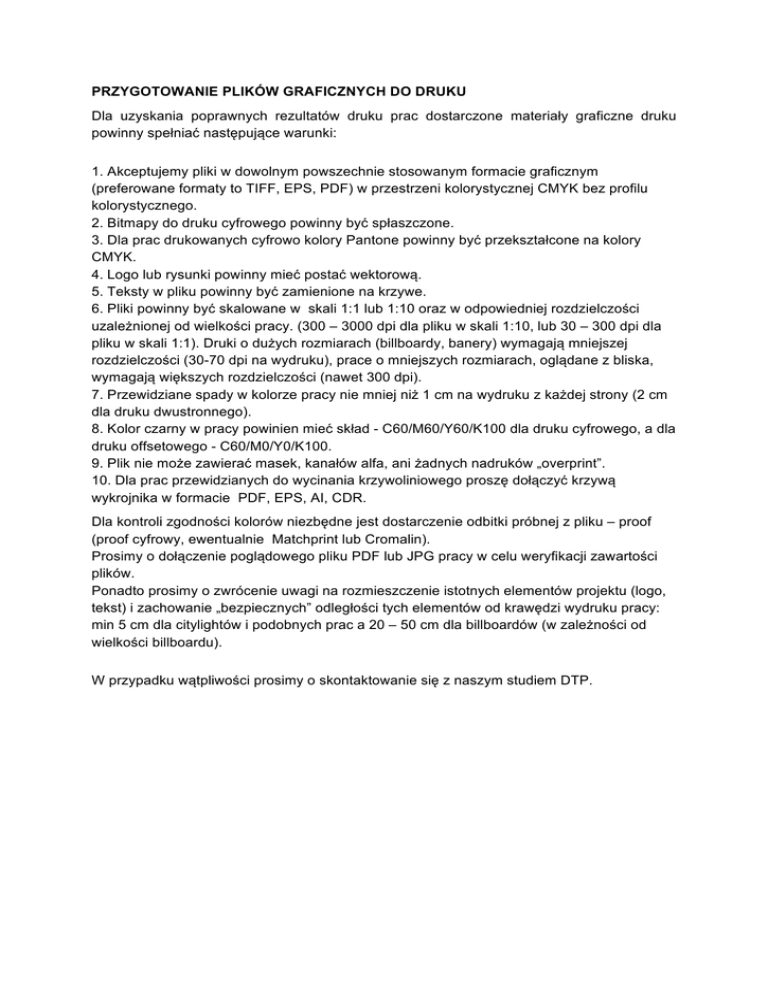 PRZYGOTOWANIE PLIKÓW GRAFICZNYCH DO DRUKU Dla uzyskania poprawnych rezultatów druku prac dostarczone materiały graficzne druku powinny spełniać następujące warunki: 1. Akceptujemy pliki w dowolnym powszechnie stosowanym formacie graficznym (preferowane formaty to TIFF, EPS, PDF) w przestrzeni kolorystycznej CMYK bez profilu kolorystycznego. 2. Bitmapy do druku cyfrowego powinny być spłaszczone. 3. Dla prac drukowanych cyfrowo kolory Pantone powinny być przekształcone na kolory CMYK. 4. Logo lub rysunki powinny mieć postać wektorową. 5. Teksty w pliku powinny być zamienione na krzywe. 6. Pliki powinny być skalowane w skali 1:1 lub 1:10 oraz w odpowiedniej rozdzielczości uzależnionej od wielkości pracy. (300 – 3000 dpi dla pliku w skali 1:10, lub 30 – 300 dpi dla pliku w skali 1:1). Druki o dużych rozmiarach (billboardy, banery) wymagają mniejszej rozdzielczości (30-70 dpi na wydruku), prace o mniejszych rozmiarach, oglądane z bliska, wymagają większych rozdzielczości (nawet 300 dpi). 7. Przewidziane spady w kolorze pracy nie mniej niż 1 cm na wydruku z każdej strony (2 cm dla druku dwustronnego). 8. Kolor czarny w pracy powinien mieć skład - C60/M60/Y60/K100 dla druku cyfrowego, a dla druku offsetowego - C60/M0/Y0/K100. 9. Plik nie może zawierać masek, kanałów alfa, ani żadnych nadruków „overprint”. 10. Dla prac przewidzianych do wycinania krzywoliniowego proszę dołączyć krzywą wykrojnika w formacie PDF, EPS, AI, CDR. Dla kontroli zgodności kolorów niezbędne jest dostarczenie odbitki próbnej z pliku – proof (proof cyfrowy, ewentualnie Matchprint lub Cromalin). Prosimy o dołączenie poglądowego pliku PDF lub JPG pracy w celu weryfikacji zawartości plików. Ponadto prosimy o zwrócenie uwagi na rozmieszczenie istotnych elementów projektu (logo, tekst) i zachowanie „bezpiecznych” odległości tych elementów od krawędzi wydruku pracy: min 5 cm dla citylightów i podobnych prac a 20 – 50 cm dla billboardów (w zależności od wielkości billboardu). W przypadku wątpliwości prosimy o skontaktowanie się z naszym studiem DTP.