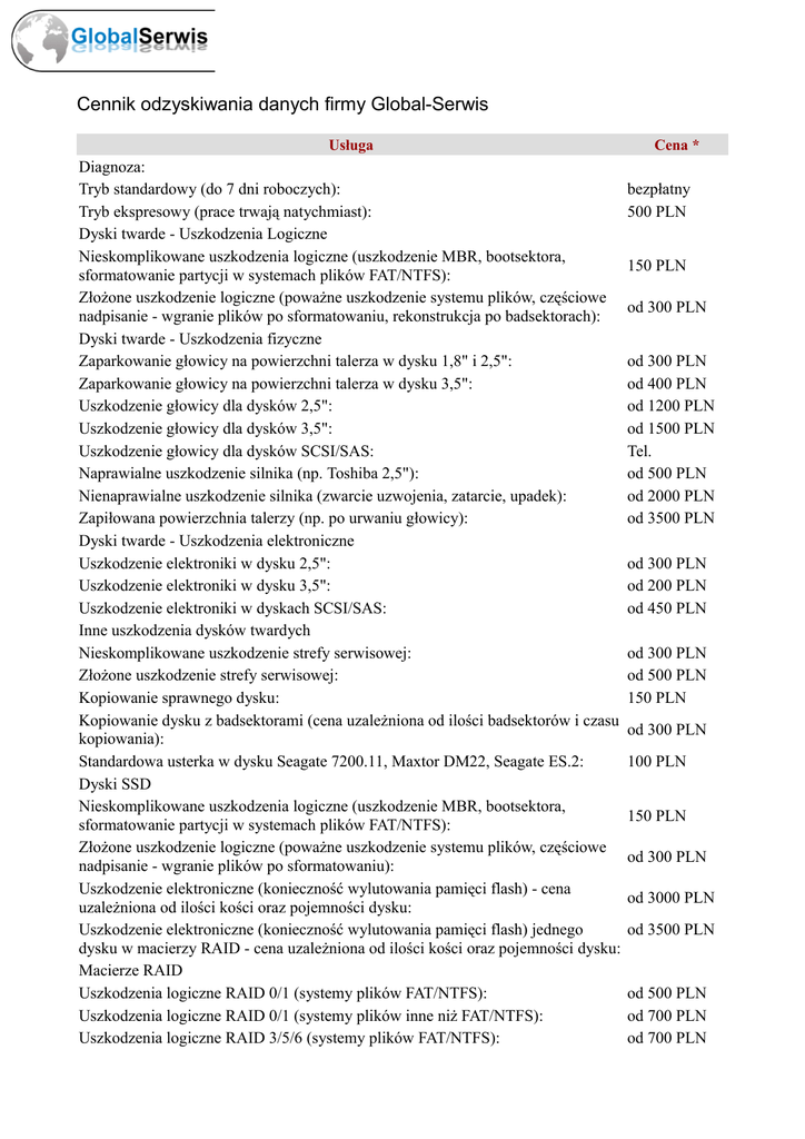 Cennik odzyskiwania danych firmy Global-Serwis