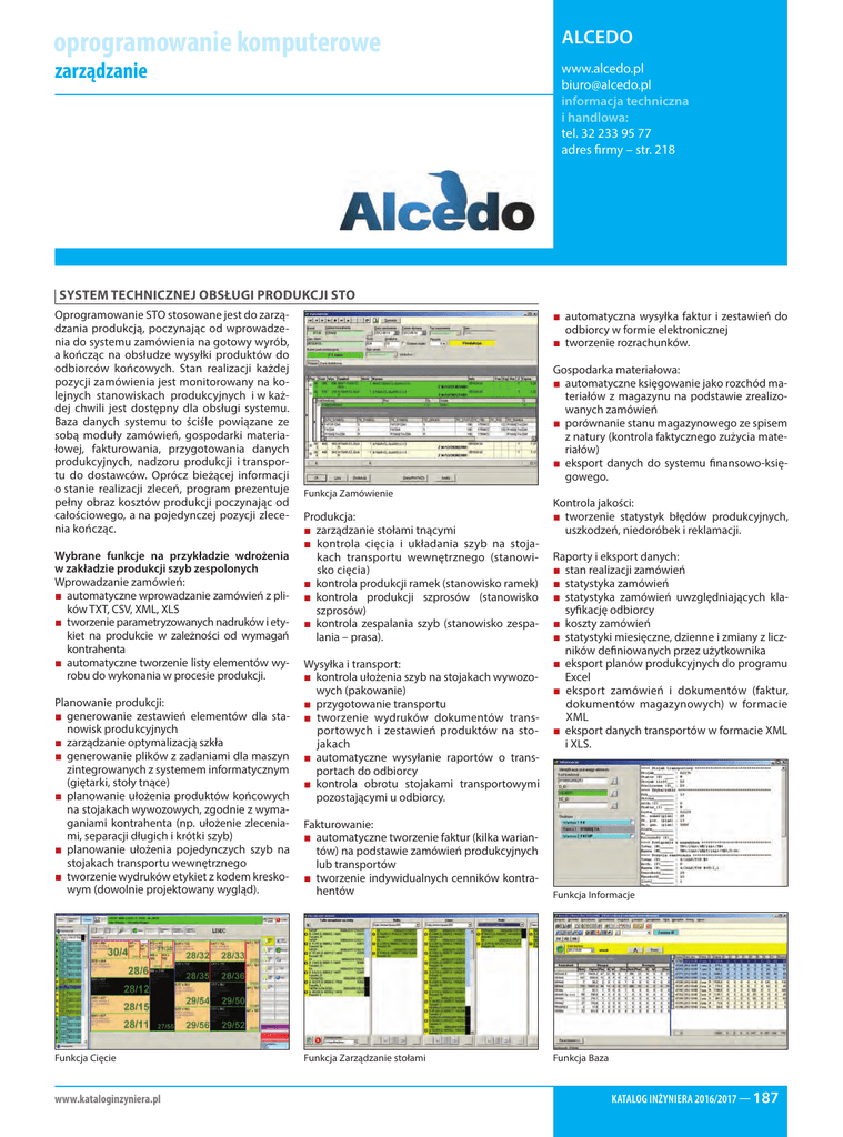 oprogramowanie komputerowe zarządzanie ALCEDO www.alcedo.pl [email protected] informacja techniczna i handlowa: tel. 32 233 95 77 adres firmy – str. 218 SYSTEM TECHNICZNEJ OBSŁUGI PRODUKCJI STO Oprogramowanie STO stosowane jest do zarządzania produkcją, poczynając od wprowadzenia do systemu zamówienia na gotowy wyrób, a kończąc na obsłudze wysyłki produktów do odbiorców końcowych. Stan realizacji każdej pozycji zamówienia jest monitorowany na kolejnych stanowiskach produkcyjnych i w każdej chwili jest dostępny dla obsługi systemu. Baza danych systemu to ściśle powiązane ze sobą moduły zamówień, gospodarki materiałowej, fakturowania, przygotowania danych produkcyjnych, nadzoru produkcji i transportu do dostawców. Oprócz bieżącej informacji o stanie realizacji zleceń, program prezentuje pełny obraz kosztów produkcji poczynając od całościowego, a na pojedynczej pozycji zlecenia kończąc. Wybrane funkcje na przykładzie wdrożenia w zakładzie produkcji szyb zespolonych Wprowadzanie zamówień: ■ automatyczne wprowadzanie zamówień z plików TXT, CSV, XML, XLS ■ tworzenie parametryzowanych nadruków i etykiet na produkcie w zależności od wymagań kontrahenta ■ automatyczne tworzenie listy elementów wyrobu do wykonania w procesie produkcji. Planowanie produkcji: ■ generowanie zestawień elementów dla stanowisk produkcyjnych ■ zarządzanie optymalizacją szkła ■ generowanie plików z zadaniami dla maszyn zintegrowanych z systemem informatycznym (giętarki, stoły tnące) ■ planowanie ułożenia produktów końcowych na stojakach wywozowych, zgodnie z wymaganiami kontrahenta (np. ułożenie zleceniami, separacji długich i krótki szyb) ■ planowanie ułożenia pojedynczych szyb na stojakach transportu wewnętrznego ■ tworzenie wydruków etykiet z kodem kreskowym (dowolnie projektowany wygląd). Funkcja Cięcie www.kataloginzyniera.pl ■ a utomatyczna wysyłka faktur i zestawień do odbiorcy w formie elektronicznej ■ tworzenie rozrachunków. Gospodarka materiałowa: ■ automatyczne księgowanie jako rozchód materiałów z magazynu na podstawie zrealizowanych zamówień ■ porównanie stanu magazynowego ze spisem z natury (kontrola faktycznego zużycia materiałów) ■ eksport danych do systemu finansowo-księgowego. Funkcja Zamówienie Produkcja: ■ zarządzanie stołami tnącymi ■ kontrola cięcia i układania szyb na stojakach transportu wewnętrznego (stanowisko cięcia) ■ kontrola produkcji ramek (stanowisko ramek) ■ kontrola produkcji szprosów (stanowisko szprosów) ■ kontrola zespalania szyb (stanowisko zespalania – prasa). Wysyłka i transport: ■ kontrola ułożenia szyb na stojakach wywozowych (pakowanie) ■ przygotowanie transportu ■ tworzenie wydruków dokumentów transportowych i zestawień produktów na stojakach ■ automatyczne wysyłanie raportów o transportach do odbiorcy kontrola obrotu stojakami transportowymi ■ pozostającymi u odbiorcy. Kontrola jakości: ■ tworzenie statystyk błędów produkcyjnych, uszkodzeń, niedoróbek i reklamacji. Raporty i eksport danych: ■ stan realizacji zamówień ■ statystyka zamówień ■ statystyka zamówień uwzględniających klasyfikację odbiorcy ■ koszty zamówień ■ statystyki miesięczne, dzienne i zmiany z liczników definiowanych przez użytkownika ■ eksport planów produkcyjnych do programu Excel ■ eksport zamówień i dokumentów (faktur, dokumentów magazynowych) w formacie XML ■ eksport danych transportów w formacie XML i XLS. Fakturowanie: ■ automatyczne tworzenie faktur (kilka wariantów) na podstawie zamówień produkcyjnych lub transportów ■ tworzenie indywidualnych cenników kontrahentów Funkcja Informacje Funkcja Zarządzanie stołami Funkcja Baza KATALOG INŻYNIERA 2016/2017 — 187