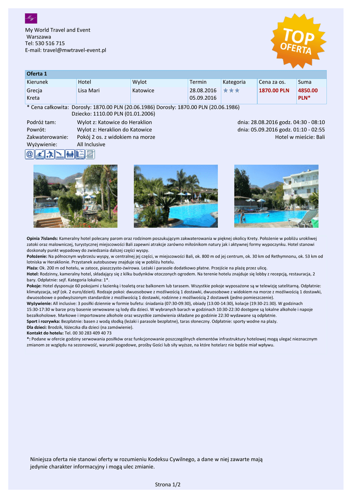 My World Travel and Event Warszawa Tel: 530 516 715 E-mail: [email protected] Oferta 1 Kierunek Grecja Kreta Hotel Lisa Mari Wylot Katowice Termin 28.08.2016 05.09.2016 Kategoria Cena za os. 1870.00 PLN Suma 4850.00 PLN* * Cena całkowita: Dorosły: 1870.00 PLN (20.06.1986) Dorosły: 1870.00 PLN (20.06.1986) Dziecko: 1110.00 PLN (01.01.2006) Podróż tam: Wylot z: Katowice do Heraklion dnia: 28.08.2016 godz. 04:30 - 08:10 Powrót: Wylot z: Heraklion do Katowice dnia: 05.09.2016 godz. 01:10 - 02:55 Zakwaterowanie: Pokój 2 os. z widokiem na morze Hotel w mieście: Bali Wyżywienie: All Inclusive Opinia 7islands: Kameralny hotel polecany parom oraz rodzinom poszukującym zakwaterowania w pięknej okolicy Krety. Położenie w pobliżu urokliwej zatoki oraz malowniczej, turystycznej miejscowości Bali zapewni atrakcje zarówno miłośnikom natury jak i aktywnej formy wypoczynku. Hotel stanowi doskonały punkt wypadowy do zwiedzania dalszej części wyspy. Położenie: Na północnym wybrzeżu wyspy, w centralnej jej części, w miejscowości Bali, ok. 800 m od jej centrum, ok. 30 km od Rethymnonu, ok. 53 km od lotniska w Heraklionie. Przystanek autobusowy znajduje się w pobliżu hotelu. Plaża: Ok. 200 m od hotelu, w zatoce, piaszczysto-żwirowa. Leżaki i parasole dodatkowo płatne. Przejście na plażę przez ulicę. Hotel: Rodzinny, kameralny hotel, składający się z kilku budynków otoczonych ogrodem. Na terenie hotelu znajduje się lobby z recepcją, restauracja, 2 bary. Odpłatnie: sejf. Kategoria lokalna: 1*. Pokoje: Hotel dysponuje 60 pokojami z łazienką i toaletą oraz balkonem lub tarasem. Wszystkie pokoje wyposażone są w telewizję satelitarną. Odpłatnie: klimatyzacja, sejf (ok. 2 euro/dzień). Rodzaje pokoi: dwuosobowe z możliwością 1 dostawki, dwuosobowe z widokiem na morze z możliwością 1 dostawki, dwuosobowe o podwyższonym standardzie z możliwością 1 dostawki, rodzinne z możliwością 2 dostawek (jedno pomieszczenie). Wyżywienie: All inclusive: 3 posiłki dziennie w formie bufetu: śniadania (07:30-09:30), obiady (13:00-14:30), kolacje (19:30-21:30). W godzinach 15:30-17:30 w barze przy basenie serwowane są lody dla dzieci. W wybranych barach w godzinach 10:30-22:30 dostępne są lokalne alkohole i napoje bezalkoholowe. Markowe i importowane alkohole oraz wszystkie zamówienia składane po godzinie 22:30 wydawane są odpłatnie. Sport i rozrywka: Bezpłatnie: basen z wodą słodką (leżaki i parasole bezpłatne), taras słoneczny. Odpłatnie: sporty wodne na plaży. Dla dzieci: Brodzik, łóżeczka dla dzieci (na zamówienie). Kontakt do hotelu: Tel. 00 30 283 409 40 73 *: Podane w ofercie godziny serwowania posiłków oraz funkcjonowanie poszczególnych elementów infrastruktury hotelowej mogą ulegać nieznacznym zmianom ze względu na sezonowość, warunki pogodowe, prośby Gości lub siły wyższe, na które hotelarz nie będzie miał wpływu. Niniejsza oferta nie stanowi oferty w rozumieniu Kodeksu Cywilnego, a dane w niej zawarte mają jedynie charakter informacyjny i mogą ulec zmianie. Strona 1/2 My World Travel and Event Warszawa Tel: 530 516 715 E-mail: [email protected] Oferta 2 Kierunek Grecja Kreta Hotel Lisa Mari Wylot Warszawa Termin 28.08.2016 05.09.2016 Kategoria Cena za os. 1940.00 PLN Suma 5060.00 PLN* * Cena całkowita: Dorosły: 1940.00 PLN (20.06.1986) Dorosły: 1940.00 PLN (20.06.1986) Dziecko: 1180.00 PLN (01.01.2006) Podróż tam: Wylot z: Warszawa do Heraklion dnia: 28.08.2016 godz. 03:00 - 06:55 Powrót: Wylot z: Heraklion do Warszawa dnia: 05.09.2016 godz. 00:30 - 02:25 Zakwaterowanie: Pokój 2 os. z widokiem na morze Hotel w mieście: Bali Wyżywienie: All Inclusive Niniejsza oferta nie stanowi oferty w rozumieniu Kodeksu Cywilnego, a dane w niej zawarte mają jedynie charakter informacyjny i mogą ulec zmianie. Strona 2/2 Powered by TCPDF (www.tcpdf.org)