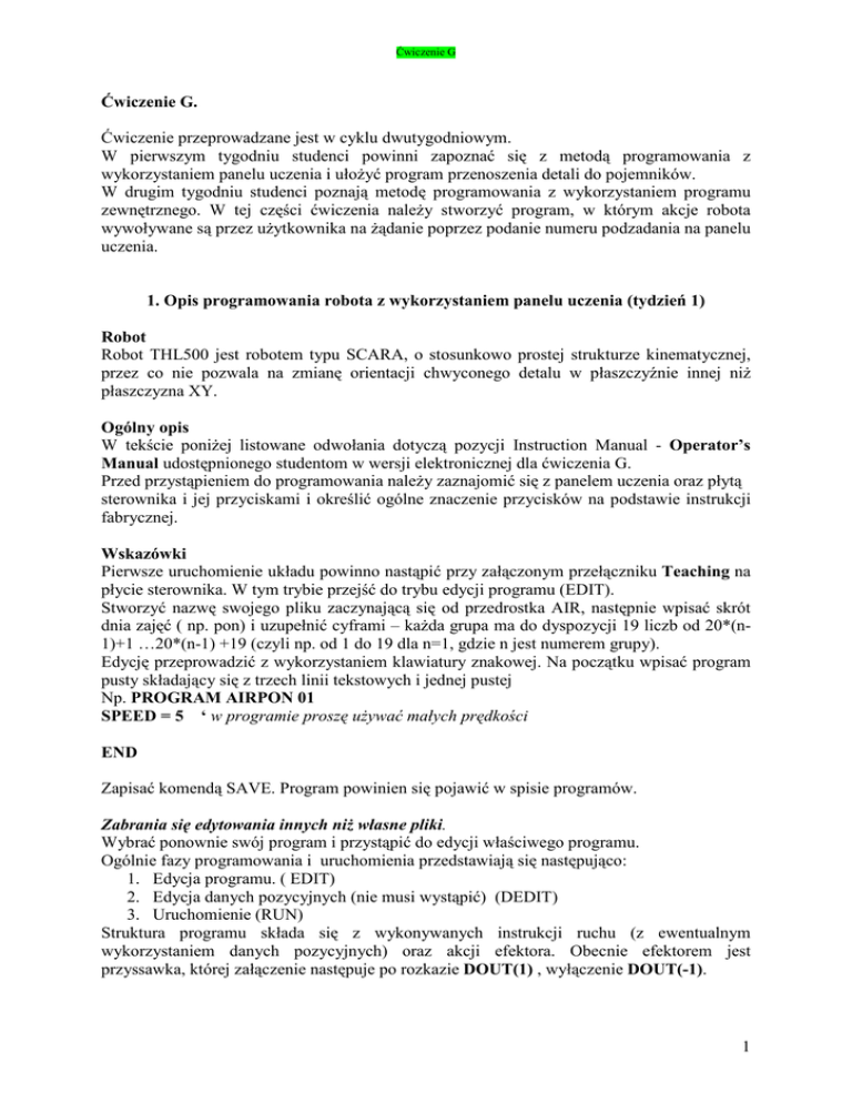 Ćwiczenie G Ćwiczenie G. Ćwiczenie przeprowadzane jest w cyklu dwutygodniowym. W pierwszym tygodniu studenci powinni zapoznać się z metodą programowania z wykorzystaniem panelu uczenia i ułoŜyć program przenoszenia detali do pojemników. W drugim tygodniu studenci poznają metodę programowania z wykorzystaniem programu zewnętrznego. W tej części ćwiczenia naleŜy stworzyć program, w którym akcje robota wywoływane są przez uŜytkownika na Ŝądanie poprzez podanie numeru podzadania na panelu uczenia. 1. Opis programowania robota z wykorzystaniem panelu uczenia (tydzień 1) Robot Robot THL500 jest robotem typu SCARA, o stosunkowo prostej strukturze kinematycznej, przez co nie pozwala na zmianę orientacji chwyconego detalu w płaszczyźnie innej niŜ płaszczyzna XY. Ogólny opis W tekście poniŜej listowane odwołania dotyczą pozycji Instruction Manual - Operator’s Manual udostępnionego studentom w wersji elektronicznej dla ćwiczenia G. Przed przystąpieniem do programowania naleŜy zaznajomić się z panelem uczenia oraz płytą sterownika i jej przyciskami i określić ogólne znaczenie przycisków na podstawie instrukcji fabrycznej. Wskazówki Pierwsze uruchomienie układu powinno nastąpić przy załączonym przełączniku Teaching na płycie sterownika. W tym trybie przejść do trybu edycji programu (EDIT). Stworzyć nazwę swojego pliku zaczynającą się od przedrostka AIR, następnie wpisać skrót dnia zajęć ( np. pon) i uzupełnić cyframi – kaŜda grupa ma do dyspozycji 19 liczb od 20*(n1)+1 …20*(n-1) +19 (czyli np. od 1 do 19 dla n=1, gdzie n jest numerem grupy). Edycję przeprowadzić z wykorzystaniem klawiatury znakowej. Na początku wpisać program pusty składający się z trzech linii tekstowych i jednej pustej Np. PROGRAM AIRPON 01 SPEED = 5 ‘ w programie proszę uŜywać małych prędkości END Zapisać komendą SAVE. Program powinien się pojawić w spisie programów. Zabrania się edytowania innych niŜ własne pliki. Wybrać ponownie swój program i przystąpić do edycji właściwego programu. Ogólnie fazy programowania i uruchomienia przedstawiają się następująco: 1. Edycja programu. ( EDIT) 2. Edycja danych pozycyjnych (nie musi wystąpić) (DEDIT) 3. Uruchomienie (RUN) Struktura programu składa się z wykonywanych instrukcji ruchu (z ewentualnym wykorzystaniem danych pozycyjnych) oraz akcji efektora. Obecnie efektorem jest przyssawka, której załączenie następuje po rozkazie DOUT(1) , wyłączenie DOUT(-1). 1 Ćwiczenie G NaleŜy pamiętać o tym, Ŝe instrukcje typu ruchu i dane pozycyjne są od siebie niezaleŜne, a wiec istnieje moŜliwość zmiany jednego zbioru bez zmiany drugiego. Wybrane wskazówki edycyjne ( tryb EDIT) 1. Rolę klawisza Enter pełni klawisz oznaczony na panelu uczenia jako EXE (1-8) 2. ESC pozwala na wyjście z danego trybu. (1-8) 3. Klawisze F1, F2, F3, F4, F5 skorelowane są z wyświetlanymi komendami w menu(1-8) 4. BS kasuje znaki. (1-8) 5. NEXT pozwala przejść do dalszej części menu (1-8) 6. Komenda z menu COPY pozwala wygodnie kopiować rozkazy o podobnej strukturze, które potem wymagają zamiany tylko pojedynczych parametrów (4-14) 7. Klawisz INS zmienia tryb wstawiania (4-6) Po napisaniu programu zapisać go komendą SAVE lub wyjść bez zapisywania NOSAVE. Wybrane wskazówki edycyjne dla trybu definiowania punktów (tryb DEDIT). W trybie tym edytujemy poszczególne pozycje oznaczając je symbolicznie np. POZ1, POZ2, itd. dla danego pliku programu, który został wybrany. Do wprowadzania nowych pozycji uŜywamy klawisza INS. Znaczenie Klawiszy i Komend pokazane jest na stronie 5-5 i 5-6. MoŜna definiować pozycje wykorzystując komendę TEACH (5-27), która wprowadza dla aktualnie podświetlonej nazwy aktualną pozycję robota lub edytować pozycję ręcznie. Zaleca się zbadanie przestrzeni roboczej poprzez doprowadzenie robota do punktów w pobliŜu jej końca i próbne wpisanie współrzędnych. Kasowanie i wstawianie opisane jest (5-31 – 5-34) Po stworzeniu odpowiedniego zbioru punktów zapamiętać SAVE. Obsługa błędu: Jeśli przy zapisywaniu pojawi się błąd np. składniowy w programie (sygnalizacja dźwiękowa) – sprawdzić, jakiego rodzaju to błąd (F3-ERROR) i skasować (F3RESETEM) (sygnalizacja dźwiękowa powinna się wyłączyć) Uruchomienie programu: 1. Przełączyć przełącznik na płycie sterownika z trybu Teaching na Internal ( 6-2). 2. Wybrać napisany swój program korzystając z komendy SEL. ( EXE zatwierdza wybór) 3. Wybrać odpowiedni tryb pracy za pomocą komendy MODE. Mamy do wyboru następujące tryby CONT, CYCLE , SEG, STEP (6-6). 4. Załączyć SERVO ON (na płycie sterownika) , RUN uruchamia program STOP zatrzymuje (uwaga, producent nie zaleca uŜywać do zatrzymywania przycisku SERVO OFF !) 5. W razie niebezpieczeństwa uŜyć EMERGENCY stop, ale naleŜy mieć na uwadze, iŜ program powinien być tak napisany, aby nie było konieczności uŜywania tego przycisku. 6. W razie pojawienia się błędu zobaczyć, jakiego jest rodzaju i ewentualnie zresetować. W czasie wykonywania programu program moŜna zatrzymać uŜywając przycisku FEED HOLD z panelu uczenia - robot zatrzymuje się bezzwłocznie. Po powtórnym naciśnięciu FEED HOLD robot kontynuuje rozpoczęty ruch – tak więc przycisku tego uŜywamy do tymczasowego zatrzymania robota. 2 Ćwiczenie G Inną moŜliwością zatrzymania robota jest uŜycie z menu STOP – w takim wypadku robot jednak nie zatrzymuje się bezzwłocznie, ale dokańcza rozpoczęty krok. Bezzwłoczne przerwanie programu uzyskuje się natomiast poprzez BREAK. W czasie ruchu podgląd wykonywanych linii programu uzyskujemy poprzez LDISP (z dalszej części menu). Wykonanie pojedynczego rozkazu moŜliwe jest równieŜ za pomocą pozycji menu DO. W tym trybie moŜliwe do wykorzystania są rozkazy wysyłania sygnału na wyjście DOUT (np. do sterowania przyssawką) lub MOVEA (ruch do absolutnej pozycji złączowej). Prog