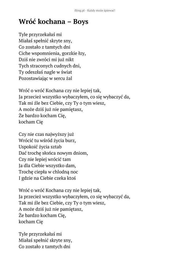 iSing.pl - Każdy może śpiewać! Wróć kochana – Boys Tyle przyrzekałaś mi Miałaś spełnić skryte sny, Co zostało z tamtych dni Ciche wspomnienia, gorzkie łzy, Dziś nie zwróci mi już nikt Tych straconych cudnych dni, Ty odeszłaś nagle w świat Pozostawiając w sercu żal Wróć o wróć Kochana czy nie lepiej tak, Ja przecież wszystko wybaczyłem, co się wybaczyć da, Tak mi źle bez Ciebie, czy Ty o tym wiesz, A może dziś już nie pamiętasz, Że bardzo kocham Cię, kocham Cię Czy nie czas najwyższy już Wrócić tu wśród życia burz, Uspokoić życia sztab Dać trochę słońca nowym dniom, Czy nie lepiej wrócić tam Ja dla Ciebie wszystko dam, Trochę ciepła w chlodną noc I gdzie na Ciebie czeka ktoś Wróć o wróć Kochana czy nie lepiej tak, Ja przecież wszystko wybaczyłem, co się wybaczyć da, Tak mi źle bez Ciebie, czy Ty o tym wiesz, A może dziś już nie pamiętasz, Że bardzo kocham Cię, kocham Cię Tyle przyrzekałaś mi Miałaś spełnić skryte sny, Co zostało z tamtych dni Ciche wspomnienia, gorzkie łzy Wróć o wróć Kochana czy nie lepiej tak, Ja przecież wszystko wybaczyłem, co się wybaczyć da, Tak mi źle bez Ciebie, czy Ty o tym wiesz, A może dziś już nie pamiętasz, Że bardzo kocham Cię, Wróć o wróć Kochana czy nie lepiej tak, Ja przecież wszystko wybaczyłem, co się wybaczyć da, Tak mi źle bez Ciebie, czy Ty o tym wiesz, A może dziś już nie pamiętasz, Że bardzo kocham Cię, kocham Cię Słowa: brak danych Muzyka: brak danych Rok wydania: brak danych Płyta: brak danych
