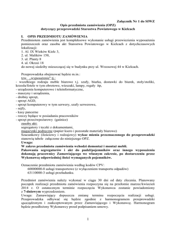 Załącznik Nr 1 do SIWZ Opis przedmiotu zamówienia (OPZ) dotyczący przeprowadzki Starostwa Powiatowego w Kielcach I. OPIS PRZEDMIOTU ZAMÓWIENIA Przedmiotem zamówienia jest kompleksowe wykonanie usługi przewiezienia wyposażenia pomieszczeń oraz zasobu akt Starostwa Powiatowego w Kielcach z dotychczasowych lokalizacji: 1. Al. IX Wieków Kielc 3, 2. ul. Malików 150, 3. ul. Planty 8 4. ul. Okrzei 18 do nowej siedziby mieszczącej się w budynku przy ul. Wrzosowej 44 w Kielcach. Przeprowadzka obejmować będzie m.in.: tzw. ,,wyposażenie" tj.: - wszelkiego rodzaju meble biurowe t.j. szafy, biurka, dostawki do biurek, stoły/stoliki, krzesła/fotele w tym obrotowe, wieszaki, lampy, regały itp, - urządzenia komputerowe i teleinformatyczne, - maszyny i urządzenia, - drobny sprzęt, - sprzęt AGD, - sprzęt komputerowy w tym serwery, szafy serwerowe, - sejfy, - kasy pancerne - rzeczy będące w posiadaniu pracowników - sprzęt przeciwpożarowy (gaśnice) zasoby akt: segregatory i teczki z dokumentami, magazynki podręczne (papier ksero i pozostałe materiały biurowe) Szacunkowy (ilościowy i rodzajowy) wykaz mienia przeznaczonego do przeprowadzki stanowią tabele załączone do niniejszego OPZ. Uwaga: W zakres przedmiotu zamówienia wchodzi demontaż i montaż mebli. Pakowania segregatorów i akt do pudeł/pojemników oraz innego wyposażenia dokonają pracownicy Zamawiającego we własnym zakresie, po dostarczeniu przez Wykonawcę odpowiedniej ilości wymaganych pojemników. Oznaczenie przedmiotu zamówienia według kodów CPV: 60000000-8 usługi transportowe (z wyłączeniem transportu odpadów) 63110000-3 usługi przeładunku. Przedmiot zamówienia należy wykonać w ciągu 30 dni od daty zlecenia. Planowany początek realizacji przedmiotu zamówienia rozpoczyna się na przełomie marzec/kwiecień 2014 r. O ostatecznym terminie rozpoczęcia Wykonawca zostanie powiadomiony z 7-dniowym wyprzedzeniem. Uwaga: Zamawiający dopuszcza zmianę terminu rozpoczęcia realizacji usługi. Przeprowadzka odbywać się będzie zgodnie z harmonogramem przeprowadzki sporządzonym i zaakceptowanym przez Zamawiającego i Wykonawcę. Harmonogram będzie przedłożony Wykonawcy przed podpisaniem umowy. 1 Przeprowadzka odbywać się będzie w godzinach: - w dni robocze od. godz.15.30 – (istnieje możliwość realizacji usługi w godzinach pracy Zamawiającego, po wcześniejszym ustaleniu) - w soboty i niedziele oraz w dni wolne od pracy od godziny 8.00. II. LOKALIZACJE, Z KTÓRYCH PRZEPROWADZKA MA NASTĄPIĆ: a) Al. IX Wieków Kielc 3, Kielce, budynek C1 – budynek w odległości od lokalizacji docelowej około 5 km, przeprowadzane wydziały mieszczą się w piwnicy, na parterze, II- III-V piętrze budynku, budynek posiadający dwie klatki schodowe i wyposażony w dwa dźwigi osobowe, każdy o udźwigu 1000 kg, dojazd do budynku: centrum miasta, postój pojazdu na parkingu przed budynkiem oraz z tyłu budynku – wjazd i parkowanie do uzgodnienia z Zamawiającym b) ul. Malików 150, Kielce - budynek w odległości od lokalizacji docelowej około 10 km, przeprowadzane wydziały mieszczą się na parterze, I i II piętrze budynku, budynek posiadający jedną klatkę schodową, brak dźwigu osobowego, dojazd do budynku: obrzeża miasta, postój pojazdu na parkingu przed budynkiem – wjazd i parkowanie do uzgodnienia z Zamawiającym c) ul. Planty 8 – budynek w odległości od lokalizacji docelowej około 5 km, przeprowadzane wydziały mieszczą się na I i II piętrze budynku, budynek posiadający jedną klatkę schodową, brak dźwigu osobowego, dojazd do budynku: centrum miasta, postój pojazdu na parkingu przed budynkiem – wjazd i parkowanie do uzgodnienia z Zamawiającym d) ul. Okrzei 18 - budynek w odległości od lokalizacji docelowej około 5 km, przeprowadzane wydziały mieszczą się na IV piętrze budynku, budynek posiadający jedną klatkę schodową, wyposażony w dźwig osobowy o udźwigu 630 kg, dojazd do budynku: centrum miasta, postój pojazdu na parkingu przed budynkiem – wjazd i parkowanie do uzgodnienia z Zamawiającym III. LOKALIZACJA, DO KTÓREJ PRZEPROWADZKA MA NASTĄPIĆ: ul. Wrzosowa 44, Kielce - budynek 5-kondygnacyjny (przyziemie, parter, I- II- III piętro, budynek wyposażony w 3 dźwigi osobowe (o udźwigu 1000 kg każdy). Wykonawca zabezpiecza w czasie transportu, własnym staraniem i na własny koszt dźwigi osobowe przed ewentualnymi uszkodzeniami. Wnętrze budynku wymaga transportowania rzeczy sposobem gwarantującym nieuszkodzenie lub nie zniszczenie rzeczy transportowanych i wnętrza budynku. Wjazd i postój pojazdu na parkingu bezpłatnym na dziedzińcu wewnętrznym. Wyklucza się stosowanie sposobu przemieszczania rzeczy metodami jakiegokolwiek kontaktowego przesuwu po podłożu. IV. SZCZEGÓŁOWY ZAKRES REALIZACJI USŁUGI 1. Wykonawca zobowiązany jest do: a) dostarczenia Zamawiającemu w wyznaczonym dniu odpowiedniej ilości materiałów pakowych do przeprowadzki, do zabezpieczenia transportowanych towarów, gwarantujących płynną realizację przedmiotu zamówienia bez zbędnych przestojów tj.: - pojemniki/pudła kartonowe o wzmocnionym dnie, z bocznymi uchwytami, do których pracownicy Zamawiającego zapakują podlegające przeprowadzce wyposażenia stanowisk pracy, w tym segregatory i teczki z dokumentami i rzeczy osobiste. Pudła będą użytkowane przez pracowników wielokrotnie. Pudła muszą być trwałe i wytrzymałe, z punktu widzenia celu, jakiemu mają służyć. Uszkodzenia pudeł powstałe w czasie użytkowania nie mogą mieć wpływu na ciągłość wykonywanej usługi, - pojemniki do transportu materiałów cennych z możliwością plombowania, 2 - specjalne kartony do spakowania sprzętu komputerowego, faksów, drukarek itp., - materiały zabezpieczające (folia bąbelkowa, folia stretch, koce przemysłowe, taśmy samoprzylepne, taśmy pakowe, worki foliowe-wytrzymałe, sznurek pakowy) w ilości zapewniającej zabezpieczenie każdego transp