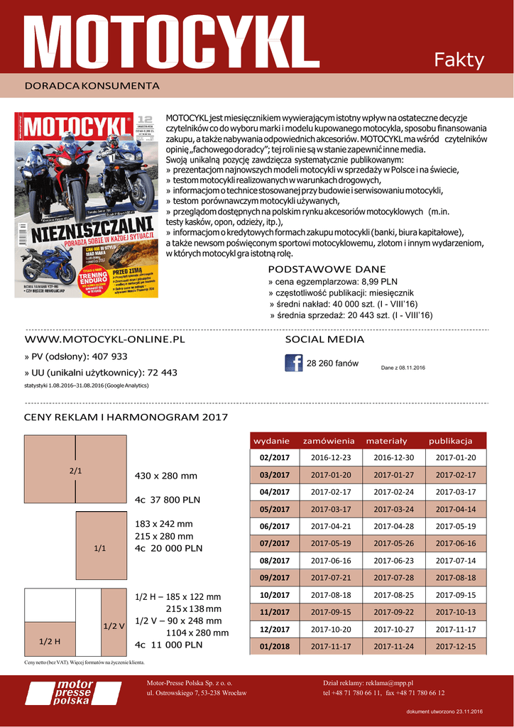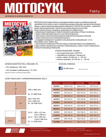 Fakty DORADCA KONSUMENTA MOTOCYKL jest miesięcznikiem wywierającym istotny wpływ na ostateczne decyzje czytelników co do wyboru marki i modelu kupowanego motocykla, sposobu finansowania zakupu, a także nabywania odpowiednich akcesoriów. MOTOCYKL ma wśród czytelników opinię „fachowego doradcy”; tej roli nie są w stanie zapewnić inne media. Swoją unikalną pozycję zawdzięcza systematycznie publikowanym: » prezentacjom najnowszych modeli motocykli w sprzedaży w Polsce i na świecie, » testom motocykli realizowanych w warunkach drogowych, » informacjom o technice stosowanej przy budowie i serwisowaniu motocykli, » testom porównawczym motocykli używanych, » przeglądom dostępnych na polskim rynku akcesoriów motocyklowych (m.in. testy kasków, opon, odzieży, itp.), » informacjom o kredytowych formach zakupu motocykli (banki, biura kapitałowe), a także newsom poświęconym sportowi motocyklowemu, zlotom i innym wydarzeniom, w których motocykl gra istotną rolę. PODSTAWOWE DANE » cena egzemplarzowa: 8,99 PLN » częstotliwość publikacji: miesięcznik » średni nakład: 40 000 szt. (I - VIII’16) » średnia sprzedaż: 20 443 szt. (I - VIII’16) WWW.MOTOCYKL-ONLINE.PL SOCIAL MEDIA » PV (odsłony): 407 933 28 260 fanów » UU (unikalni użytkownicy): 72 443 Dane z 08.11.2016 statystyki 1.08.2016–31.08.2016 (Google Analytics) CENY REKLAM I HARMONOGRAM 2017 wydanie 2/1 430 x 280 mm 4c 37 800 PLN 1/1 1/2 V 1/2 H 183 x 242 mm 215 x 280 mm 4c 20 000 PLN 1/2 H – 185 x 122 mm 215 x 138 mm 1/2 V – 90 x 248 mm 1104 x 280 mm 4c 11 000 PLN zamówienia materiały publikacja 02/2017 2016-12-23 2016-12-30 2017-01-20 03/2017 2017-01-20 2017-01-27 2017-02-17 04/2017 2017-02-17 2017-02-24 2017-03-17 05/2017 2017-03-17 2017-03-24 2017-04-14 06/2017 2017-04-21 2017-04-28 2017-05-19 07/2017 2017-05-19 2017-05-26 2017-06-16 08/2017 2017-06-16 2017-06-23 2017-07-14 09/2017 2017-07-21 2017-07-28 2017-08-18 10/2017 2017-08-18 2017-08-25 2017-09-15 11/2017 2017-09-15 2017-09-22 2017-10-13 12/2017 2017-10-20 2017-10-27 2017-11-17 01/2018 2017-11-17 2017-11-24 2017-12-15 Ceny netto (bez VAT). Więcej formatów na życzenie klienta. Motor-Presse Polska Sp. z o. o. ul. Ostrowskiego 7, 53-238 Wrocław Dział reklamy: [email protected] tel +48 71 780 66 11, fax +48 71 780 66 12 dokument utworzono 23.11.2016 Czytelnicy DORADCA KONSUMENTA ROZKŁAD WEDŁUG PŁCI kobiety 94% czytelników to aktywni i mający wielką satysfakcję z jazdy motocyklem mężczyźni. 6,1% mężczyźni 93,9% STRUKTURA WIEKOWA do 24 lat 8,4% 25–39 lat 52,5% 40 + lat 39,1% ROCZNY PRZEBIEG do 4 tys. km 29,2% 5-10 tys. km 41,9% 10-20 tys. km 24,0% 21 tys. km + 4,8% Blisko 56% czytelników to ludzie w wieku najwyższej aktywności zawodowej. Osoby będące „na swoim”, dla których jazda motocyklem to wspaniały sposób spędzania wolnego czasu. Średnio czytelnicy Motocykla przejeżdżają rocznie 7700 km. POSIADANIE MOTOCYKLI posiada motocykl 89,1% kupiony jako nowy 14,9% Jak wynika z przeprowadzonych badań blisko 90% naszych czytelników posiada motocykl. Blisko 15% posiada maszyny kupione jako nowe. PLANY ZAKUPOWE nakedy 19,8% skutery 1,3% choppery & cruisery 9,2% enduro & supermoto 19,7% sportowe 9,4% turystyczne 6,4% 39% naszych czytelników deklaruje chęć zakupu motocykla w ciągu najbliższych 24 miesięcy. Czytelnicy najczęściej wskazują zainteresowanie nakedami (blisko 20%). Na kolejnych miejscach motocykle enduro (19,7%) oraz sportowe i choppery/cruisery. Źródło: badanie „BEST BIKES 2016”. Motor-Presse Polska Sp. z o. o. ul. Ostrowskiego 7, 53-238 Wrocław Dział reklamy: [email protected] tel +48 71 780 66 11, fax +48 71 780 66 12 dokument utworzono 26.08.2015