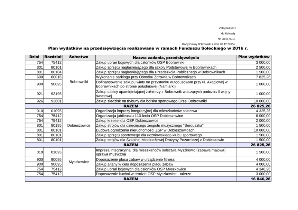Załącznik nr 6 do Uchwały Nr XIII/176/15 Rady Gminy Bobrowniki z dnia 28.12.2015 r. Plan wydatków na przedsięwzięcia realizowane w ramach Funduszu Sołeckiego w 2016 r. Dział Rozdział 754 75412 801 80101 801 80104 600 60016 900 90095 921 92195 926 92601 010 754 754 801 801 801 801 01095 75412 75412 80195 80101 80101 80101 010 01095 900 900 754 754 90095 90095 75412 75412 Sołectwo Bobrowniki Dobieszowice Myszkowice Nazwa zadania, przedsięwzięcia Zakup ubrań bojowych dla członków OSP Bobrowniki Zakup sprzętu nagłaśniającego dla szkoły Podstawowej w Bobrownikach Zakup sprzętu nagłaśniającego dla Przedszkola Publicznego w Bobrownikach Wykonanie parkingu przy Ośrodku Zdrowia w Bobrownikach Dofinansowanie zakupu wiaty na przystanku autobusowym przy ul. Akacjowej w Bobrownikach po stronie południowej (Namiarki) Zakup tablicy upamiętniającej żołnierzy z Bobrownik walczących podczas II wojny światowej Zakup siedzisk na trybuny dla boiska sportowego Orzeł Bobrowniki RAZEM Organizacja imprezy integracyjnej dla mieszkańców sołectwa Organizacja jubileuszu 110-lecia OSP Dobieszowice Zakup krzeseł dla OSP Dobieszowice Zakup strojów dla dziecięcego zespołu muzycznego "Serduszka" Budowa ogrodzenia nieruchomości ZSP w Dobieszowicach Zakup sprzętu sportowego dla uczniowskiego klubu sportowego Zakup strojów dla Szkolnej Młodzieżowej Drużyny Pożarniczej z Dobieszowic RAZEM Impreza integracyjna dla mieszkańców sołectwa Myszkowic (zabawa majowa) oprawa muzyczna Doposażenie placu zabaw w urządzenie fitness Zakup altany w celu doposażenia placu zabaw Zakup ubrań bojowych dla członków OSP Myszkowice Doposażenie kuchni w remizie OSP Myszkowice - talerze RAZEM Plan wydatków 3 000,00 2 500,00 1 500,00 7 825,26 1 000,00 1 000,00 10 000,00 26 825,26 4 325,26 6 000,00 2 000,00 1 500,00 10 000,00 1 500,00 1 500,00 26 825,26 1 500,00 4 000,00 4 000,00 4 346,26 3 000,00 16 846,26 900 926 754 921 010 801 801 90095 92601 75412 92195 01095 80101 80104 010 01095 754 921 010 921 75412 92195 01095 92109 921 92116 801 80101 Zakup i montaż daszków nad drzwiami wejściowymi w budynku ZSP w Sączowie 801 80101 754 801 921 010 010 010 010 75412 80110 92116 01095 01095 01095 01095 Siemonia 754 010 921 75412 01095 92195 Twardowice Zakup nagród dla dzieci z okazji 100-lecia ZSP w Sączowie RAZEM Zakup nożyc hydraulicznych dla jednostki OSP Siemonia Zakup tablicy interaktywnej dla Gimnazjum w Siemoni Doposażenie Biblioteki Publicznej - zakup stolika, biblioteczki, antyramy Impreza integracyjna dla mieszkańców sołectwa "Siemoniada zimowa" Impreza integracyjna dla mieszkańców sołectwa "Siemoniada letnia" Impreza integracyjna dla mieszkańców Siemoni (w marcu) Impreza integracyjna dla mieszkańców Siemoni (we wrześniu) RAZEM Remont toalet w Remizie OSP Twardowice Impreza integracyjna dla mieszkańców sołectwa Twardowice Zakup koszul dla kapeli dętej z Twardowic RAZEM Rogoźnik Sączów Pielęgnacja skwerków w Rogoźniku Zakup bramki na boisko Cyklon w Rogoźniku Zakup szafek ubraniowych dla członków OSP w Rogoźniku Zakup strojów ludowych dla Zespołu Regionalnego "Rogozanki" Zakup namiotu plenerowego dla organizacji imprez organizacyjnych Zakup szafek dla ZS w Rogoźniku Zakup lodówki i pralki dla PP w Rogoźniku Organizacja imprezy integracyjnej dla mieszkańców sołectwa Rogoźnik - urodziny Rogoźnika RAZEM Zakup ubrań bojowych dla członków OSP Sączów Zakup strojów dla Zespołu Śpiewaczego "Sączowianki" Organizacja imprezy integracyjnej dla mieszkańców sołectwa Sączów Zakup stołów na salę widowiskową w Domu Kultury w Sączowie Naprawa instalacji oświetleniowej i wymiana lamp w Bibliotece Publicznej w Sączowie 1 000,00 3 000,00 3 000,00 3 500,00 3 000,00 5 500,00 2 000,00 5 825,26 26 825,26 8 000,00 3 000,00 2 000,00 6 000,00 3 000,00 4 000,00 825,26 26 825,26 6 000,00 10 000,00 825,26 2 500,00 4 500,00 1 500,00 1 500,00 26 825,26 13 000,00 2 658,49 1 000,00 16 658,49 010 01095 010 01095 010 01095 754 754 754 900 75412 75412 75412 90095 Wymysłów Organizacja imprezy integracyjnej dla mieszkańców sołectwa Wymysłów w m-cu marcu, w tym: Organizacja imprezy integracyjnej dla mieszkańców sołectwa Wymysłów w m-cu czerwcu, w tym: Organizacja imprezy integracyjnej dla mieszkańców sołectwa Wymysłów w m-cu grudniu, w tym: Zakup opału do remizy OSP Wymysłów Doposażenie jednostki OSP Wymysłów w sprzęt ratownictwa medycznego Zakup szafy do zaplecza kuchennego w remizie OSP Wymysłów Zakup wyposażenia placu zabaw - zakup urządzenia fitness RAZEM Fundusz Sołecki ogółem w 2016 r. 500,00 2 500,00 1 150,00 1 266,24 6 500,00 2 000,00 8 000,00 21 916,24 189 547,29