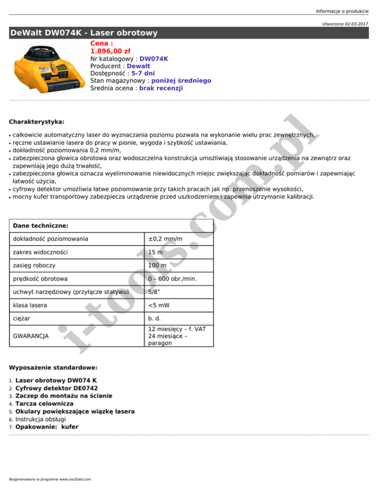 Informacje o produkcie Utworzono 02-03-2017 DeWalt DW074K - Laser obrotowy Cena : 1.896,00 zł Nr katalogowy : DW074K Producent : Dewalt Dostępność : 5-7 dni Stan magazynowy : poniżej średniego Średnia ocena : brak recenzji Charakterystyka: ● ● ● ● ● całkowicie automatyczny laser do wyznaczania poziomu pozwala na wykonanie wielu prac zewnętrznych, ręczne ustawianie lasera do pracy w pionie, wygoda i szybkość ustawiania, dokładność poziomowania 0,2 mm/m, zabezpieczona głowica obrotowa oraz wodoszczelna konstrukcja umożliwiają stosowanie urządzenia na zewnątrz oraz zapewniają jego dużą trwałość, zabezpieczona głowica oznacza wyeliminowanie niewidocznych miejsc zwiększając dokładność pomiarów i zapewniając łatwość użycia, cyfrowy detektor umożliwia łatwe poziomowanie przy takich pracach jak np. przenoszenie wysokości, mocny kufer transportowy zabezpiecza urządzenie przed uszkodzeniem i zapewnia utrzymanie kalibracji. m .p l ● co ● Dane techniczne: zakres widoczności 15 m 100 m to ol zasięg roboczy ±0,2 mm/m s. dokładność poziomowania prędkość obrotowa 0 – 600 obr./min. uchwyt narzędziowy (przyłącze statywu) 5/8” klasa lasera <5 mW b. d. i- ciężar GWARANCJA Wyposażenie standardowe: 1. 2. 3. 4. 5. 6. 7. Laser obrotowy DW074 K Cyfrowy detektor DE0742 Zaczep do montażu na ścianie Tarcza celownicza Okulary powiększające wiązkę lasera Instrukcja obsługi Opakowanie: kufer Wygenerowano w programie www.oscGold.com 12 miesięcy – f. VAT 24 miesiące – paragon