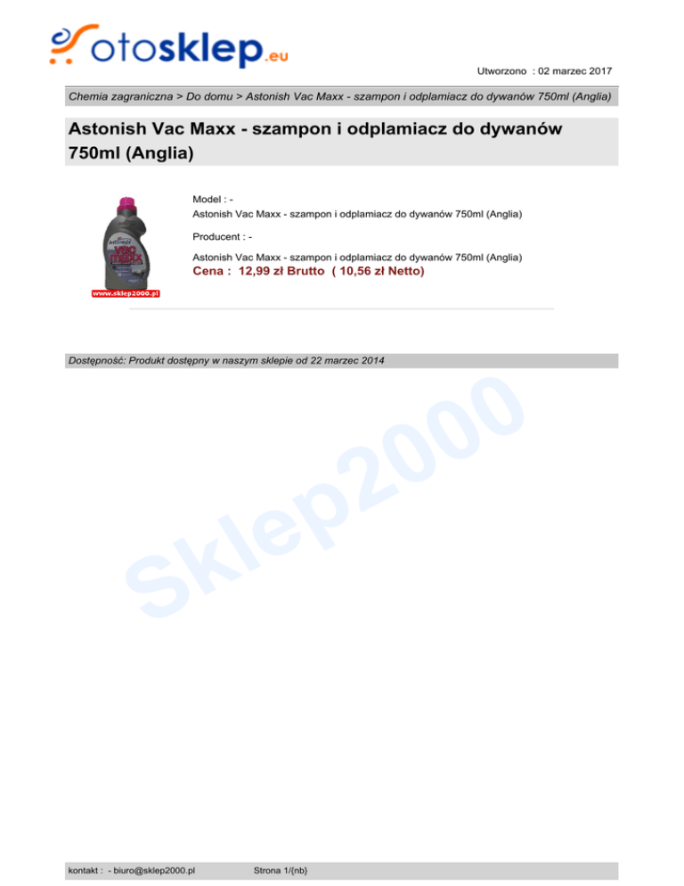 Utworzono : 02 marzec 2017 Chemia zagraniczna > Do domu > Astonish Vac Maxx - szampon i odplamiacz do dywanów 750ml (Anglia) Astonish Vac Maxx - szampon i odplamiacz do dywanów 750ml (Anglia) Model : Astonish Vac Maxx - szampon i odplamiacz do dywanów 750ml (Anglia) Producent : Astonish Vac Maxx - szampon i odplamiacz do dywanów 750ml (Anglia) Cena : 12,99 zł Brutto ( 10,56 zł Netto) Dostępność: Produkt dostępny w naszym sklepie od 22 marzec 2014 0 2 p le k S kontakt : - [email protected] Strona 1/{nb} 0 0