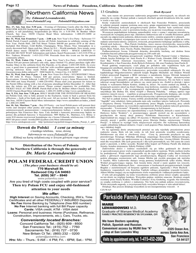 Page 12 News of Polonia Pasadena, California December 2008 Northern California News: By: Edmund Lewandowski, www.PoloniaSF.org [email protected] Dec. 27, Sat, San Jose 5:30 p.m. - Evening of Christmas Carols after the Holy Mass WIECZÓR KOLÊD Serdecznie zapraszamy wszystkich na Wieczór Kolęd w sobote, 27 grudnia, w sali parafialnej, bezpośrednio po Mszy św. o 5:30 PM. St. Brother Albert Church, San Jose, 10250 Clayton Road More information: 1-408-251-8490 or www.saintalbert.us Dec 31, Wed, San Francisco 7 p.m. - 2:00 a.m. New Year’s Eve Party - Sylwester !!!! Polish Parish Council cordially invites all Polish Americans to celebrate coming of the New Year. Parish Hall, 240 Fell Street Tickets $60.00 per person ($70 at the door). Included: Hot Dinner, Cold Buffet, Champagne, Wine, Music, Nice Atmosphere in a nicely decorated hall. Open cash bar. Music by D.J. - World standards, New trends, some Polish dance music TICKETS ADVANCE SALE ONLY - SPACE LIMITED !!! PLEASE DO NOT WAIT Information and tickets: Karol Piestrzynski 1-415-519-5756 or Rev. Tadeusz Winnicki 1-415-252-5799. Proceeds from this event are for the parish community affairs. Dec 31, Wed, Union City 7 p.m. - 2 a.m. New Year’s Eve Party - SYLWESTER!!! Tickets $30 per person (advance sale only, space limited !!!), please purchase right after Sunday Mass in the cafeteria from Ela Pajerski, or by phone 1-650-349-3630; As every year, a good time is guaranteed. Cash bar with excellent appetizers and drinks. Kitchen serving delicious home made Polish dishes. Wszystkich serdecznie zapraszamy. Gwarantowana dobra zabawa!!! 3880 Smith St., Union City, CA 94587 Dec 31, Wed, San Jose 8 p.m. - 2 a.m. New Years Eve Party - SYLWESTER!!! Music by DJ John D. Posey. Tickets: $50 per person, reservations: Space is limited. Reservations: Urszula Sobczyk 1-408-227-7346 (after 6 p.m.), Anna Wnorowska 1-408390-1884 and Anna Pisański 1-408-226-8502. Please mail your payment for tickets to the Parish Office (along with a list of persons attending) before December 21. After that date the tickets are $70 per person. Please contact organizers for avaliability. NO TICKET SALE AT THE DOOR. Parish Hall of the St. Brother Albert Church, San Jose, 10250 Clayton Road More information: 1-408-251-8490 or http://www.saintalbert.us Jan, 9, Fri, San Jose 7:30 p.m. HOLY MASS FOR THE INTENTION OF HEALING (in Polish) God, who is fully present in the Eucharist, wants to heal a person from his afflictions -- both of his body and of his soul. All are invited. St. Brother Albert Church, San Jose, 10250 Clayton Road More information: http://www.saintalbert.us/index_e.html or 1-408-251-8490 Jan 10, Sat, Martinez 7 p.m. - Bay Of Poetry - our local Polish poets will present their works and interpret other poetry and songs Serdecznie zapraszamy na nią wszystkich zainteresowanych poznawaniem i rozpowszechnianiem kultury i sztuki w środowisku polonijnym San Francisco Bay Area. Cały dochód z koncertu przeznaczony będzie na pomoc dla polskich harcerzy w Kazachstanie. 909 Mellus St., Martinez, CA. Bilety w cenie $10 mozna rezerwować kontaktujac się z Iwona Urbaniak, telefonicznie 1-925-6856035 lub przez email: [email protected] More information: http://www.zatokapoezji.com/ http://poloniasf.org/polish/images/Zatoka_Poezji_2_.pdf Dzwoń do Polski 1 cent za minutę z każdego telefonu, teraz, dzisiaj Informacja na www.PoloniaSF.org Kliknij na kartę telefoniczną w lewym górnym rogu strony Distribution of the News of Polonia In Northern California is through the generosity of Dr. Marie Lewandowski POLAM FEDERAL CREDIT UNION (The place your business should be at) 770 Marshall St. Redwood City CA 94063 Tel. (650) 367 – 8940 www.polamfcu.com Are you tired of high costs coupled with poor service? Then try Polam FCU and enjoy old-fashioned attention to your needs We offer: High Interest on Saving Accounts, Checking, IRA’s, Time Certificates and all other FEDERALLY INSURED Deposits No Fee Home Banking by Telephone (free 800 number) No Fee Internet banking with full Bill Payer capacity Cards: VISA credit; ATM - VISA debit Loans: Personal and business: Home (Purchase, Refinance, Construction, Improvements, etc.), Cars, Trucks, etc. Conveniently located Branches: Concord California Tel.: (925) 609 - 8500 San Francisco Tel.: (415) 752 – 7760 Sacramento Tel.: (916) 727 - 0730 New Britain Ct Tel.: (860) 232 – 0200 [email protected] Hrs: Mo – Thurs.: 9 AM – 4 PM; Fri. - 6PM; Sat.- 1PM; 13 Grudnia Druh Ryszard Nie, tym razem nie przerwano nadawania programów telewizyjnych, na ulicach nie pojawiły się czołgi. Pamięć jednak o tamtych chwilach sprzed dwudziestu kilu lat, nadal w wielu z nas żyje. Kiedy większość zamieszkałych w okolicach San Francisko Polaków, przeciarała w sobotni poranek zaspane jesienną aurą oczy, grupa organizatorów naszej tradycyjnej Wigilii Polonijnej kończyła przygotowywanie potraw. Słychać było rytmiczne ruchy robotów kuchennych, czuć w powietrzu troskę, czy na pewno wszystkiego wystarczy. Wczesnym popołudniem kolumna samochodów wraz z cenną i smaczną zawartością, wyruszyła do wynajętej przez mjr. Zdzisława Jarkiewicza sali w osiedlu Rossmoor, gdzie zaczęło się odgrzewanie jedzenia, dekorowanie stołów, ostatnie poprawki w planach. Harcerska młodzież występująca tym razem w roli kelnerów chętnie przyjęła na siebie zadanie ustawiania talerzy, sztućców, świeczek, przyjemności kolejnego spotkania z sobą. Wśród nich hufcowy – Phm Patryk Grobelny, nieco starsza rówieśniczka, nauczycielka z polskiej szkoły – Marzena Urbaniak oraz fantastyczna grupa Kaś, Patryków, Robertów, Karin, Beat, Natali, Anit, Nicole, Paulin, Marcinów i wielu innych. Podharcmistrzyni Iwona Urbaniak dziarsko dowodziła kuchnią, zaś druhna Irena Grobelna bacznie pilnowała przygotowanej na 250 osób sali. Całą Wieczerzę Wigilijną przygotowali wspólnie: Polish Pastoral Center z Martinez, Szkoła Języka Polskiego im.