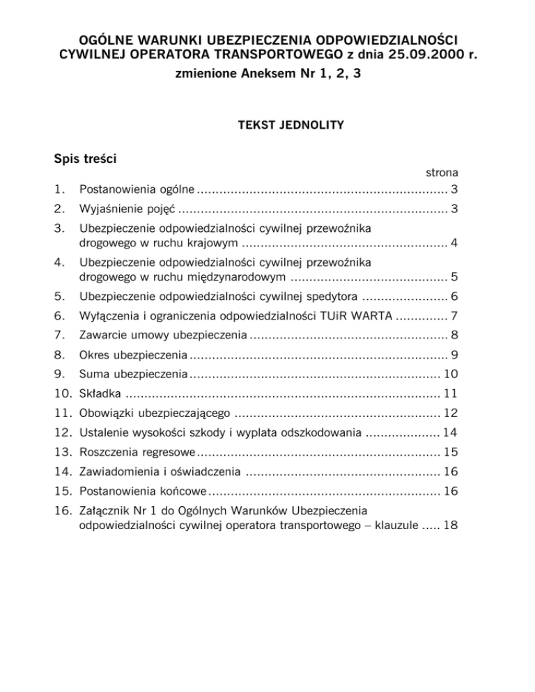 OGÓLNE WARUNKI UBEZPIECZENIA ODPOWIEDZIALNOŚCI CYWILNEJ OPERATORA TRANSPORTOWEGO z dnia 25.09.2000 r. zmienione Aneksem Nr 1, 2, 3 TEKST JEDNOLITY Spis treści strona 1. Postanowienia ogólne ................................................................... 3 2. Wyjaśnienie pojęć ........................................................................ 3 3. Ubezpieczenie odpowiedzialności cywilnej przewoźnika drogowego w ruchu krajowym ....................................................... 4 4. Ubezpieczenie odpowiedzialności cywilnej przewoźnika drogowego w ruchu międzynarodowym .......................................... 5 5. Ubezpieczenie odpowiedzialności cywilnej spedytora ....................... 6 6. Wyłączenia i ograniczenia odpowiedzialności TUiR WARTA .............. 7 7. Zawarcie umowy ubezpieczenia ..................................................... 8 8. Okres ubezpieczenia ..................................................................... 9 9. Suma ubezpieczenia ................................................................... 10 10. Składka .................................................................................... 11 11. Obowiązki ubezpieczającego ....................................................... 12 12. Ustalenie wysokości szkody i wyplata odszkodowania .................... 14 13. Roszczenia regresowe ................................................................. 15 14. Zawiadomienia i oświadczenia .................................................... 16 15. Postanowienia końcowe .............................................................. 16 16. Załącznik Nr 1 do Ogólnych Warunków Ubezpieczenia odpowiedzialności cywilnej operatora transportowego – klauzule ..... 18 1 2 Postanowienia ogólne §1 1. Ogólne warunki ubezpieczenia odpowiedzialności cywilnej operatora transportowego (zwane dalej OWU) mają zastosowanie do umów ubezpieczenia zawieranych przez Towarzystwo Ubezpieczeń i Reasekuracji “WARTA” Spółka Akcyjna, zwane dalej TUiR WARTA, z operatorami transportowymi będącymi osobami fizycznymi, osobami prawnymi lub jednostkami organizacyjnymi nie posiadającymi osobowości prawnej, zwanymi dalej “ubezpieczającym”. 2. Na podstawie niniejszych OWU mogą być zawierane następujące rodzaje umów ubezpieczenia: 1) umowa ubezpieczenia odpowiedzialności cywilnej przewoźnika drogowego w ruchu krajowym, 2) umowa ubezpieczenia odpowiedzialności cywilnej przewoźnika drogowego w ruchu międzynarodowym, 3) umowa ubezpieczenia odpowiedzialności cywilnej spedytora. 3. Umowa ubezpieczenia może być zawarta na cudzy rachunek. WYJAŚNIENIE POJĘĆ §2 Przez użyte w niniejszych OWU określenia rozumie się: 1. operator transportowy – przedsiębiorca prowadzący zarobkową, zarejestrowaną zgodnie z obowiązującymi przepisami prawnymi działalność przewozową, spedycyjną lub spedycyjno –przewozową, który zawarł umowę ubezpieczenia lub na rzecz którego została zawarta umowa ubezpieczenia; 2. akt terrorystyczny – użycie przemocy dla osiągnięcia celów politycznych, skierowanej przeciw społeczeństwu z zamiarem jego zastraszenia; 3. kontener – urządzenie transportowe o trwałym charakterze i odpowiedniej wytrzymałości zapewniającej możliwość wielokrotnego używania, o pojemności co najmniej jednego metra sześciennego, specjalnie zaprojektowane w celu ułatwienia przewozu towarów jednym lub kilkoma rodzajami środków transportu; 4. list przewozowy lub inny dokument przewozowy – dokument wystawiony zgodnie z ustawą Prawo przewozowe, zawierający następujące dane: 1) nazwisko lub nazwę i adres nadawcy przesyłki, 2) nazwisko lub nazwę i adres odbiorcy przesyłki, 3) nazwisko lub nazwę i adres przewoźnika, 4) miejsce przeznaczenia przesyłki (dokładny adres), 5) miejsce i datę załadowania przesyłki, 6) określenie rodzaju i gatunku przewożonego towaru, jego masy, liczby sztuk oraz sposobu opakowania i oznaczenia, 7) inne wskazania i oświadczenia wymagane albo dopuszczone zgodnie z przepisami ze względu na warunki danej umowy lub sposób rozliczeń. 5. list przewozowy CMR – dokument wystawiony zgodnie z Konwencją o Umowie Międzynarodowego Przewozu Drogowego Towarów (CMR); 3 6. parking strzeżony – teren wydzielony, całodobowo dozorowany, oświetlony w porze nocnej, wyposażony w urządzenia blokujące wjazd i wyjazd, które uniemożliwiają wjazd i wyjazd pojazdu bez zezwolenia osoby dozorującej parking; 7. przesyłka – towary przyjęte do przewozu na podstawie jednego listu przewozowego lub innego dokumentu przewozowego (objęte jedną umową przewozu); 8. przewoźne – wynagrodzenie za usługę przewozową; 9. rabunek (rozbój) – zabór mienia przez sprawcę w celu przywłaszczenia przy użyciu przemocy fizycznej lub groźby jej natychmiastowego użycia wobec ubezpieczającego, osób za które ponosi odpowiedzialność albo przez doprowadzenie ubezpieczającego lub tych osób do stanu nieprzytomności lub bezbronności; 10. SDR – Specjalne Prawa Ciągnienia /Special Drawing Rights/ – pieniądz kreowany przez Międzynarodowy Fundusz Walutowy; 11. szkoda, na którą składają się: 1) szkoda rzeczowa – szkoda polegająca na utracie, ubytku lub uszkodzeniu przesyłki lub 2) szkoda finansowa – wyrażona w pieniądzu strata finansowa powstała w związku z niewykonaniem lub nienależytym wykonaniem przez ubezpieczającego zobowiązań z umowy przewozu lub spedycji, nie obejmująca utraconych korzyści tj. korzyści które można by osiągnąć, gdyby zdarzenie powodujące szkodę nie zaistniało; 12. wartości pieniężne – pieniądze, będące w kraju lub za granicą prawnym środkiem płatniczym (waluta polska lub waluty obce), a także pełniące funkcję płatniczą: weksle, czeki, czeki podróżnicze, akredytywy, polecenia wypłat, przekazy i inne dokumenty bankowe i finansowe płatne w walucie polskiej lub walutach obcych oraz złoto, srebro i wyr