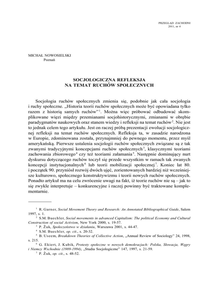 PRZEGLA˛D ZACHODNI 2011, nr 4 MICHAŁ NOWOSIELSKI Michał Nowosielski Poznań SOCJOLOGICZNA REFLEKSJA NA TEMAT RUCHÓW SPOŁECZNYCH Socjologiczna refleksja na temat ruchów społecznych Socjologia ruchów społecznych zmienia sie˛, podobnie jak cała socjologia i ruchy społeczne. „Historia teorii ruchów społecznych może być opowiadana tylko razem z historia˛ samych ruchów” 1. Można wie˛c próbować odbudować skomplikowane wie˛zi mie˛dzy przemianami socjohistorycznymi, zmianami w obre˛bie paradygmatów naukowych oraz stanem wiedzy i refleksji na temat ruchów 2. Nie jest to jednak celem tego artykułu. Jest on raczej próba˛ prezentacji ewolucji socjologicznej refleksji na temat ruchów społecznych. Refleksja ta, w zasadzie narodzona w Europie, zdominowana została, przynajmniej do pewnego momentu, przez myśl amerykańska˛. Pierwsze ustalenia socjologii ruchów społecznych zwia˛zane sa˛ z tak zwanymi tradycyjnymi koncepcjami ruchów społecznych 3, klasycznymi teoriami zachowania zbiorowego 4 czy też teoriami załamania 5. Naste˛pnie dominuja˛cy nurt dyskursu dotycza˛cego ruchów toczył sie˛ przede wszystkim w ramach tak zwanych koncepcji instytucjonalnych 6 lub teorii mobilizacji społecznej 7. Koniec lat 80. i pocza˛tek 90. przyniósł rozwój dwóch uje˛ć, zorientowanych bardziej niż wcześniejsze kulturowo, społecznego konstruktywizmu i teorii nowych ruchów społecznych. Ponadto artykuł ma na celu zwrócenie uwagi na fakt, iż teorie ruchów nie sa˛ – jak to sie˛ zwykle interpretuje – konkurencyjne i raczej powinny być traktowane komplementarnie. 1 R. Garner, Social Movement Theory and Research: An Annotated Bibliographical Guide, Salem 1997, s. 1. 2 S.M. Buechler, Social movements in advanced Capitalism: The political Economy and Cultural Construction of social Activism, New York 2000, s. 19-57. 3 P. Żuk, Społeczeństwo w działaniu, Warszawa 2001, s. 44-47. 4 S.M. Buechler, op. cit., s. 20-32. 5 B. Useem, Breakdown Theories of Collective Action, „Annual Review of Sociology” 24, 1998, s. 215. 6 G. Ekiert, J. Kubik, Protesty społeczne w nowych demokracjach: Polska, Słowacja, We˛gry i Niemcy Wschodnie (1989-1994), „Studia Socjologiczne” 147, 1997, s. 21-59. 7 P. Żuk, op. cit., s. 48-52. 4 Michał Nowosielski POCZA˛TKI SOCJOLOGICZNYCH TEORII RUCHÓW SPOŁECZNYCH Po raz pierwszy termin „ruchy społeczne” (soziale Bewegungen) został użyty przez niemieckiego badacza Lorenza von Steina 8. Analizuja˛c rozwój socjalizmu i komunizmu we Francji, stwierdził, iż nie należy traktować ich – jak to czyniło sie˛ w jego czasach – jedynie w kategoriach ideologii czy doktryn, ale trzeba spojrzeć na nie jako na da˛żność proletariatu do uzyskania politycznej i ekonomicznej władzy, jako działanie czy w końcu jako ruch społeczny 9. To dzie˛ki von Steinowi w europejskich naukach społecznych przez dłuższy czas ruch społeczny kojarzono przede wszystkim z ruchem robotniczym. Zmiany w rozumieniu tego terminu wprowadził dopiero Rudolf Heberle, który do rodziny ruchów społecznych zaliczył także ruchy chłopskie, faszyzm, narodowy socjalizm oraz nacjonalistyczne ruchy skierowane przeciw kolonializmowi. Wielka˛ zasługa˛ Haberlego jest przypisanie ruchom społecznym istotnej roli w kształtowaniu sfery politycznej 10. Jego tezy wyprzedzaja˛ w tym wzgle˛dzie osia˛gnie˛cia amerykańskiej teorii ruchów społecznych o około 20 lat 11. Amerykańskie podejście do ruchów społecznych było pocza˛tkowo zdominowane przez ustalenia Roberta E. Parka, który zaadaptował zapocza˛tkowana˛ w XIX w. przez Le Bona i Tarde’a teorie˛ zachowania zbiorowego, rozumianego jako poste˛powanie jednostek pod wpływem wspólnego impulsu 12. Impuls taki jest rezultatem społecznej interakcji 13. Zachowania zbiorowe stawiano w opozycji do konwencjonalnych zachowań społecznych, dowodza˛c, iż w małym stopniu rza˛dza˛ sie˛ one normami – dostrzegano w nich przede wszystkim czynnik społecznej dezintegracji. Do jednej szerokiej kategorii zaliczano tak niejednorodne zjawiska, jak: „bunty, rewolucje, powstania, rebelie, zamieszki, protesty, strajki, reakcje na katastrofy, wybuchy paniki, masowe obłe˛dy, mode˛, pogłoski, plotki, zgromadzenia, publiczność, tłum etc.” 14 W tej samej grupie lokowano również ruchy społeczne, które w zwia˛zku z tym postrzegano jako anormalne, dysfunkcjonalne zjawiska wywołuja˛ce dezintegracje˛. 8 Por. np. L. von Stein, Geschichte der sozialen Bewegung in Frankreich von 1789 bis auf unsere Tage, Lipsk 1850. 9 B. Misztal, Ruch społeczny, hasło w: Encyklopedii socjologii, t. 3, Warszawa 2001, s. 342-343; patrz także F. Chazel, Sociology of social movements, hasło w: International Encyclopedia of the Social & Behavioral Sciences, www.sciencedirec.com. 10 F. Chazel, op. cit. 11 R. Haberle, Social Movements: An Introduction to Political Sociology, New York 1951. 12 Por. P. Sztompka, Dynamika ruchu odnowy w świetle teorii zachowania zbiorowego, „Studia Socjologiczne” t. 86-87, 1982, s. 71. 13 R. Park, Collective behavior, w: R. Park, E. W. Burgess (eds.), Introduction to the Science of Sociology, Chicago 1924, s. 865. 14 B. Misztal, Socjologiczna teoria ruchów społecznych, „Studia Socjologiczne” t. 92, 1984, nr 1, s. 116-117. Socjologiczna refleksja na temat ruchów społecznych 5 Park zaproponował rozwijany przez późniejszych badaczy schemat sekwencji rozwoju ruchu: „Najpierw mamy do czynienia z niewyraźnym niepokojem lub niezadowoleniem. Naste˛pnie powstaje pełen przemocy, zagubiony, nieuporza˛dkowany, ale entuzjastyczny i powszechny ruch. Naste˛pnie ruch ten przybiera forme˛: wyłania przywództwo, organizacje˛, formułuje doktryny i dogmaty. W końcu ewentualnie zostaje społecznie zaakceptowany, ugruntowany, zalegalizowany. Ruch wie˛c umiera, ale instytucja pozostaje” 15. TEORIE DZIAŁANIA ZBIOROWEGO Klasyczne teorie zachowania zbiorowego, które wprost 