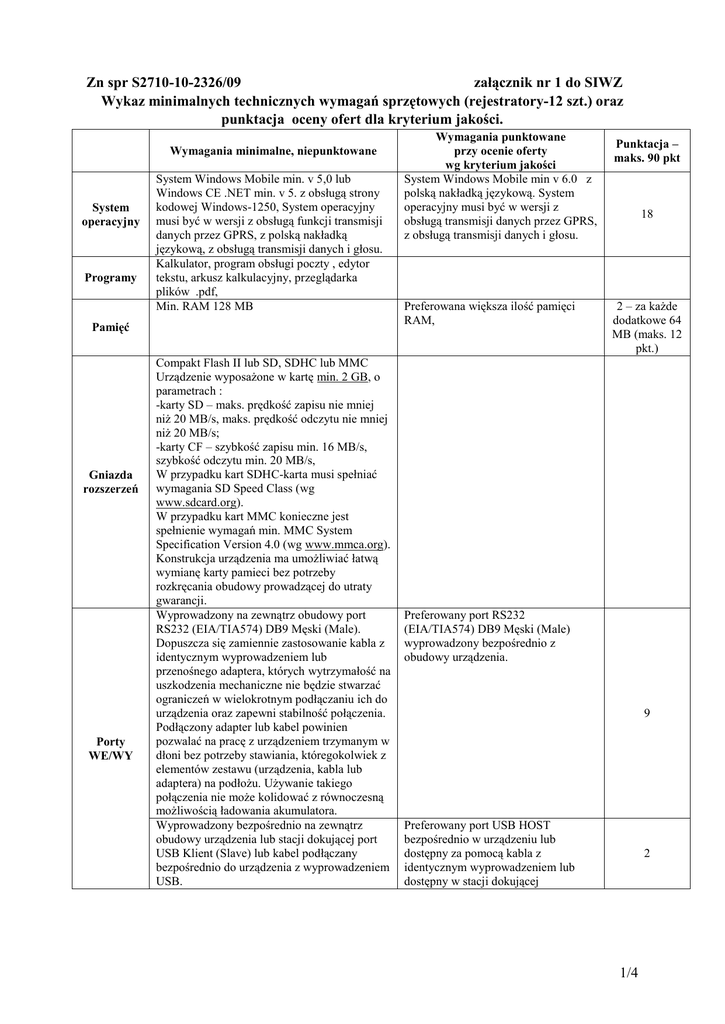 Zn spr S2710-10-2326/09 załącznik nr 1 do SIWZ Wykaz minimalnych technicznych wymagań sprzętowych (rejestratory-12 szt.) oraz punktacja oceny ofert dla kryterium jakości. Wymagania minimalne, niepunktowane System operacyjny Programy System Windows Mobile min. v 5,0 lub Windows CE .NET min. v 5. z obsługą strony kodowej Windows-1250, System operacyjny musi być w wersji z obsługą funkcji transmisji danych przez GPRS, z polską nakładką językową, z obsługą transmisji danych i głosu. Kalkulator, program obsługi poczty , edytor tekstu, arkusz kalkulacyjny, przeglądarka plików .pdf, Min. RAM 128 MB Pamięć Gniazda rozszerzeń Porty WE/WY Compakt Flash II lub SD, SDHC lub MMC Urządzenie wyposażone w kartę min. 2 GB, o parametrach : -karty SD – maks. prędkość zapisu nie mniej niż 20 MB/s, maks. prędkość odczytu nie mniej niż 20 MB/s; -karty CF – szybkość zapisu min. 16 MB/s, szybkość odczytu min. 20 MB/s, W przypadku kart SDHC-karta musi spełniać wymagania SD Speed Class (wg www.sdcard.org). W przypadku kart MMC konieczne jest spełnienie wymagań min. MMC System Specification Version 4.0 (wg www.mmca.org). Konstrukcja urządzenia ma umożliwiać łatwą wymianę karty pamieci bez potrzeby rozkręcania obudowy prowadzącej do utraty gwarancji. Wyprowadzony na zewnątrz obudowy port RS232 (EIA/TIA574) DB9 Męski (Male). Dopuszcza się zamiennie zastosowanie kabla z identycznym wyprowadzeniem lub przenośnego adaptera, których wytrzymałość na uszkodzenia mechaniczne nie będzie stwarzać ograniczeń w wielokrotnym podłączaniu ich do urządzenia oraz zapewni stabilność połączenia. Podłączony adapter lub kabel powinien pozwalać na pracę z urządzeniem trzymanym w dłoni bez potrzeby stawiania, któregokolwiek z elementów zestawu (urządzenia, kabla lub adaptera) na podłożu. Używanie takiego połączenia nie może kolidować z równoczesną możliwością ładowania akumulatora. Wyprowadzony bezpośrednio na zewnątrz obudowy urządzenia lub stacji dokującej port USB Klient (Slave) lub kabel podłączany bezpośrednio do urządzenia z wyprowadzeniem USB. Wymagania punktowane przy ocenie oferty wg kryterium jakości System Windows Mobile min v 6.0 z polską nakładką językową. System operacyjny musi być w wersji z obsługą transmisji danych przez GPRS, z obsługą transmisji danych i głosu. Punktacja – maks. 90 pkt Preferowana większa ilość pamięci RAM, 2 – za każde dodatkowe 64 MB (maks. 12 pkt.) 18 Preferowany port RS232 (EIA/TIA574) DB9 Męski (Male) wyprowadzony bezpośrednio z obudowy urządzenia. 9 Preferowany port USB HOST bezpośrednio w urządzeniu lub dostępny za pomocą kabla z identycznym wyprowadzeniem lub dostępny w stacji dokującej 2 1/4 Zintegrowany Bluetooth class II (umożliwiający równoczesną bezkolizyjną pracę innych urządzeń radiowych tj. WiFi, GSM/GPRS, GPS) Wbudowany moduł GSM/GPRS umożliwiający zastosowanie karty SIM dowolnego operatora sieci komórkowej działającej w Polsce. Wyświetlacz Klawiatura Dźwięk Zasilanie Masa Warunki pracy Akcesoria Konstrukcja urządzenia ma umożliwiać łatwą wymianę karty bez potrzeby rozkręcania obudowy prowadzącej do utraty gwarancji. Kolorowy, podświetlany ekran dotykowy min. 3,5” min. 240*320/320*240 pix. Minimum 50 klawiszy, wydzielona alfanumeryczna, multifunkcyjna, z oddzielnymi klawiszami numerycznymi umożliwiająca wprowadzanie polskich znaków (w standardzie polski programisty). Możliwość ,,miękkiego” resetu urządzenia poprzez klawiaturę urządzenia (bez kasowania pamięci RAM). Głośnik lub brzęczyk Ładowalna bateria główna o największej pojemności oferowanej przez producenta urządzenia. Zapasowa bateria z możliwością ładowania poza urządzeniem za pomocą ładowarki sieciowej (stacji dokującej) lub zestaw akumulatorów zewnętrznych , z możliwością ładowania przy użyciu ładowarki sieciowej lub samochodowej, umożliwiający zasilanie (ładowanie) urządzenia. Bateria lub inne urządzenie podtrzymujące RAM co najmniej na czas wymiany baterii lub wymiany karty – czyli przez co najmniej 3 minuty, Ładowarka sieciowa i ładowarka samochodowa lub zamiast ładowarki samochodowej – uchwyt samochodowy z możliwością ładowania Maksymalnie 1000 g z baterią i wszystkimi wymaganymi wewnętrznymi modułami (kartami) wytrzymałość na 5 upadków (dowolną płaszczyzną i krawędzią urządzenia) na gładki beton z wysokości 1,2 m, temperatura pracy od minus 20º do plus 50ºC, spełnienie stopnia ochrony min. IP64 wg PN-92/E-08106 lub IEC529 Urządzenie musi pozostawać nieruchome w trakcie wprowadzania danych do urządzenia leżącego na płaskiej powierzchni Pasek na rękę (zabezpieczający przed wypadaniem z ręki), pasek na ramię, rysik, min 5 folii ochronnych na ekran, kabel USB do połączeń z PC, Zewnętrzna klawiatura podłączana bezpośrednio do urządzenia lub stacji dokującej, albo do urządzenia przez łącze bezprzewodowe Preferowany dostęp w stacji dokującej lub wyprowadzony bezpośrednio na zewnątrz obudowy lub dostępny za pomocą kabla z identycznym wyprowadzeniem port LAN (Ethernet 10/100 Base T) 4 Wbudowany moduł WLAN 802. 11b/g 3 Preferowany wyświetlacz full VGA min.480*640 lub 640*480 pix. 10 Preferowany wbudowany głośnik i mikrofon Preferowane zasilanie zapasowe z zewnętrznych akumulatorów z możliwością ładowania i zasilania komputera oraz innych urządzeń (np. drukarki termicznej) 1 6 Preferowana waga poniżej 750 g ze wszystkimi wymaganymi wewnętrznymi modułami (kartami) 7 Preferowana możliwość podłączenia do zewnętrznego monitora VGA pozwalającego na pełną obsługę 6 2/4 wszystkich aplikacji urządzenia wraz z ze wszystkimi akcesoriami, monitorem i okablowaniem Certyfikaty Gwarancja Instrukcje Inne wymagania Stacja dokująca kompatybilna z oferowanym przez Wykonawcę komputerem Handheldstacja dokująca umożliwiająca jednoczesne ładowanie baterii zapasowe