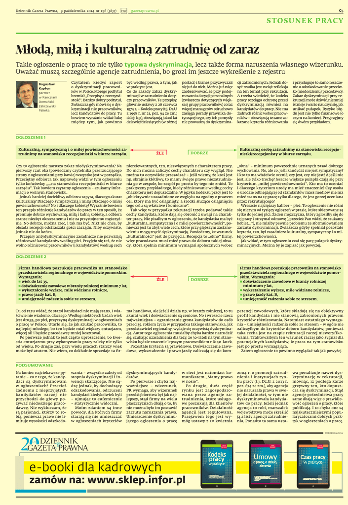 Dziennik Gazeta Prawna, 9 października 2014 nr 196 (3837) C5 gazetaprawna.pl stosunek pracy Młodą, miłą i kulturalną zatrudnię od zaraz Takie ogłoszenie o pracę to nie tylko typowa dyskryminacja, lecz także forma naruszenia własnego wizerunku. Uważać muszą szczególnie agencje zatrudnienia, bo grozi im jeszcze wykreślenie z rejestru Bogusław Kapłon partner w Kancelarii Domański Zakrzewski Palinka Czytałem kiedyś raport o dyskryminacji pracowników w Polsce, którego podtytuł brzmiał „Przepisy a rzeczywistość”. Bardzo dobry podtytuł. Zwłaszcza gdy mówi się o dyskryminacji nie pracowników, lecz kandydatów do pracy. Tu bowiem wyraźnie widać lukę między tym, jak powinno być według prawa, a tym, jak w praktyce jest. Co do zasady zakaz dyskryminacji w zatrudnieniu dotyczy pracowników. Te przepisy, głównie ustawy z 26 czerwca 1974 r. – Kodeks pracy (t.j. Dz.U. z 1998 r. nr 21, poz. 94 ze zm.; dalej: k.p.), obowiązują już od lat dziewięćdziesiątych (w różnej postaci) i biznes przyzwyczaił się już do nich. Można już więc zaobserwować, że przy podejmowaniu decyzji personalnych (zwłaszcza dotyczących większej grupy pracowników) coraz więcej managerów odruchowo zasięga porady prawnika dotyczącej tego, czy ich pomysły nie prowadzą do dyskrymina- cji zatrudnionych. Jednak dosyć rzadka jest wciąż refleksja na ten temat przy rekrutacji. A trzeba wiedzieć, że kodeks pracy rozciąga ochronę przed dyskryminacją również na kandydatów do pracy. Nie ma żadnych różnic wobec pracowników – obowiązują te same zakazane kryteria różnicowania i przysługuje to samo roszczenie o odszkodowanie przeciwko (niedoszłemu) pracodawcy. Zakaz dyskryminacji przy rekrutacji może dziwić, niemniej istnieje i warto nauczyć się, jak unikać pułapek. Ryzyko błędu jest nie tylko finansowe (o czym na koniec). Przyjrzyjmy się dwóm przykładom. OgłOszenie 1 Kulturalną, sympatyczną i o miłej powierzchowności zatrudnimy na stanowisku recepcjonistki w biurze zarządu. Czy to ogłoszenie narusza zakaz niedyskryminowania? Na pierwszy rzut oka (powiedzmy czytelnika przerzucającego strony z ogłoszeniami przy kawie) wszystko jest w porządku. Przeciętny odbiorca tak naprawdę widzi w tym ogłoszeniu tylko końcówkę: „…na stanowisku recepcjonistki w biurze zarządu”. Tak bowiem czytamy ogłoszenia – szukamy informacji o wolnym stanowisku. Jednak bardziej dociekliwy odbiorca zapyta, dlaczego akurat kulturalną? Dlaczego sympatyczną i miłą? Dlaczego o miłej powierzchowności? No i dlaczego kobietę? Wyraźnie bowiem ten przepis różnicuje kandydatów do pracy w ten sposób, że premiuje dobrze wychowaną, miłą i ładną kobietę, a odbiera szanse niezbyt okrzesanemu i nie za przystojnemu mężczyźnie. No dobrze, można rzec, i tak ma być. Nikt nie chce, by obsada recepcji odstraszała gości zarządu. Niby oczywiste, jednak nie do końca. Przepisy antydyskryminacyjne zasadniczo nie pozwalają różnicować kandydatów według płci. Przyjęło się też, że nie wolno różnicować pracowników (i kandydatów) według cech Kulturalną osobę zatrudnimy na stanowisku recepcjonistki/recepcjonisty w biurze zarządu. doBrzE ŹLE nierelewantnych, tzn. niezwiązanych z charakterem pracy. Do nich można zaliczyć cechy charakteru czy wygląd. Nie można tu oczywiście przesadzać – jeśli wiemy, że ktoś jest np. skrajnie kłótliwy, to mamy święte prawo niezatrudniania go w zespole, bo zespół po prostu by tego nie zniósł. To praktyczny przykład tego, kiedy różnicowanie według cechy charakteru jest dopuszczalne. W języku kodeksu pracy jest to „obiektywnie uzasadnione ze względu na zgodny z prawem cel, który ma być osiągnięty, a środki służące osiągnięciu tego celu są właściwe i konieczne”. Tak więc w przypadku rekrutacji trzeba podawać takie cechy kandydata, które dają się obronić z uwagi na charakter pracy. Nie pisałbym w ogłoszeniu, że kandydatka ma być „kulturalna, sympatyczna i o miłej powierzchowności”, ponieważ jest tu zbyt wiele cech, które przy głębszym zastanowieniu mogą trącić dyskryminacją. Powiedzmy, że warunek „kulturalności” jest do przyjęcia. Recepcja to „okno” firmy, więc pracodawca musi mieć prawo do doboru takiej obsady, która spełnia minimum wymagań społecznych wobec „okna” – minimum powszechnie uznanych zasad dobrego wychowania. No, ale co, jeśli kandydat nie jest sympatyczny? I kto to ma właściwie ocenić, czy jest, czy nie jest? A jeśli nie jest, ale tylko trochę? Jeszcze większe pułapki czają się przy kryterium „miłej powierzchowności”. Kto ma to oceniać i dlaczego kryterium urody ma mieć znaczenie? Czy osoba o urodzie odbiegającej od standardów mass mediów nie ma mieć szans na tę pracę tylko dlatego, że jest gorzej oceniana przez rekrutującego? Wreszcie najcięższy kaliber – płeć. To ogłoszenie nie różni się niczym od tysięcy ogłoszeń w prasie, które skierowane są tylko do jednej płci. Żaden mężczyzna, który zgłosiłby się do tej pracy i otrzymał odmowę („przecież Pan widzi, że szukamy kobiet…”), nie miałby pewnie problemu ze sformułowaniem zarzutu dyskryminacji. Zwłaszcza gdyby spełniał pozostałe kryteria, tzn. był zasadniczo kulturalny, sympatyczny i o miłej powierzchowności. Jak widać, w tym ogłoszeniu czai się parę pułapek dyskryminacyjnych. Można by je zapisać jak powyżej. OgłOszenie 2 Firma handlowa poszukuje pracownika na stanowisko przedstawiciela regionalnego w województwie pomorskim. Wymagania: n wiek do lat 35, n doświadczenie zawodowe w branży rolniczej minimum 7 lat, n wykształcenie wyższe, mile widziane rolnicze, n prawo jazdy kat. B, n umiejętność radzenia sobie ze stresem. Tu od razu widać, że starsi kandydaci nie mają szans. I właściwie nie wiadomo, dlaczego. Według niektórych badań wiek jest drugą, po płci, przyczyną d