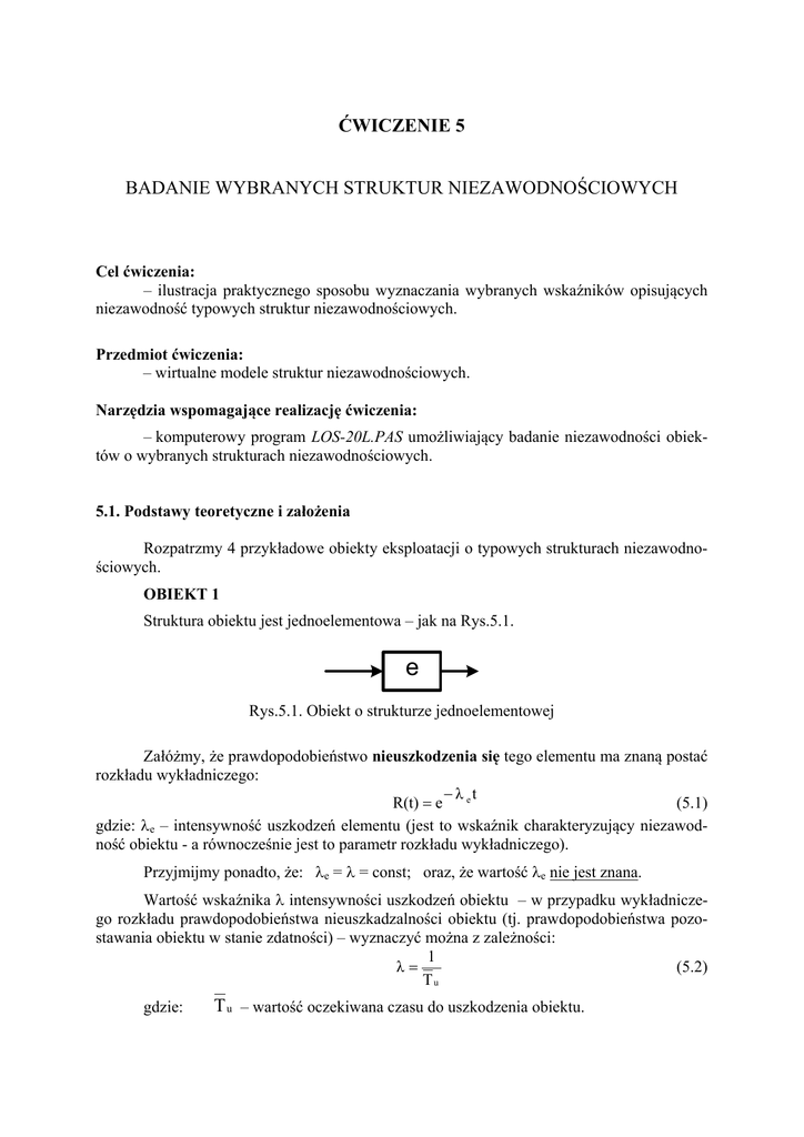 ĆWICZENIE 5 BADANIE WYBRANYCH STRUKTUR NIEZAWODNOŚCIOWYCH Cel ćwiczenia: – ilustracja praktycznego sposobu wyznaczania wybranych wskaźników opisujących niezawodność typowych struktur niezawodnościowych. Przedmiot ćwiczenia: – wirtualne modele struktur niezawodnościowych. Narzędzia wspomagające realizację ćwiczenia: – komputerowy program LOS-20L.PAS umożliwiający badanie niezawodności obiektów o wybranych strukturach niezawodnościowych. 5.1. Podstawy teoretyczne i założenia Rozpatrzmy 4 przykładowe obiekty eksploatacji o typowych strukturach niezawodnościowych. OBIEKT 1 Struktura obiektu jest jednoelementowa – jak na Rys.5.1. e Rys.5.1. Obiekt o strukturze jednoelementowej Załóżmy, że prawdopodobieństwo nieuszkodzenia się tego elementu ma znaną postać rozkładu wykładniczego: λ t (5.1) R(t) e e gdzie: e – intensywność uszkodzeń elementu (jest to wskaźnik charakteryzujący niezawodność obiektu - a równocześnie jest to parametr rozkładu wykładniczego). Przyjmijmy ponadto, że: e = = const; oraz, że wartość e nie jest znana. Wartość wskaźnika intensywności uszkodzeń obiektu – w przypadku wykładniczego rozkładu prawdopodobieństwa nieuszkadzalności obiektu (tj. prawdopodobieństwa pozostawania obiektu w stanie zdatności) – wyznaczyć można z zależności: 1 (5.2) λ Tu gdzie: T u – wartość oczekiwana czasu do uszkodzenia obiektu. OBIEKT 2 Obiekt 2 składa się z N szeregowo połączonych elementów – jak na Rys.5.2. Obiekt ten przedstawia szeregową strukturę niezawodnościową. Oznacza to, że obiekt jest tylko wtedy zdatny, gdy wszystkie jego elementy są zdatne. e2 e1 eN e3 Rys. 5.2. Obiekt o szeregowej strukturze niezawodnościowej Prawdopodobieństwo nieuszkadzalności dla takiego obiektu zapisujemy w postaci: N R SzN t R 1 t R 2 t R N t e λ1t e λ 2 t e λ N t e λ i t e λ1 λ 2 λ N t (5.3) i 1 gdzie: i – intensywność uszkodzeń elementu ei. Można wykazać, że również w przypadku takiego obiektu wartość oczekiwana czasu do uszkodzenia może być wyznaczona z zależności: T uSzN 1 (5.4) N Σ λi i 1 Jeśli przyjmiemy, że: λ1 λ 2 λ N λ to otrzymujemy: R SzN (t) e λt e N λt N oraz T uSzN 1 Nλ (5.5) Badany w ćwiczeniu obiekt jest 2-elementowy o strukturze jak na Rys.5.3. Elementy składowe obiektu mają jednakowe właściwości niezawodnościowe, takie same jak w obiekcie 1. e2 e1 Rys.5.3. Obiekt o strukturze szeregowej, dwuelementowej Zatem dla N = 2 mamy: R Sz2 (t) e λt e 2 λt oraz 2 T uSz2 1 2λ (5.6) OBIEKT 3 Obiekt 3 składa się z N równolegle połączonych elementów – jak na Rys.5.4. Obiekt ten przedstawia równoległą strukturę niezawodnościową z rezerwą obciążoną. Obiekt jest wtedy zdatny, gdy co najmniej jeden jego element jest zdatny. Zauważmy, że w tym przypadku wszystkie elementy pracują od początku funkcjonowania obiektu. 2 e1 e2 eN Rys. 5.4. Obiekt o równoległej strukturze niezawodnościowej z rezerwą obciążoną Prawdopodobieństwo nieuszkadzalności dla takiego obiektu zapisujemy w postaci: R RObcN t 1 1 R 1 t 1 R 2 t 1 R N t 1 1 e λ 1t 1 e 1 e 1 1 e ; λ 2 t N λ N t λ i t t0 (5.7) i 1 Jeśli przyjmiemy, że: R RObcN (t) 1 1 e λt λ 1 λ 2 λ N λ to otrzymujemy: N (5.8) Wartość oczekiwaną czasu do uszkodzenia obiektu o strukturze równoległej obciążonej wyznaczyć można z następującego wyrażenia: 0 0 T uRObcN R RObcN (t)dt 1 1 e λ e t N dt 1 1 1 0,577 ln N T ue 1 2 N λe (5.9) gdzie: λe – intensywność uszkodzeń elementu e; T ue - wartość oczekiwana czasu do uszkodzenia elementu e. Obiekt będący przedmiotem ćwiczenia posiada 2-elementową strukturę jak na Rys.5.5. e1 e2 Rys.5.5. Obiekt o strukturze równoległej, dwuelementowej z rezerwą obciążoną Elementy obiektu posiadają jednakowe właściwości niezawodnościowe, takie same jak element obiektu 1. Zatem dla N = 2: 3 T uRObc2 1,5 T ue 1,5 1,5 λe λ oraz R RObc2 (t) 1 1 e λt 2 (5.10) OBIEKT 4 Obiekt 4 składa się z N równolegle połączonych elementów, tak jak na Rys.5.6. Obiekt ten przedstawia równoległą strukturę niezawodnościową z rezerwą nieobciążoną. Obiekt jest wtedy zdatny, gdy co najmniej jeden jego element jest zdatny. Zauważmy, że w tym przypadku funkcjonowanie obiektu rozpoczyna się od uruchomienia 1-ego elementu (podstawowego). Pozostałe elementy początkowo nie pracują. Po uszkodzeniu pierwszego elementu zostaje uruchomiony drugi element (rezerwowy), po jego uszkodzeniu następny, itd. Zakładamy, że przełączenia odbywają się niezawodnie. e1 e2 eN Rys. 5.6. Obiekt o równoległej strukturze niezawodnościowej z rezerwą nieobciążoną Wartość oczekiwana czasu do uszkodzenia obiektu wynosi: T uRNobc T u1 T u2 T uN a prawdopodobieństwo nieuszkodzenia się obiektu do chwili t: λt 2 λt 3 ... λt N 1 eλt R RNobcN t 1 λt N 1! 2! 3! (5.11) (5.12) Obiekt, który jest przedmiotem ćwiczenia posiada 2-elementową strukturę, jak na Rys.5.7. e1 e2 Rys.5.7. Obiekt o strukturze równoległej, dwuelementowej z rezerwą nieobciążoną Elementy obiektu mają jednakowe właściwości niezawodnościowe, takie same jak element w obiekcie 1. Zatem dla N = 2: T uRNobc2 2 T ue 4 oraz R RNobc2 t 1 λt e λt (5.13) 5.2. Opis stanowiska laboratoryjnego Ćwiczenie ma charakter badań symulacyjnych prowadzonych na komputerze PC przy użyciu programu obliczeniowego LOS-20L.pas. Niezbędne informacje użytkowe wyświetlane są na ekranie komputera. 5.3. Zadanie laboratoryjne Należy przeprowadzić badania niezawodności obiektów elektronicznych o strukturach jak w obiektach 1, 2, 3 i 4 a wyniki wpisać do tabeli 5.1. Zachować następujące warunki badań: - zbiór tworzący badaną próbę zawiera N elementów; - elementów uszkodzonych nie zastępuje się nowymi; - badanie trwa do chwili uszkodzenia się wszystkich elementów w próbie; - całkowity czas badania wynosi Tb jednostek umownych czasu (np. godz.). Czas ten należy podzielić na m = 20 jed