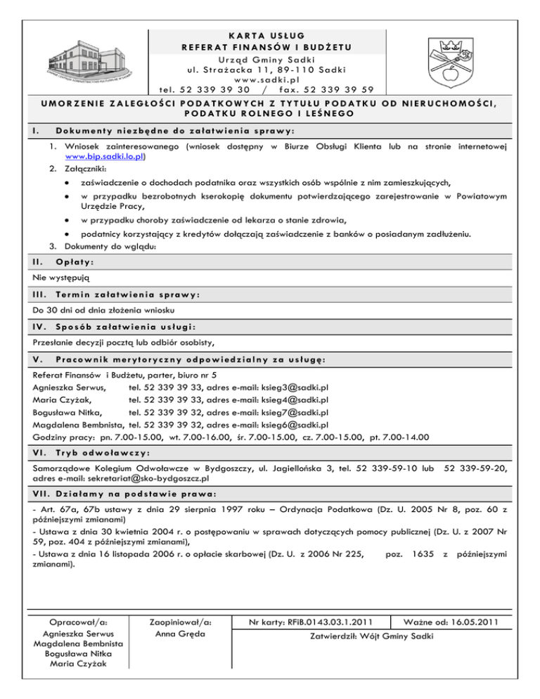 KARTA USŁUG REFERAT FINANSÓW I BUDŻETU U r z ąd G m i n y S a d k i u l . S t r a ż a c k a 1 1 , 89 - 1 1 0 Sa d k i www.sadki.pl t e l . 5 2 3 39 3 9 30 / f a x . 5 2 3 39 3 9 59 UMORZENIE ZALEGŁOŚCI PODATKOWYCH Z TYTUŁU PODATKU OD NIERUCHOMOŚCI, PODATKU ROLNEGO I LEŚNEGO I. D o k u m e nt y n i e zb ę d ne d o z a ł a t w i en i a s pra w y: 1. Wniosek zainteresowanego (wniosek dostępny w Biurze Obsługi Klienta lub na stronie internetowej www.bip.sadki.lo.pl) 2. Załączniki: zaświadczenie o dochodach podatnika oraz wszystkich osób wspólnie z nim zamieszkujących, w przypadku bezrobotnych kserokopię dokumentu potwierdzającego zarejestrowanie w Powiatowym Urzędzie Pracy, w przypadku choroby zaświadczenie od lekarza o stanie zdrowia, podatnicy korzystający z kredytów dołączają zaświadczenie z banków o posiadanym zadłużeniu. 3. Dokumenty do wglądu: II. O p ł a ty : Nie występują I I I . T e r m i n za ła t w i en i a sp r a w y : Do 30 dni od dnia złożenia wniosku I V . S p o s ób z a ła t w ie n ia u s ł u g i : Przesłanie decyzji pocztą lub odbiór osobisty, V. P r a co w ni k m e r yt o ry c z n y o d po w i ed z ia l ny z a u s ł ug ę : Referat Finansów i Budżetu, parter, biuro nr 5 Agnieszka Serwus, tel. 52 339 39 33, adres e-mail: [email protected] Maria Czyżak, tel. 52 339 39 33, adres e-mail: [email protected] Bogusława Nitka, tel. 52 339 39 32, adres e-mail: [email protected] Magdalena Bembnista, tel. 52 339 39 32, adres e-mail: [email protected] Godziny pracy: pn. 7.00-15.00, wt. 7.00-16.00, śr. 7.00-15.00, cz. 7.00-15.00, pt. 7.00-14.00 V I . T r y b o dw o ła w c zy : Samorządowe Kolegium Odwoławcze w Bydgoszczy, ul. Jagiellońska 3, tel. 52 339-59-10 lub 52 339-59-20, adres e-mail: [email protected] V I I . D z i a ł a m y na p o d s ta w i e p ra wa : - Art. 67a, 67b ustawy z dnia 29 sierpnia 1997 roku – Ordynacja Podatkowa (Dz. U. 2005 Nr 8, poz. 60 z późniejszymi zmianami) - Ustawa z dnia 30 kwietnia 2004 r. o postępowaniu w sprawach dotyczących pomocy publicznej (Dz. U. z 2007 Nr 59, poz. 404 z późniejszymi zmianami), - Ustawa z dnia 16 listopada 2006 r. o opłacie skarbowej (Dz. U. z 2006 Nr 225, poz. 1635 z późniejszymi zmianami). Opracował/a: Agnieszka Serwus Magdalena Bembnista Bogusława Nitka Maria Czyżak Zaopiniował/a: Anna Gręda Nr karty: RFiB.0143.03.1.2011 Ważne od: 16.05.2011 Zatwierdził: Wójt Gminy Sadki KARTA USŁUG REFERAT FINANSÓW I BUDŻETU U r z ąd G m i n y S a d k i u l . S t r a ż a c k a 1 1 , 89 - 1 1 0 Sa d k i www.sadki.pl t e l . 5 2 3 39 3 9 30 / f a x . 5 2 3 39 3 9 59 UMORZENIE ZALEGŁOŚCI PODATKOWYCH Z TYTUŁU PODATKU OD NIERUCHOMOŚCI, PODATKU ROLNEGO I LEŚNEGO V I I I . M i e j s c e s k ł a d a ni a w n io s k u / d o ku m en t ó w : Biuro Obsługi Klienta, parter, biuro nr 3 / Sekretariat, I piętro, biuro nr 18 I X . O s o b a do k o n ta k t u: Biuro Obsługi Klienta Alicja Sommertag, parter, biuro nr 3, tel. 52 339 39 65, e-mail: [email protected] X. U w a gi : W przypadku braku kompletu wymaganych dokumentów wnioskodawca zostanie wezwany do ich uzupełnienia. Opracował/a: Agnieszka Serwus Magdalena Bembnista Bogusława Nitka Maria Czyżak Zaopiniował/a: Anna Gręda Nr karty: RFiB.0143.03.1.2011 Ważne od: 16.05.2011 Zatwierdził: Wójt Gminy Sadki