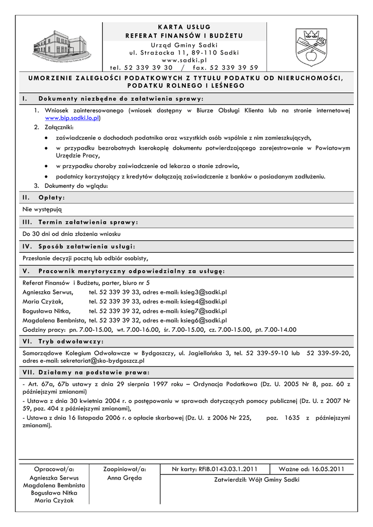 KARTA USŁUG REFERAT FINANSÓW I BUDŻETU Urząd Gminy